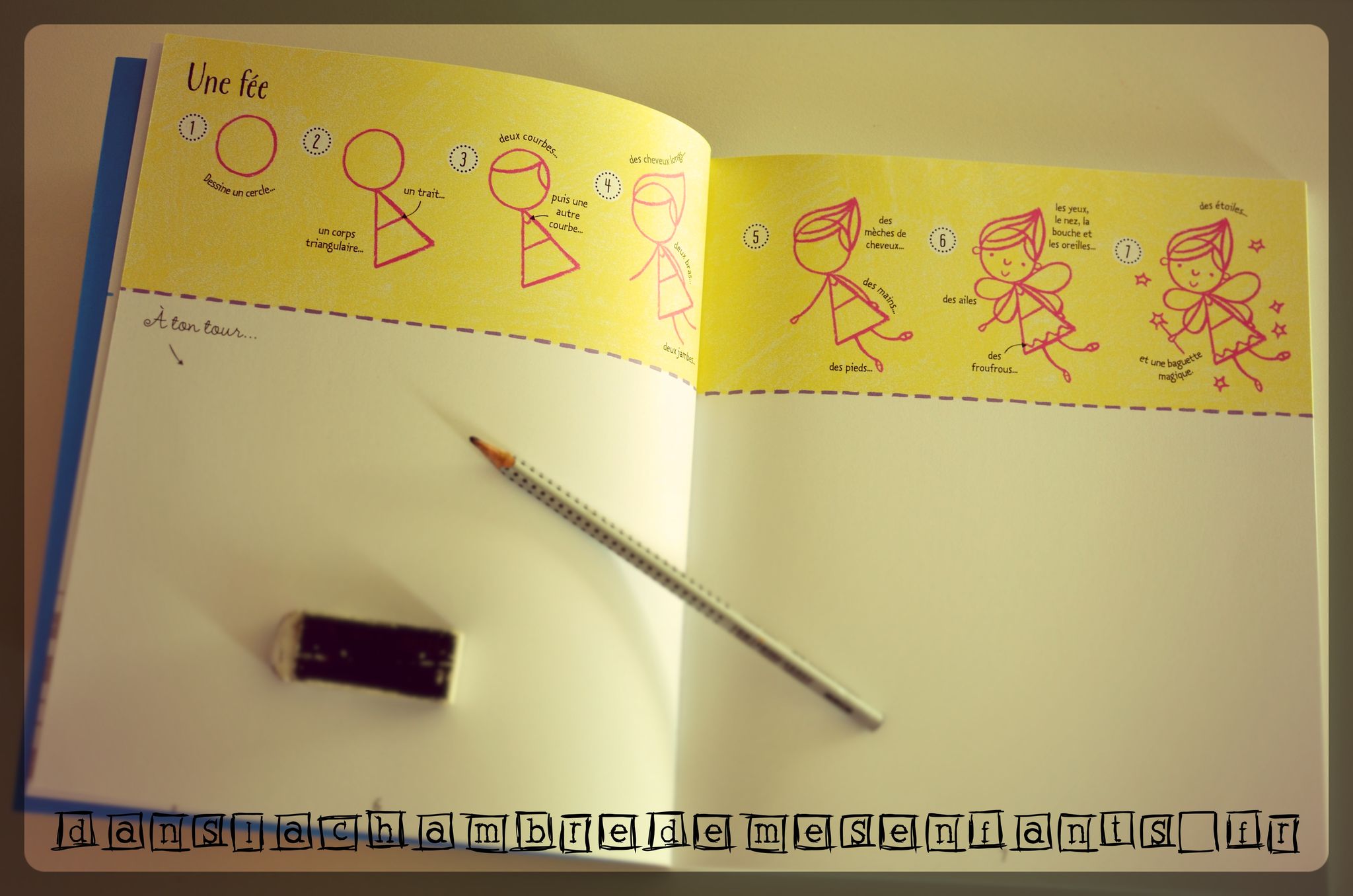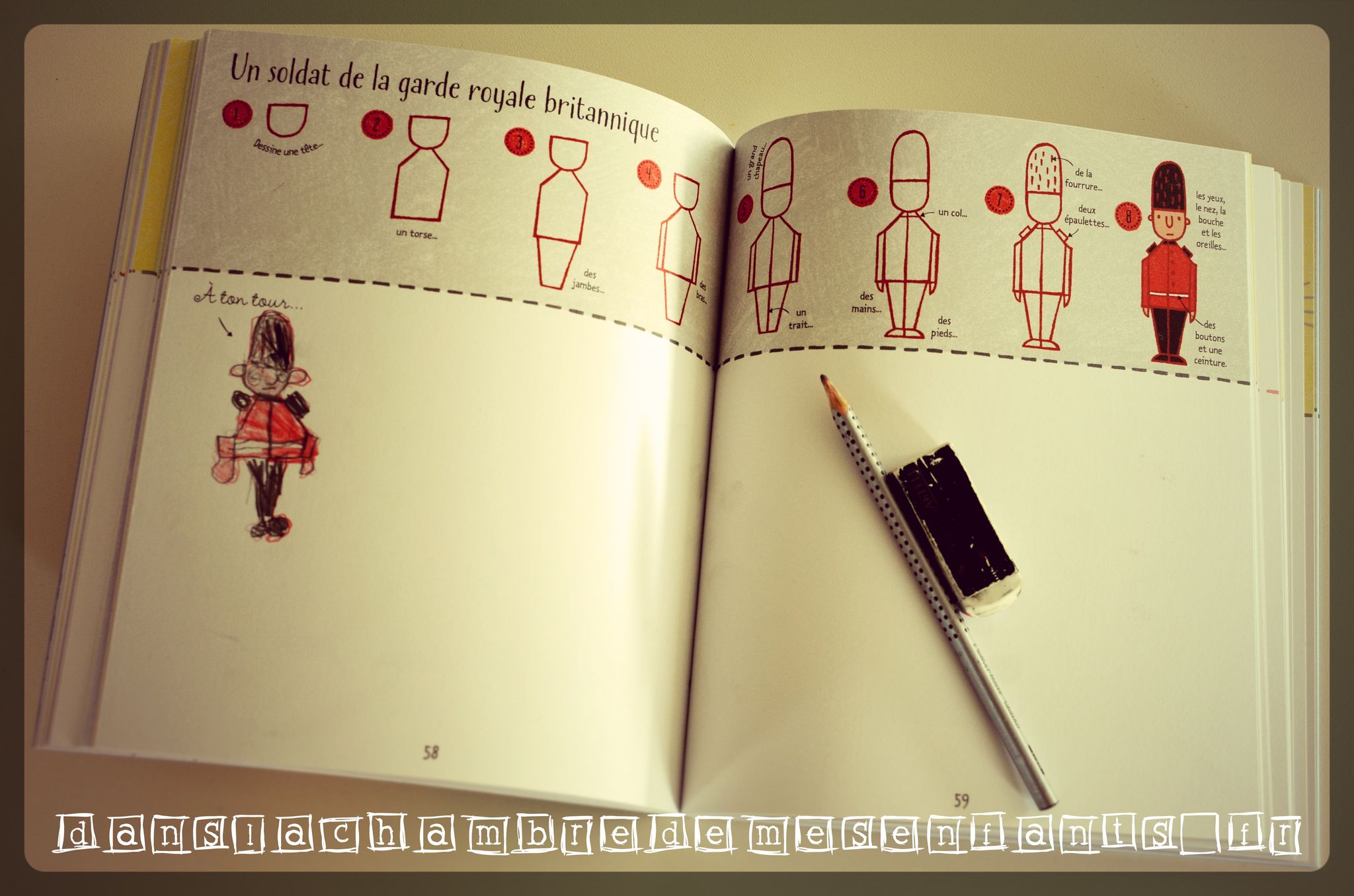Il se présente sous un format de taille moyenne, suffisant pour disposer d’instructions et d’espaces parfois carrément généreux pour se prêter à l’exercice. Le papier est de qualité et il supporte même l’utilisation de feutres. Axé sur le dessin de personnages, il est question de reproduire une figure à chaque double page : en marge, le dessin est décomposé en quelques étapes (8 au maximum) et le reste est réservé au dessin de l’enfant, espace parfois agrémenté d’un bout de décor et d’une astuce pour améliorer le personnage (un mouvement, des détails…). Les nombreuses pages présentent ainsi une sorcière, un pirate, une ballerine, une momie, un chanteur, un super-héros, un espion… toujours avec des traits simples, même si les détails d’un motif de vêtement, d’une barbe, d’un accessoire… (en dernière étape) peut apporter un petit niveau de difficulté supplémentaire.