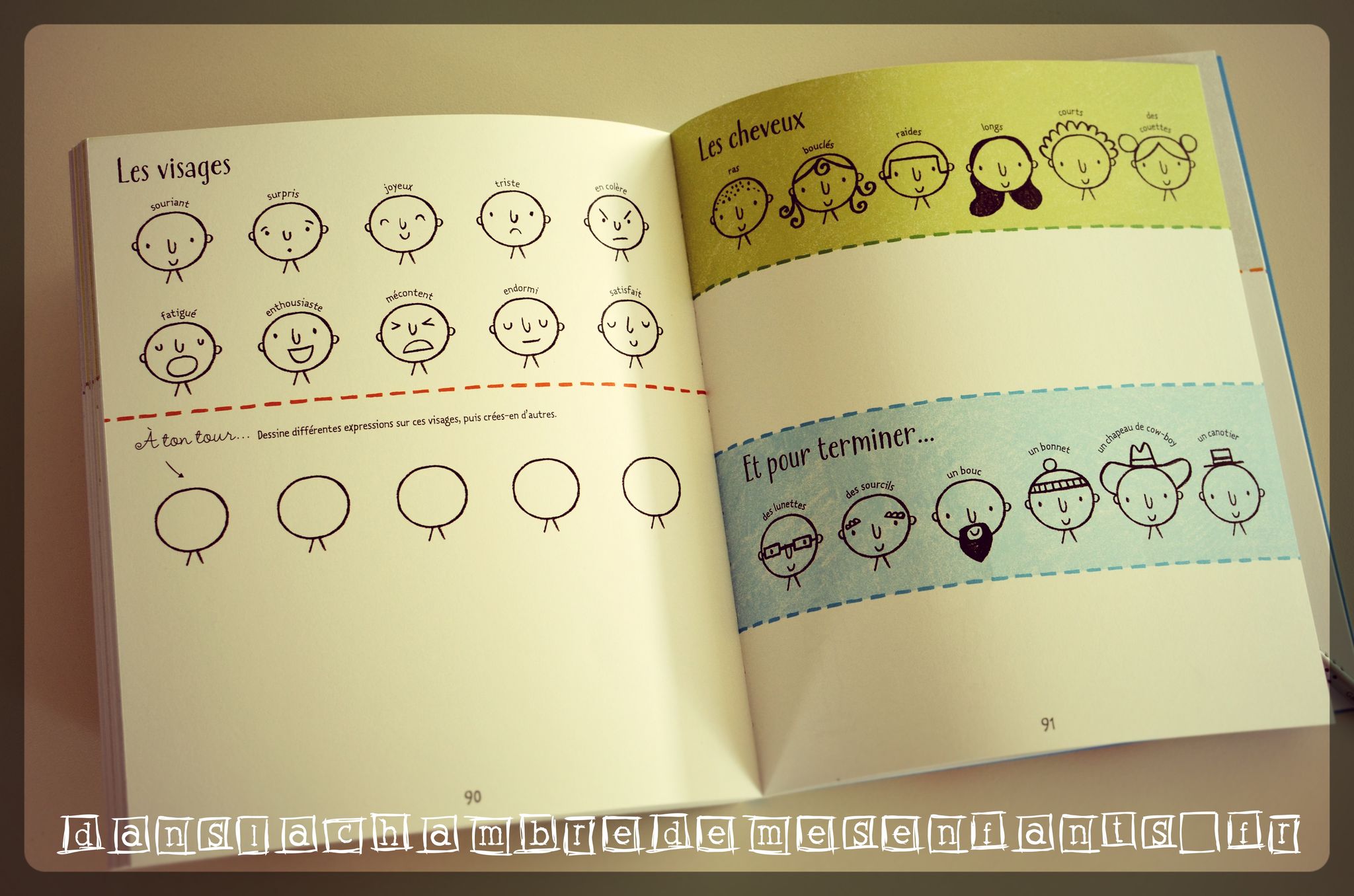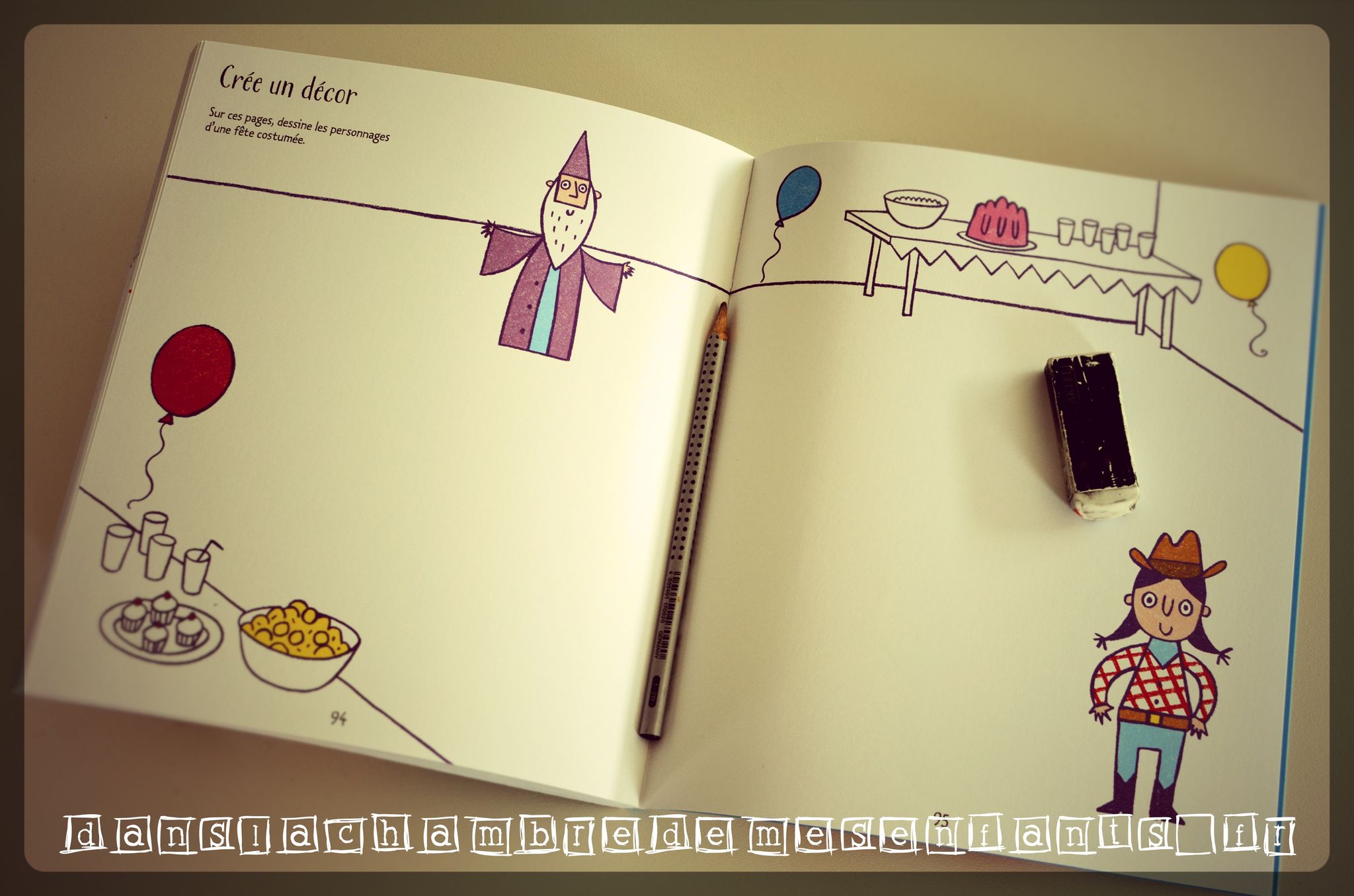 L’avis des enfants : Alex a tourné autour mais le fait qu’il y ait encore des instructions, ça ne le tentait pas trop (il en a toute la journée à l’école alors bon ! Il a son petit caractère !). Mais, je voyais bien qu’il l’intriguait. J’ai donc pris le temps de lui montrer et, ce qui a été décisif, c’est la double page à compléter pour réaliser une scène de fête costumée. Pour ce faire, il lui fallait bien s’intéresser aux premières pages qui apprennent à faire lesdits personnages. Ni une ni deux, je l’ai retrouvé crayon à la main et il a enchaîné les dessins. Il a pris réellement du plaisir et il a remarqué que les dessins étaient à sa portée (alors c’était ça son hésitation du départ : la crainte de la difficulté !). Il a d’ailleurs été étonné de constater que de simples ronds, rectangles… devenaient rapidement des personnages, pourtant tous différents.