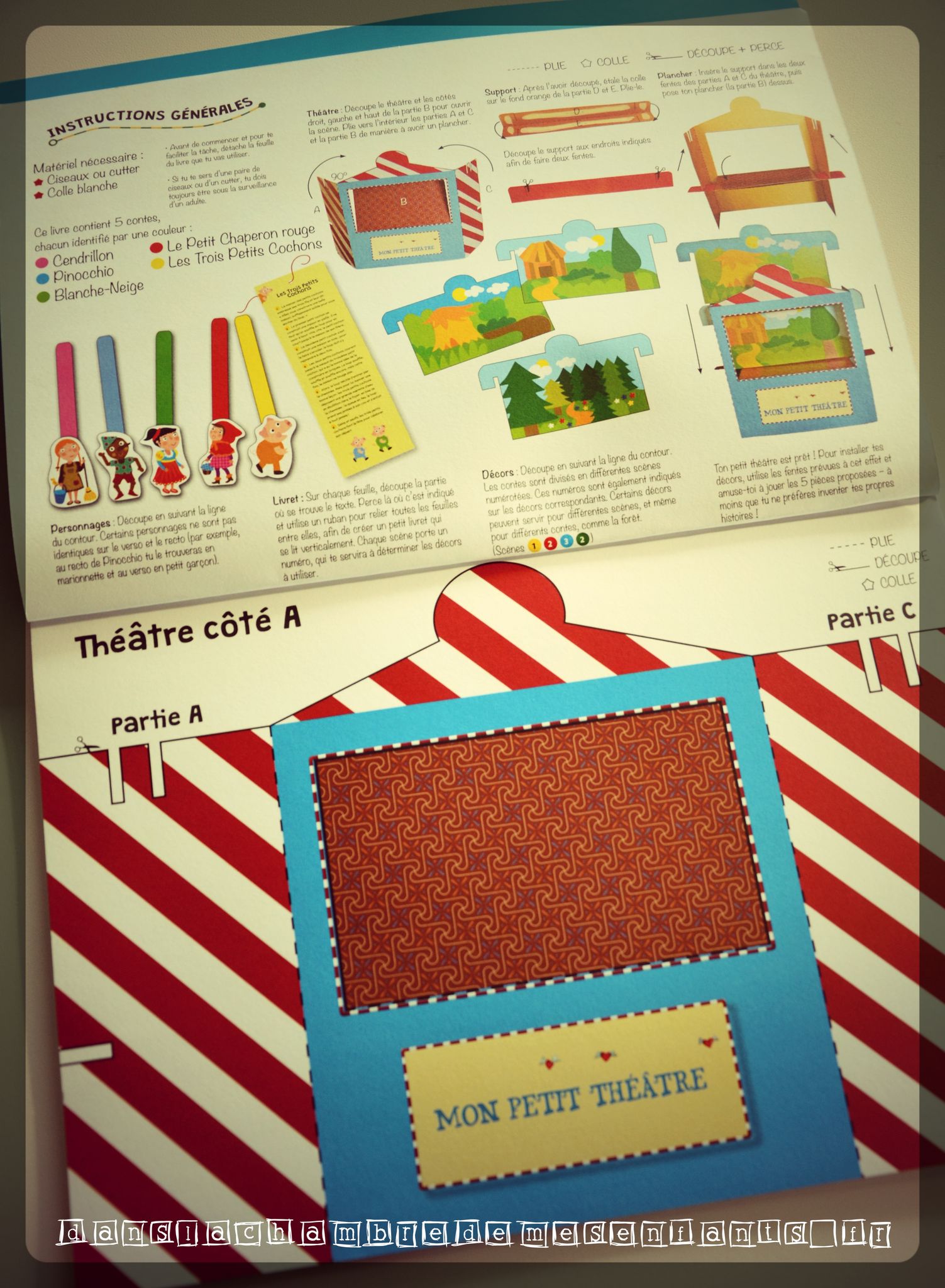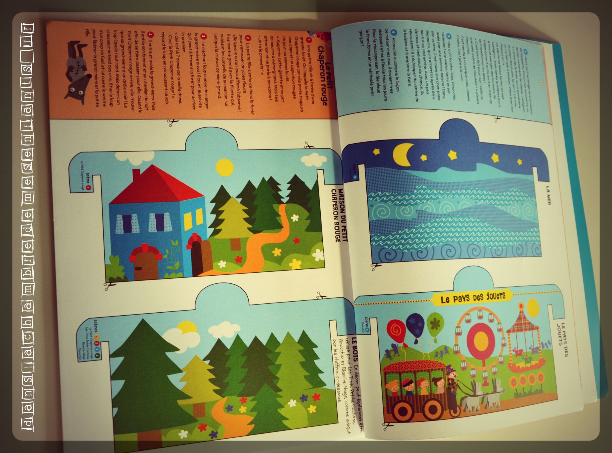 Commençons par son format : un grand carnet avec, en introduction, quelques brèves instructions d’utilisation puis des pages à découper pour monter le petit théâtre, et constituer les histoires avec leurs textes, leurs décors et leurs personnages. Ces deux derniers sont repérés par le titre du conte, et les décors portent aussi le numéro du paragraphe, auquel il se réfère, pour permettre de suivre la lecture.