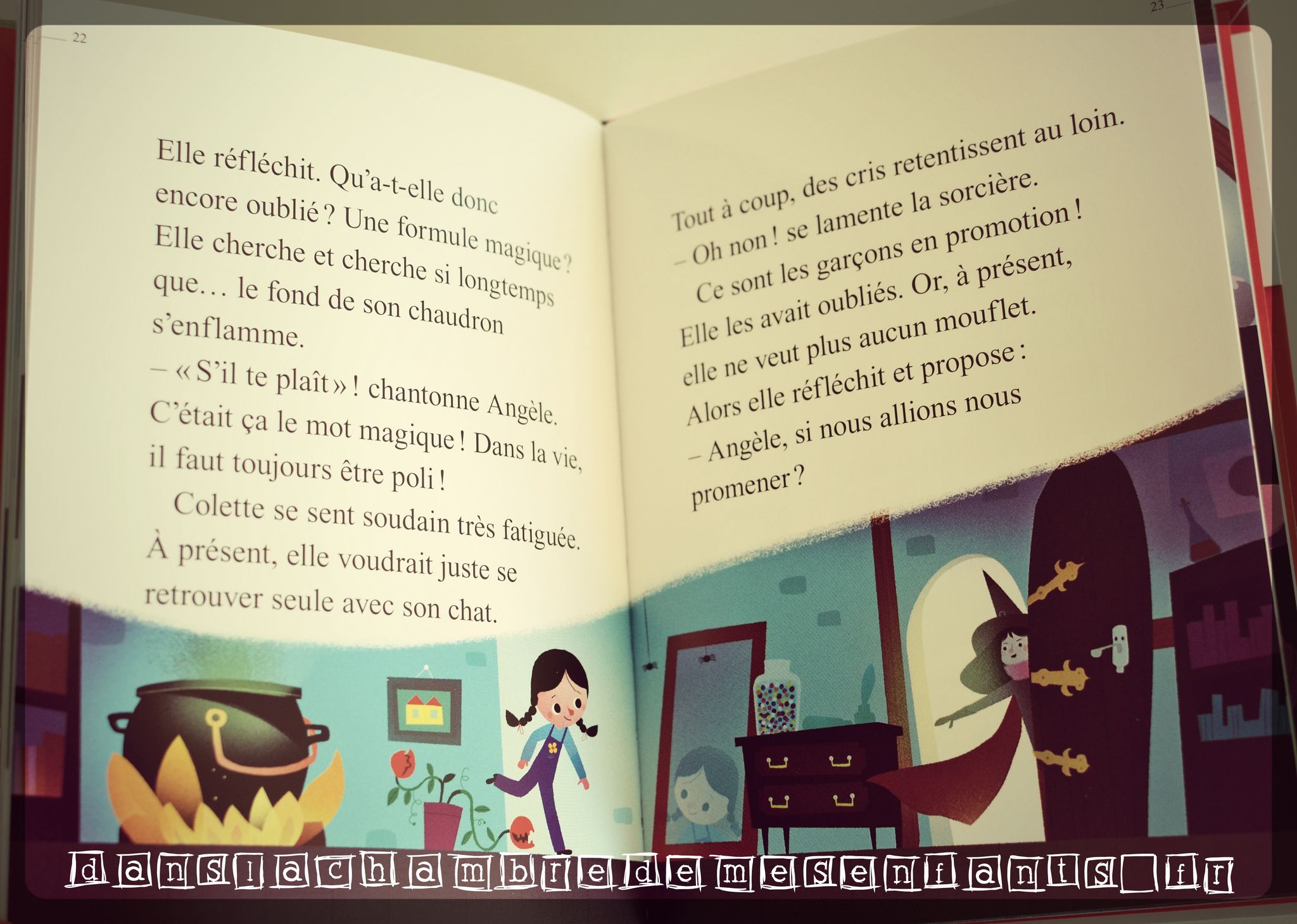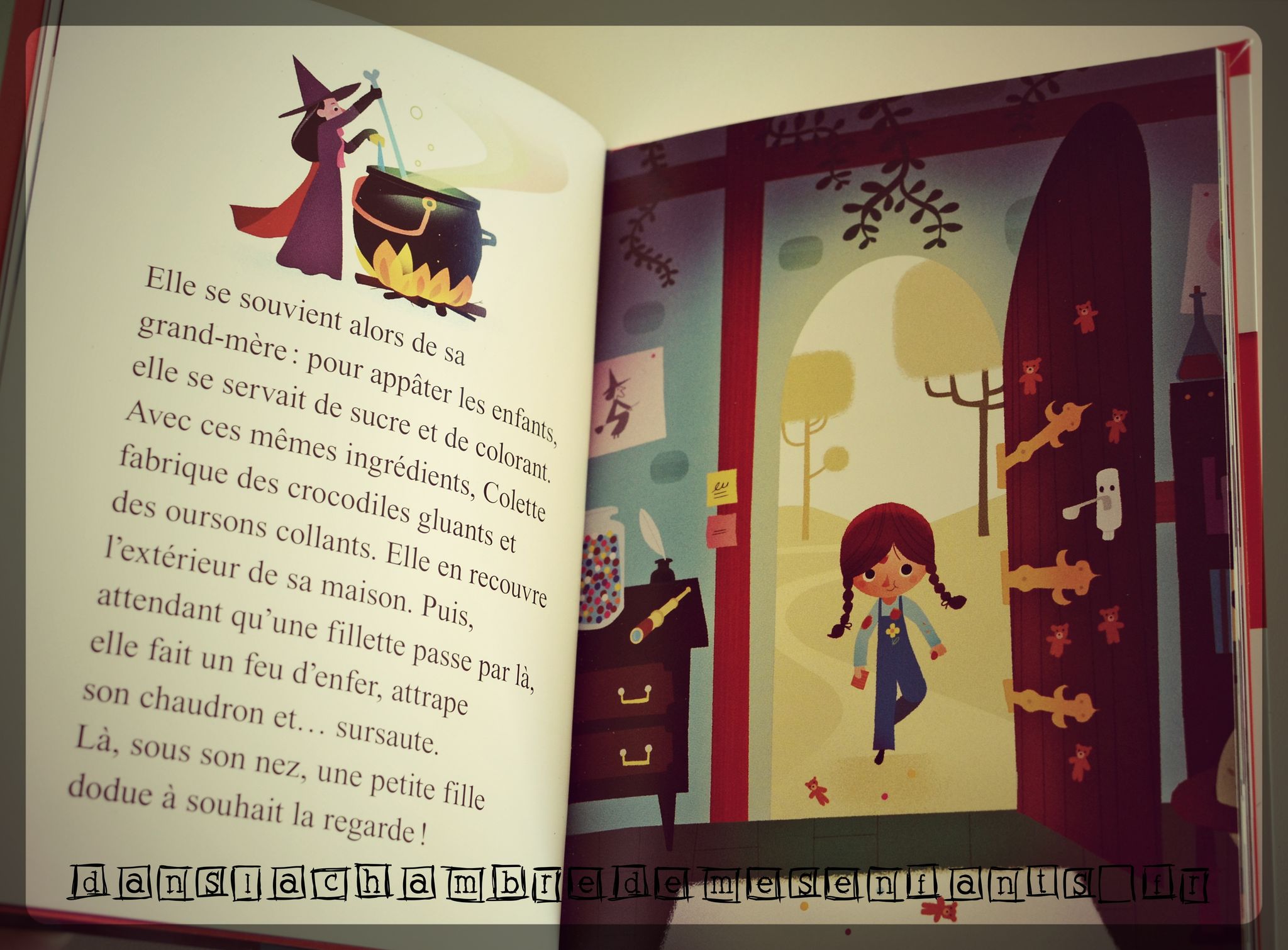 Ce petit livre est très bien présenté : un joli papier glacé, beaucoup d’illustrations très colorées et une mise en page dynamique. De quoi séduire, au premier contact, les jeunes lecteurs. Malgré son sujet, ce livre n’a pas de quoi faire peur : avec ses gros caractères et une histoire écrite simplement (sans besoin de lexique) les enfants comprennent vite que ce livre est agréable à lire. Quant au sujet : une histoire de sorcière et de recette TOP secrète, et, ça, ça les intrigue. Ils ont bien raison : voici Colette une sorcière moderne qui commande ses ingrédients via sa boule de cristal comme on navigue sur le web ! Pour honorer sa commande, il lui faut appâter une petite fille. Elle fabrique donc des bonbons gélifiés et en recouvre l’extérieur de sa maison. Mais, la petite fille attrapée prend le dessus et l’arrivée d’un ogre ni changera rien.