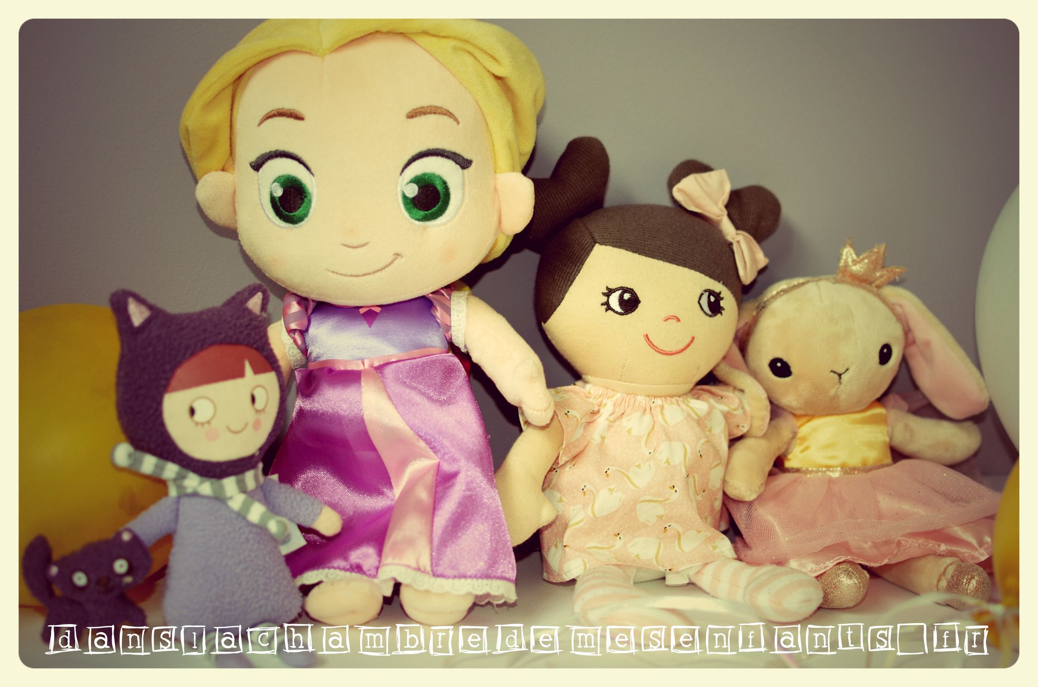 Dans la chambre de ma fille, on trouve ses premières poupées de chiffon : la petite Ninon de TROUSSELIER à 22,90 € dont le modèle change régulièrement (attention aux ruptures de stock), la grande poupée Raiponce de DISNEY à 18,90 € que vous trouverez en plusieurs modèles (dont Ariel qui figure plus bas), et deux poupées de H&M à 9,99 € qui ne sont déjà plus en vente car leurs modèles sont limités (le principe qui fait le succès de cette marque).