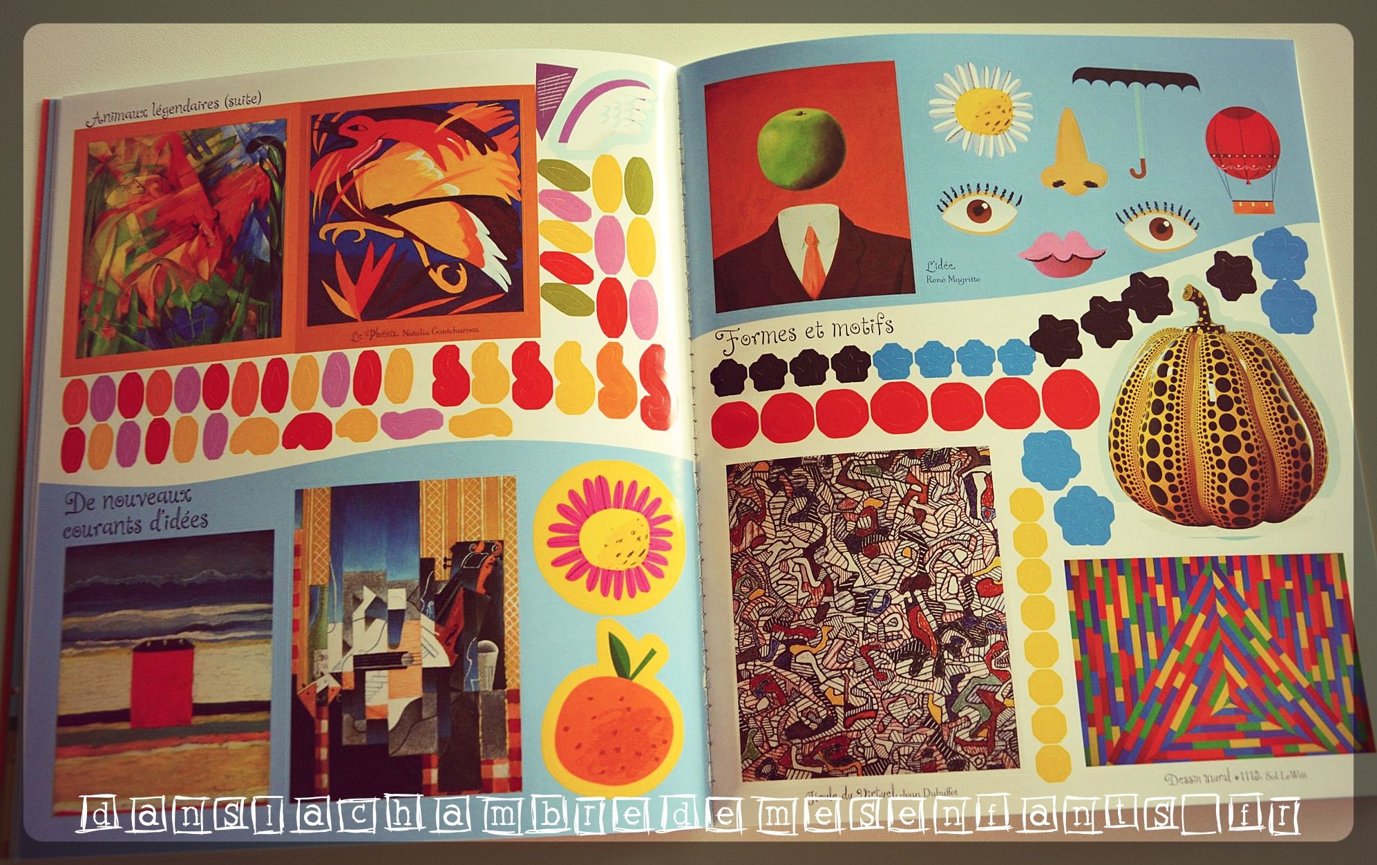 Ce petit livre broché tout simple est en fait une vraie introduction à une visite de galerie. Il est très structuré : chaque double page présente un sujet (« Le portrait », « L’art du quotidien », « Les enfants »…) avec une présentation brève pour le situer dans l’histoire de l’art. Puis, on y trouve des miniatures d’œuvres célèbres, dont le jeu consiste à y positionner l’autocollant représentant la même œuvre. En-dessous, figure son titre, son artiste et son origine (date et lieu). Le contraste avec le reste des illustrations des pages est un pont vers l’enfant : un cadre de galerie avec des visiteurs sont représentés comme certains livres pour enfants (dans un style actuel) et des bulles permettent d’intégrer des commentaires de ces visiteurs (ex : « Le ciel orageux semble aussi dangereux que le tigre tapi prêt à bondir » ou encore « Si tu regardes attentivement, tu remarqueras une guitare et un violon peints sous divers angles ») ou des invitations à compléter les œuvres grâce aux autocollants (ex : « Ajoute des autocollants ici pour composer ton propre portrait avec des fruits »).