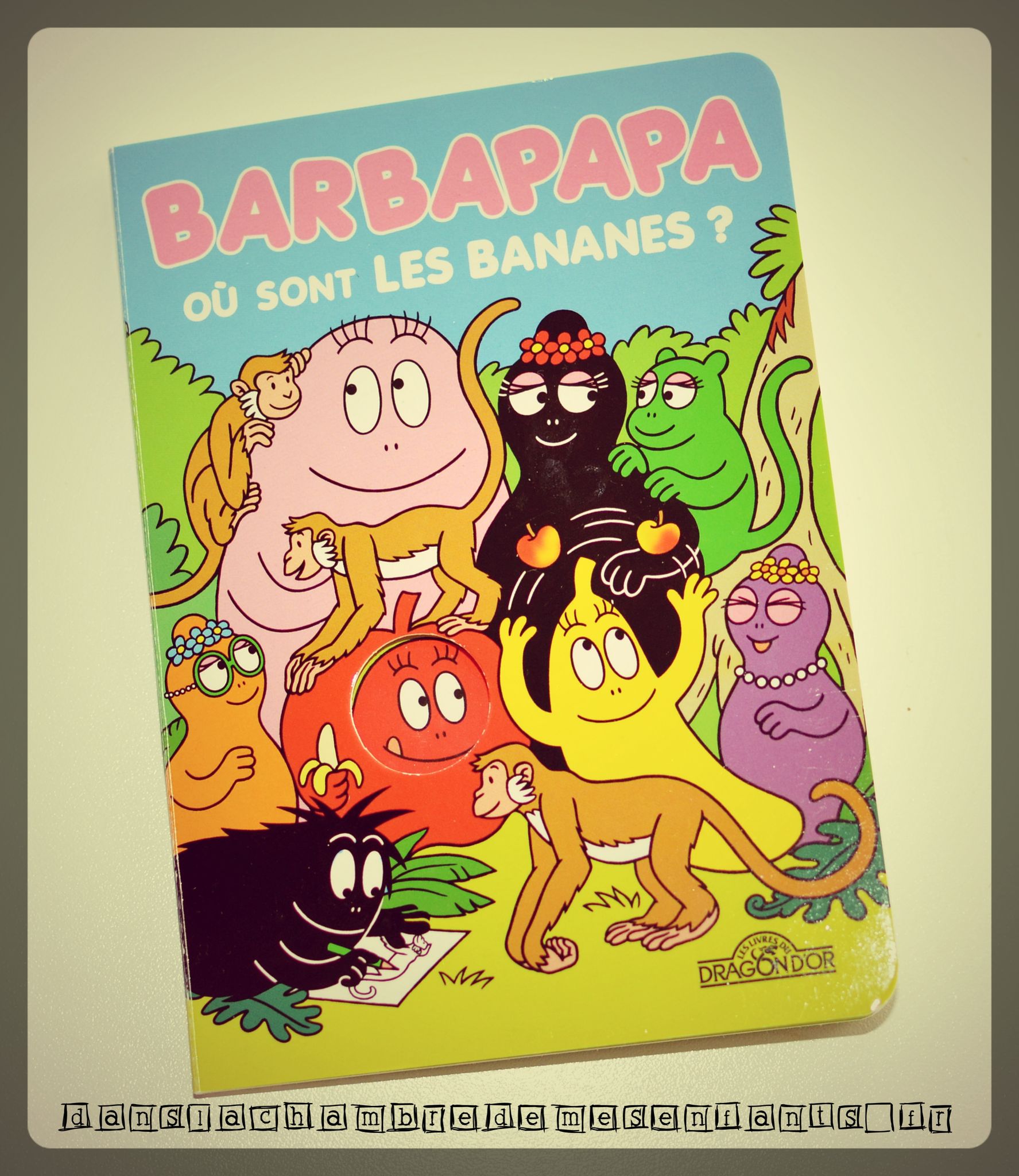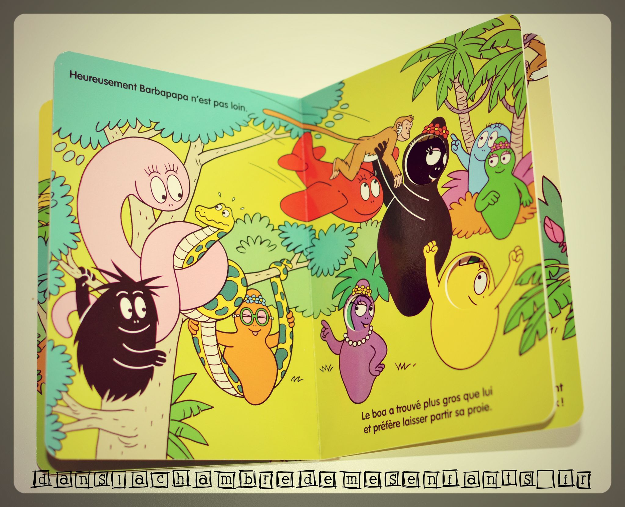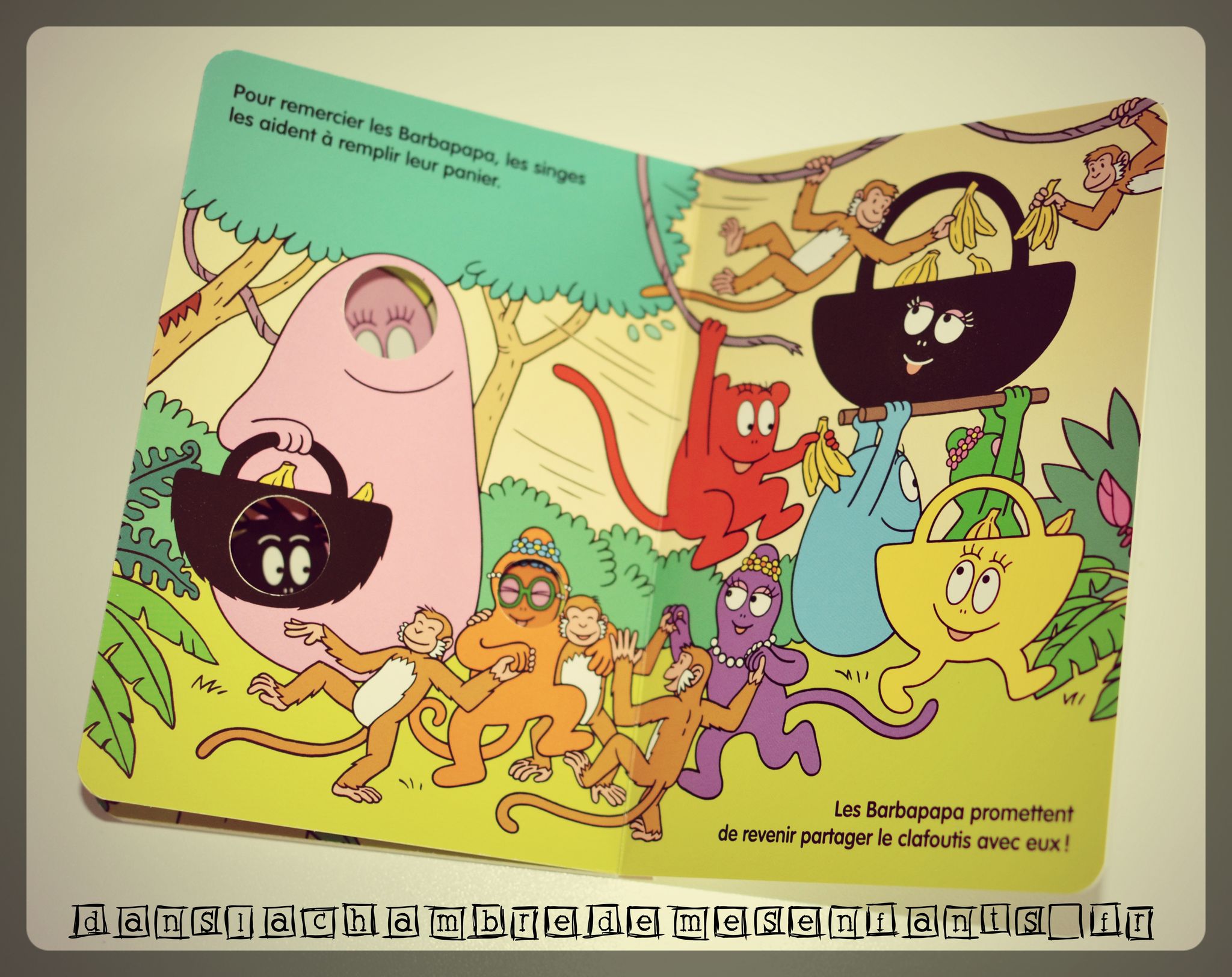La famille part sous les tropiques pour cueillir des bananes mais le voyage sera plus mouvementé et les Barbapapa aideront des singes qui deviendront leurs amis. Ils se transformeront en panier, en singe, en avion… et, ici encore, les trous des pages, ne laissant apparaître que leurs visages, permettent de les voir se transformer en suivant la lecture.