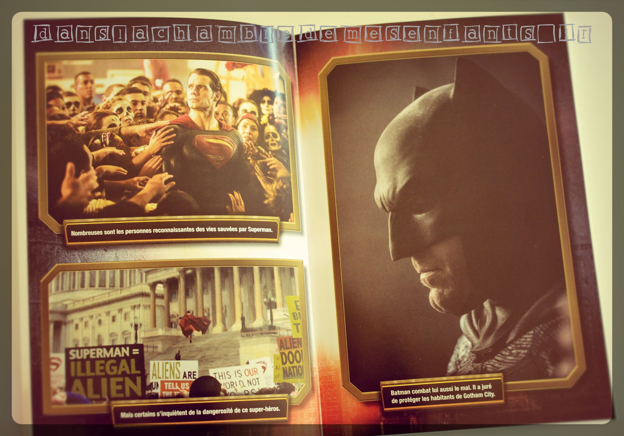 Dans cet ouvrage, la lecture n’est pas illustrée au fur et à mesure : il s’agit d’un vrai roman que, même en tant qu’adulte, j’ai apprécié et je l’ai trouvé très bien écrit. Tout de même, 8 pages de photographies du film ont été regroupées en milieu de lecture : une exclusivité en ce jour de sortie de « Batman v Superman : l’aube de la justice ». Je le conseille à partir de 8 voire 9 ans.