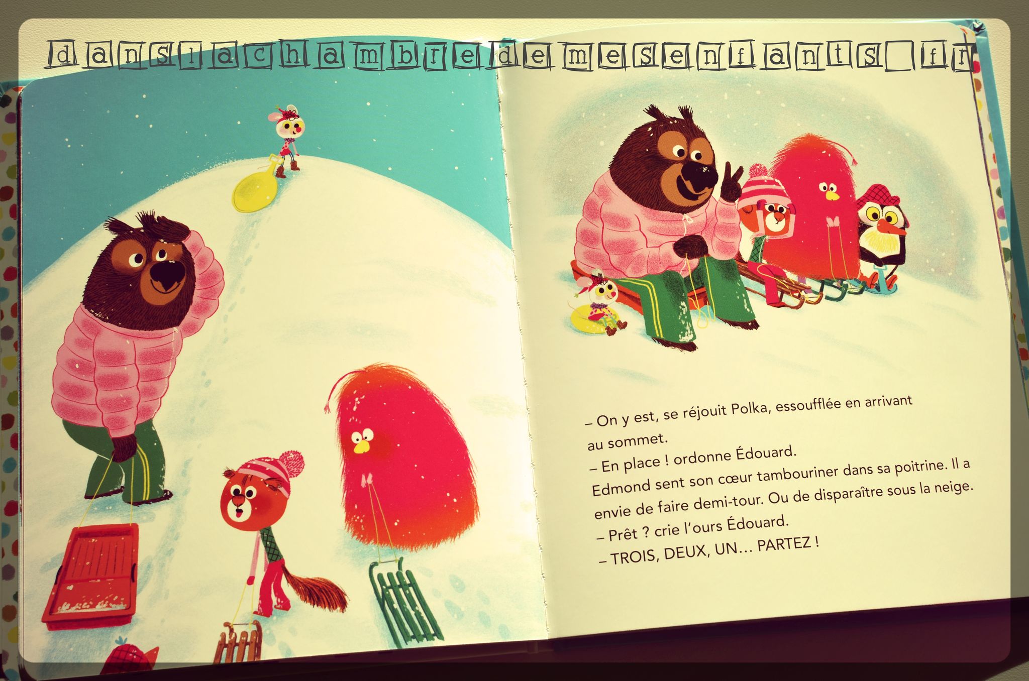 Dans ce nouvel ouvrage, la journée commence par « le silence des jours de neige » (ça vous parle n’est-ce-pas ?!) et une course de luges se prépare. Celui qui s’annonce grand gagnant, avant même le départ, ne sera peut-être pas le vainqueur mais, ce n’est pas le plus important après tout car… on fera une course de ski !