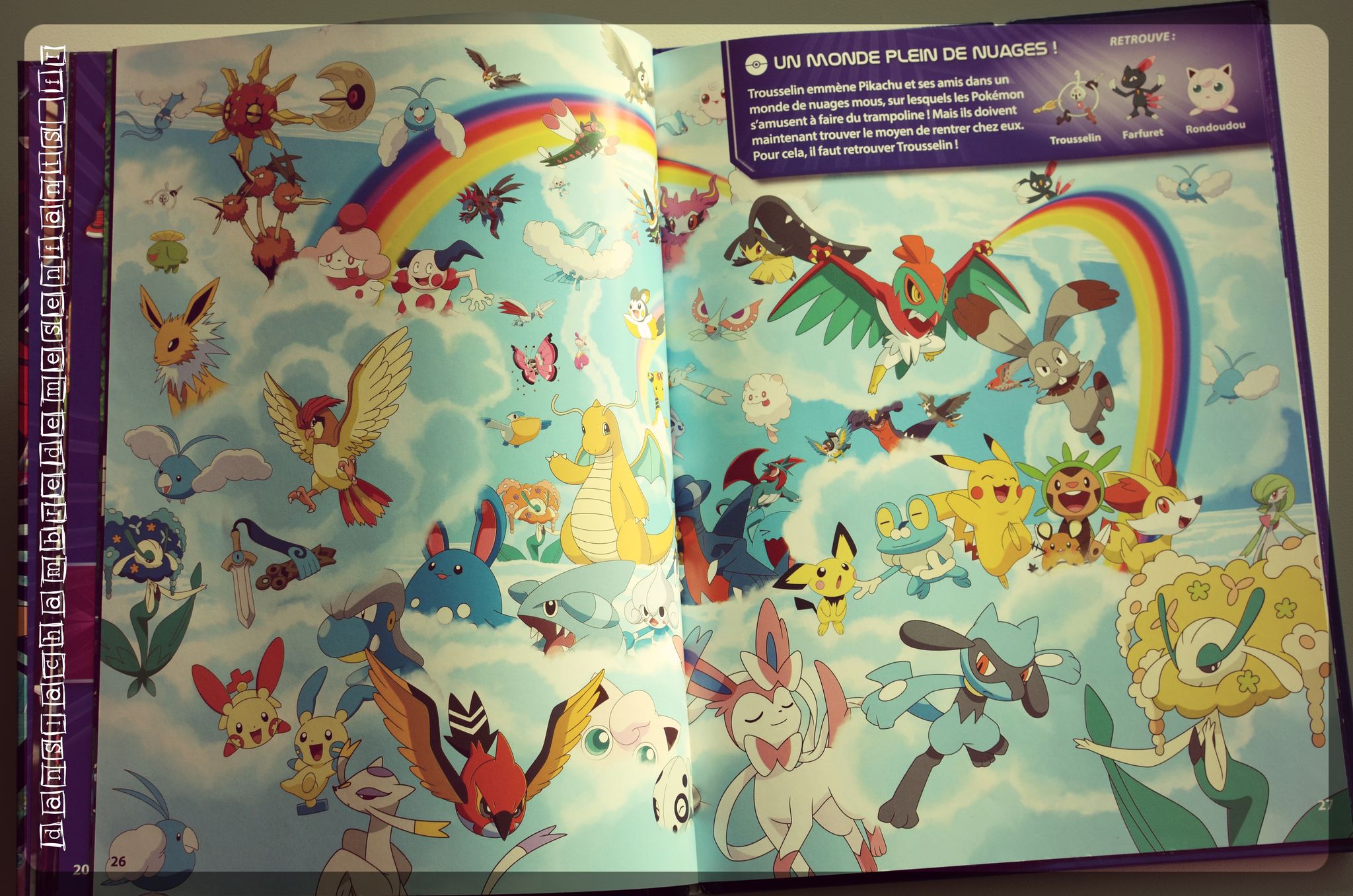 Ce livre, broché au papier glacé, présente un grand jeu de « cherche trouve » à travers de grandes illustrations remplissant des doubles pages. De quoi se familiariser, pour certains, avec les Pokémons bien connus mais aussi avec les nouveaux venus. Un dernier jeu d’observation clôture le livre, juste avant la page des solutions 😉