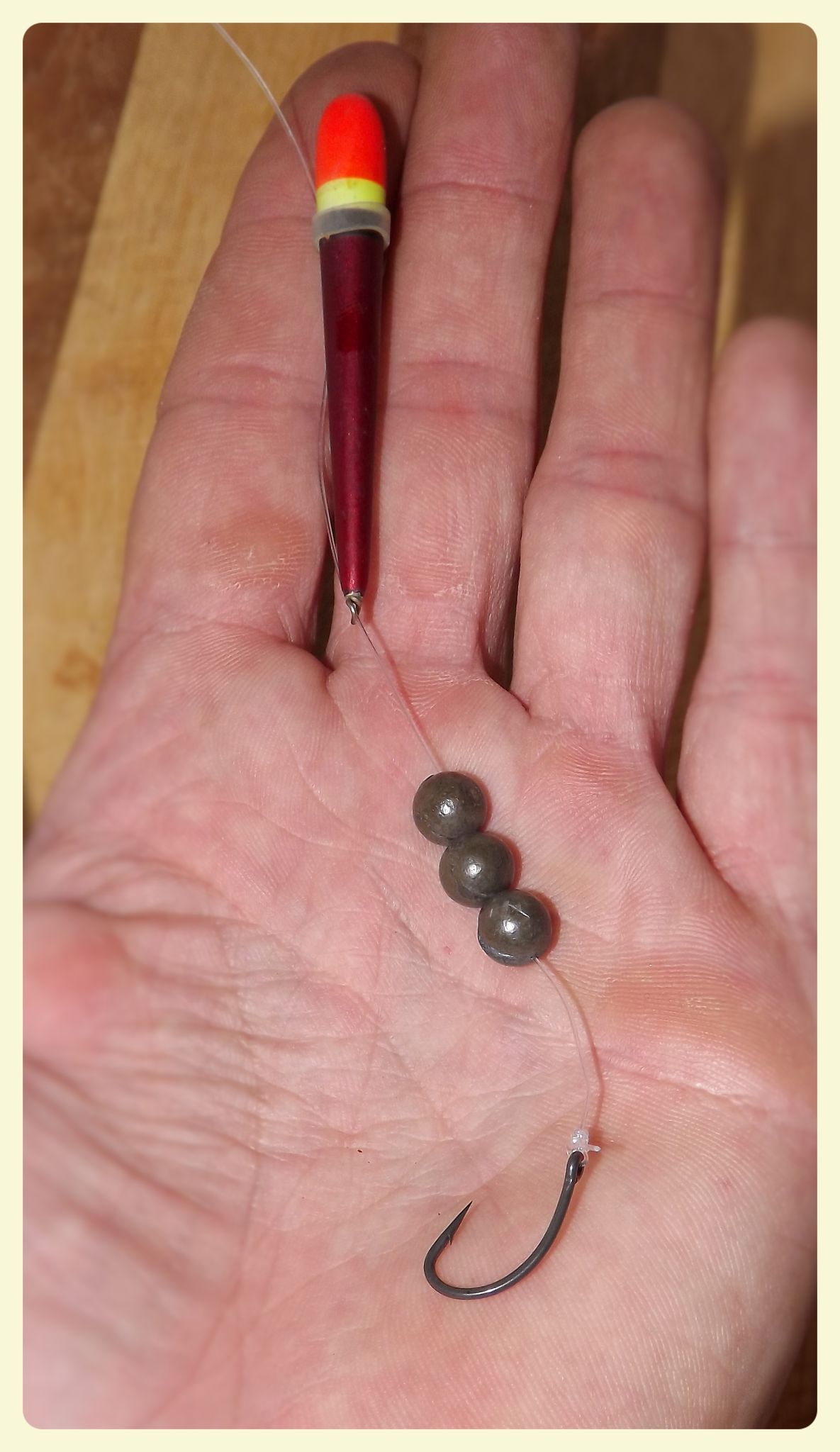 « C’est pourquoi faire la farine ? ? ? » demanda Julien. Sagement, son papi répondait : « C’est pour attirer les poissons à l’endroit où l’on va pêcher. » Il reprenait : « On va la mouiller avec un petit peu d’eau pour faire une pâte, en faire des petites boules et les jeter dans l’eau. Les petits poissons viendront se nourrir et on pourra les attraper. » « A la main ? » demandait innocent le petit garçon. « Mais non, avec la canne et la ligne ! » répondait l’Ancien. « – Mais qu’est ce que c’est la ligne ? – La ligne c’est le fil que l’on attache au bout de la canne à pêche. Sur ce fil, on attache un bouchon* (ou flotteur), quelques plombs* et un hameçon*. Mais attention ! Un hameçon ça pique et on peut se faire mal. »