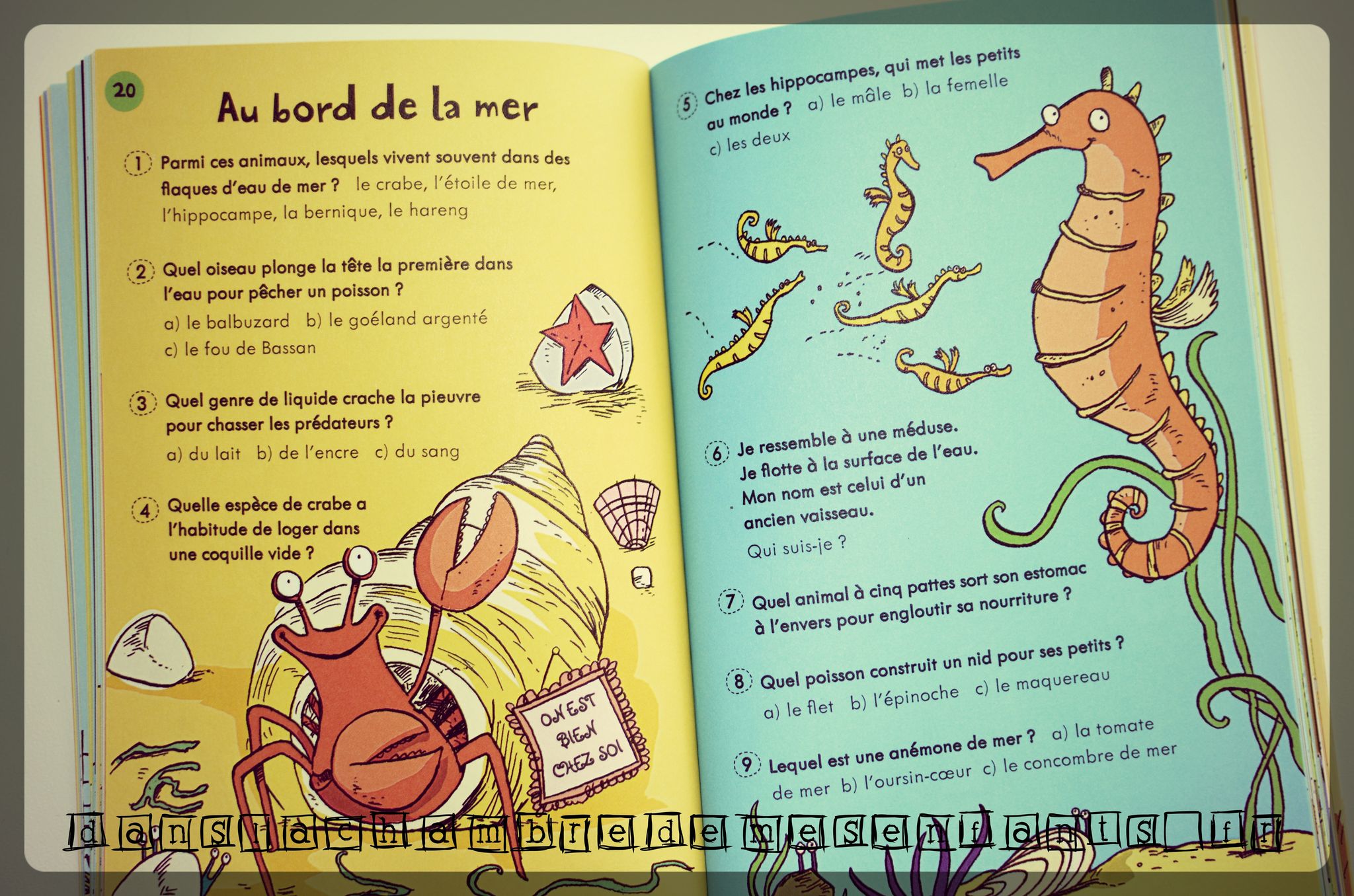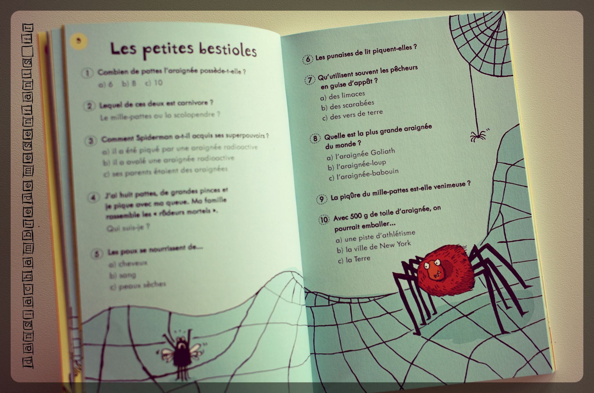 Un conseil ? Armez-vous rapidement d’un marque-page pratique car les enfants sont vite intéressés et ils ne s’arrêteront pas uniquement à la lecture de quelques questions et les vas-et-viens seront fréquents. Bien sûr, à partir de 6 ans, les enfants peuvent s’en amuser en toute autonomie. A partir de 5 ans, les enfants se prêtent au jeu même si certaines questions, comme celles avec des repères géographiques, ne peuvent leur être accessibles. Le sujet et la forme les intéressent et cela a provoqué de nombreuses occasions d’être ensemble.
