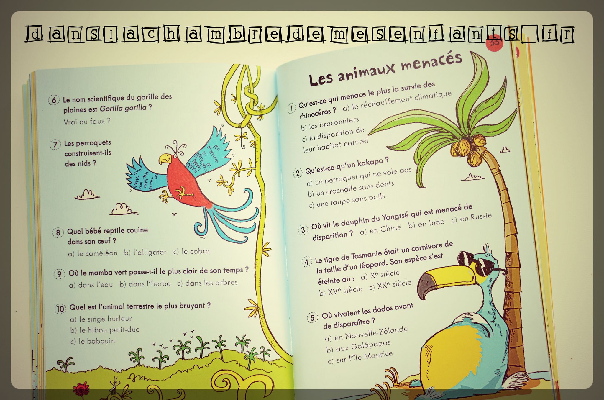 L’avis des enfants : Alex a été curieux de connaître rapidement de quoi il s’agit : tout d’abord, car, depuis ses 4 ans, il adore les jeux d’énigmes et de questions-réponses, puis, parce qu’il s’agit d’animaux (dont des dangereux et des bizarres… chouette !). On a passé de longs moments (vite passés en fait) à y « jouer » et, à chaque fois, le plus difficile était, pour Alex, d’arrêter. Pour l’anecdote, ces derniers jours, mon fils a fait deux tours aux urgences et, durant les longues heures d’attente, toute l’attention a été attirée par cet ouvrage qui nous a bien divertis (il ne pouvait pas mieux tomber… le livre bien sûr, pour Alex ça a été une autre histoire).