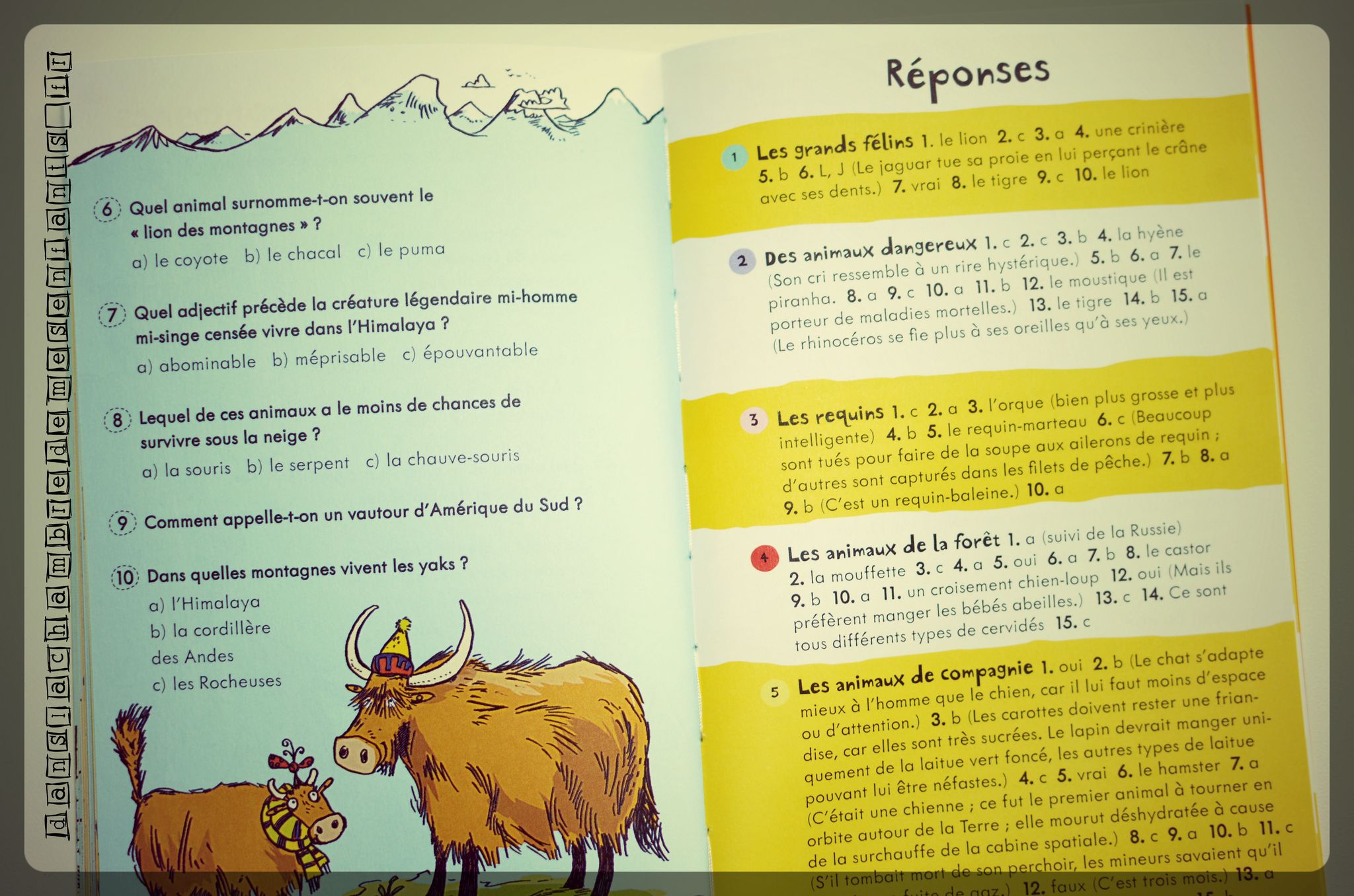 Vous l’aurez compris : il s’agit de découvrir les animaux à travers un jeu de « questions-réponses » mais de quel type ? au sujet de quels animaux ? et comment se présente-t-il ? Le plus simplement pour un programme pour le moins chargé : 47 thématiques (les poissons, les singes, les grands félins, les petites bestioles, dans la nuit…) pour plus de 500 questions (« Comment appelle-t-on un groupe de singes ? » « Un dauphin peut-il se reconnaître dans un miroir ? » « Lequel est une anémone de mer ?« …). Il s’agit de répondre en choisissant l’une des réponses proposées, ou par oui ou non, parfois même les questions sont ouvertes et, de temps à autres, il s’agit d’une devinette. Les thèmes sont numérotés et il en est de même pour les questions qui s’y rapportent. Les sujets se suivent et, en fin d’ouvrage, les réponses sont données bien évidemment dans l’ordre numérique des thèmes.