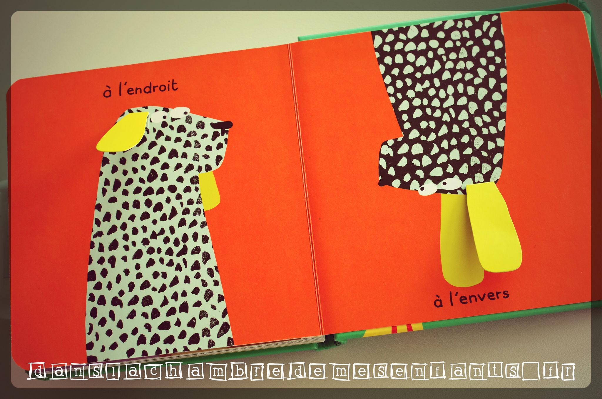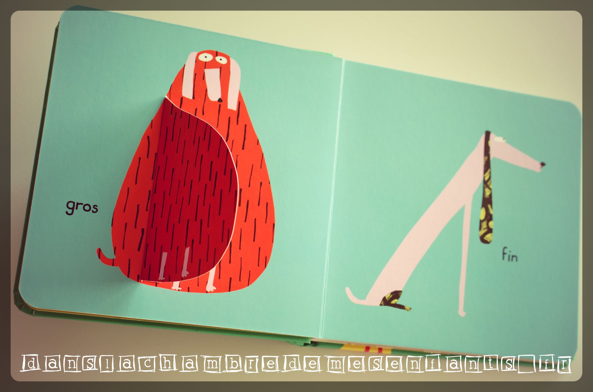 Les livres sur les contraires sont des incontournables dans l’apprentissage des tout-petits. Celui-ci a du (chien) style et une façon originale et dynamique de présenter le sujet.