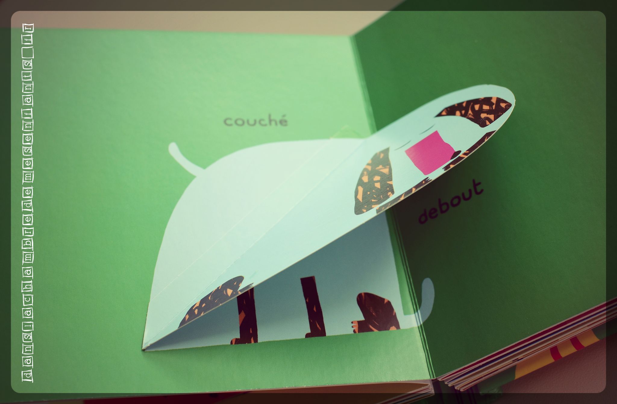 Les contraires sont animés par des jeux de volets parfois dépliants, transformant ainsi une scène très simplement. On découvre un chien « gros » devenant « très gros », « court » devenant « long » mais aussi de « debout » passant à « assis », de « devant » à « derrière », de « dehors » à « dedans »… Les jeux d’animation ne manque pas d’imagination et apporte une touche supplémentaire d’originalité.