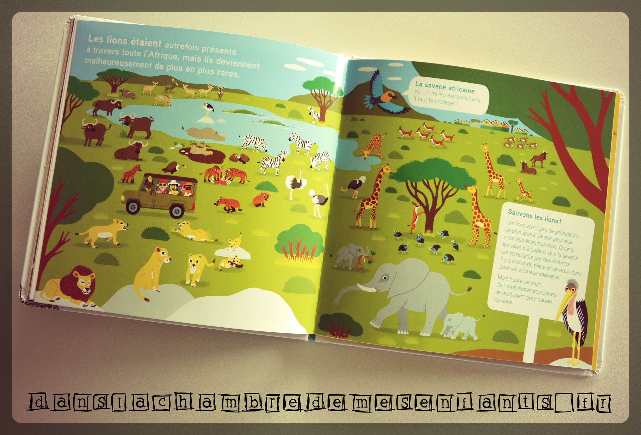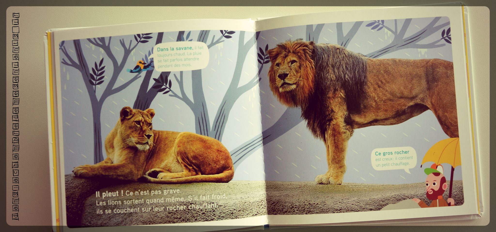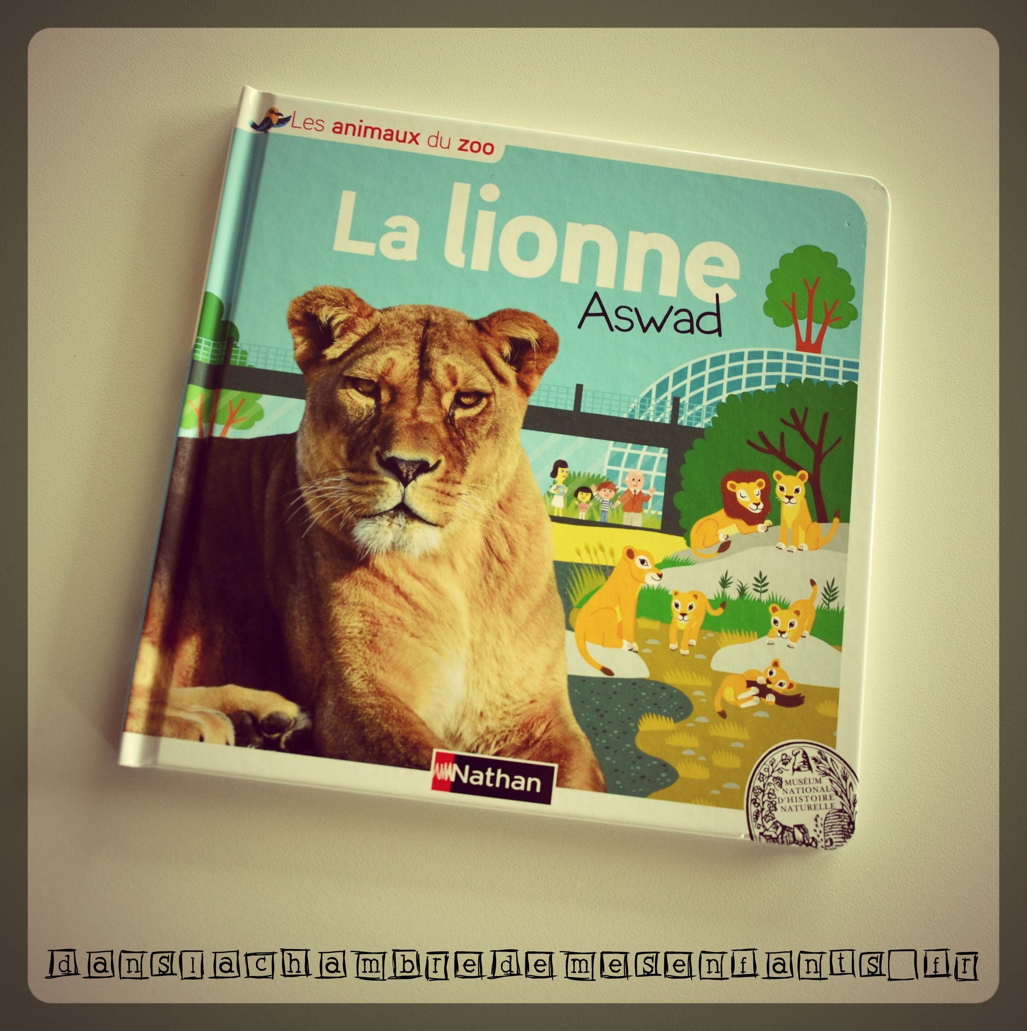 Cette lionne de 8 ans vit avec ses sœurs et un mâle. On fait plus amples connaissances avec elle car on découvre son comportement et ses besoins ainsi que les moyens qui sont mis à sa disposition pour son épanouissement. On fait connaissance avec ses petits et on les suit lors de la première visite médicale, de leur première sortie et un peu plus encore. Enfin, une double page est consacrée à la présentation de la savane et une explication quant à l’extinction progressive de l’espèce afin de sensibiliser les enfants.