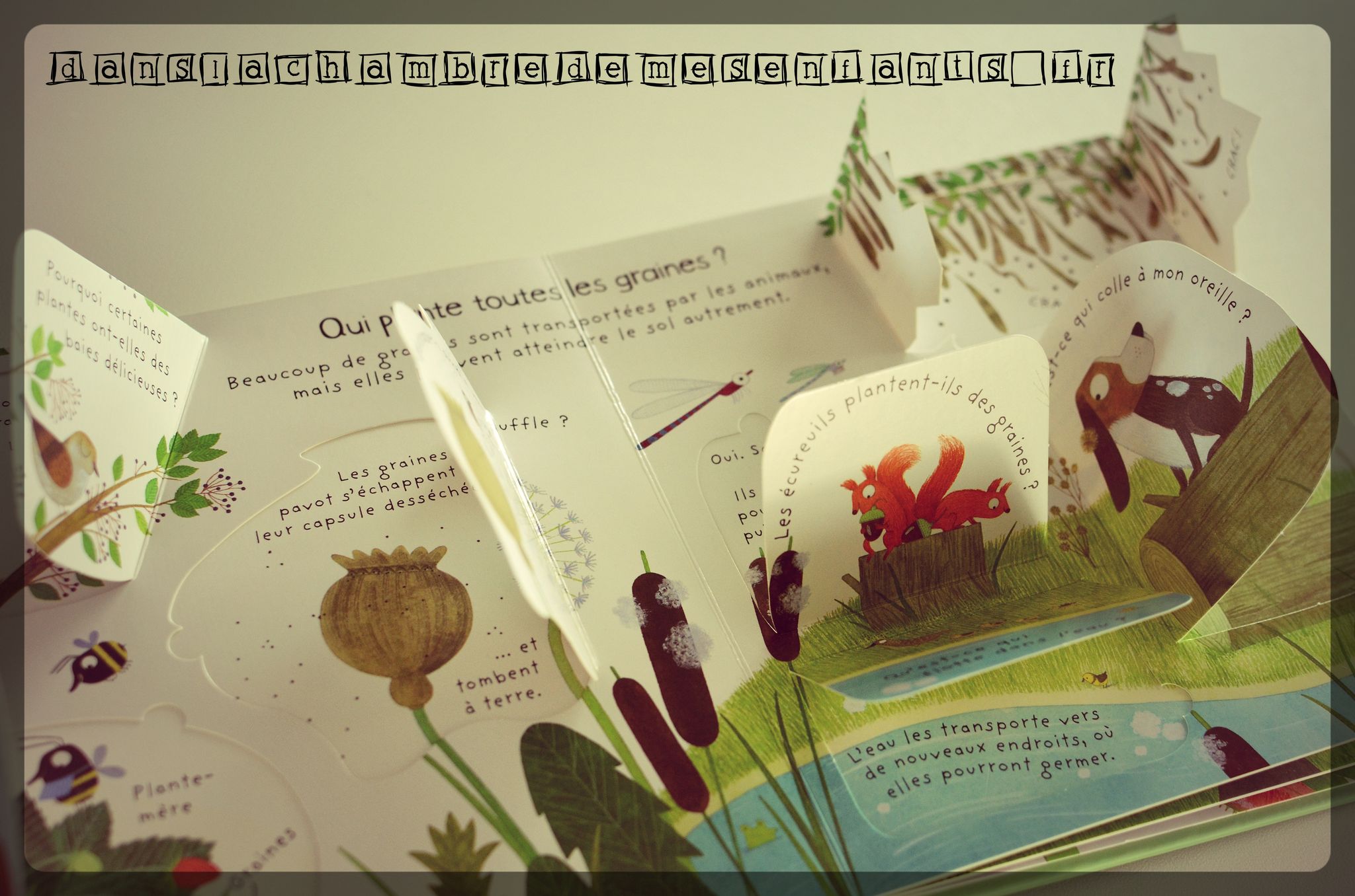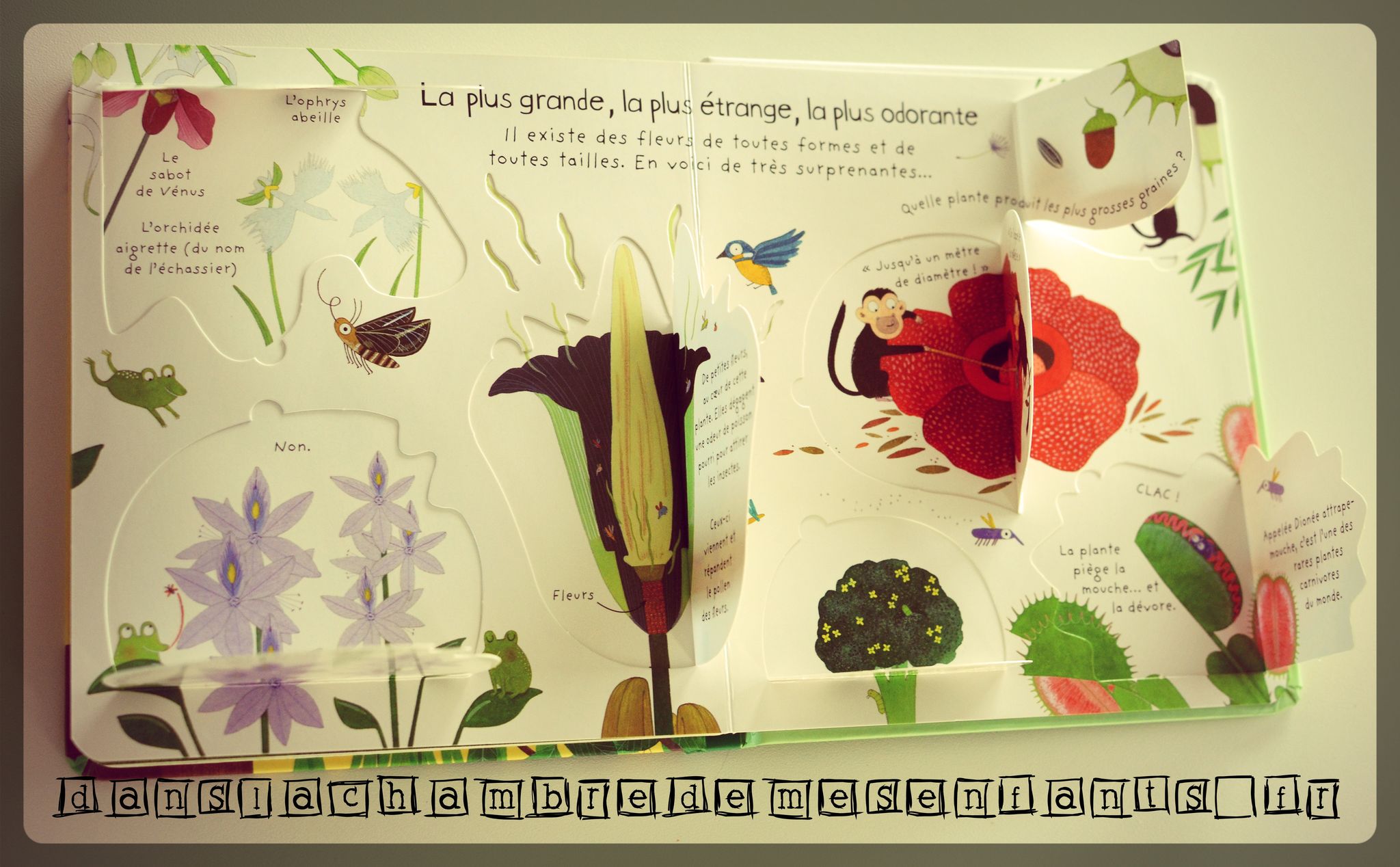 On retrouve le petit livre cartonné avec de multiples rabats, cette fois, pour animer la découverte des fleurs à travers 6 principales questions : « Comment poussent les fleurs ? » « Pourquoi les plantes ont-elles des fleurs ? » « D’où viennent les graines ? » « Qui plante les graines ? » « Pourquoi les feuilles tombent-elles ? » « La plus grande, la plus étrange, la plus odorante » (découverte de 7 plantes étonnantes). Les dessins, parfois mis en relief par des jeux de découpe, accompagnent des questions qui découlent de la première (ex : « Comment poussent les fleurs ? » > « Les plantes doivent-elles se nourrir ? » ou encore « Quelles sont les parties principales d’une plante ? »). Les pages sont entièrement illustrées et colorées. Derrière les volets (6 à 8 par double page), de toutes formes, on découvre les réponses aux sous-questions.