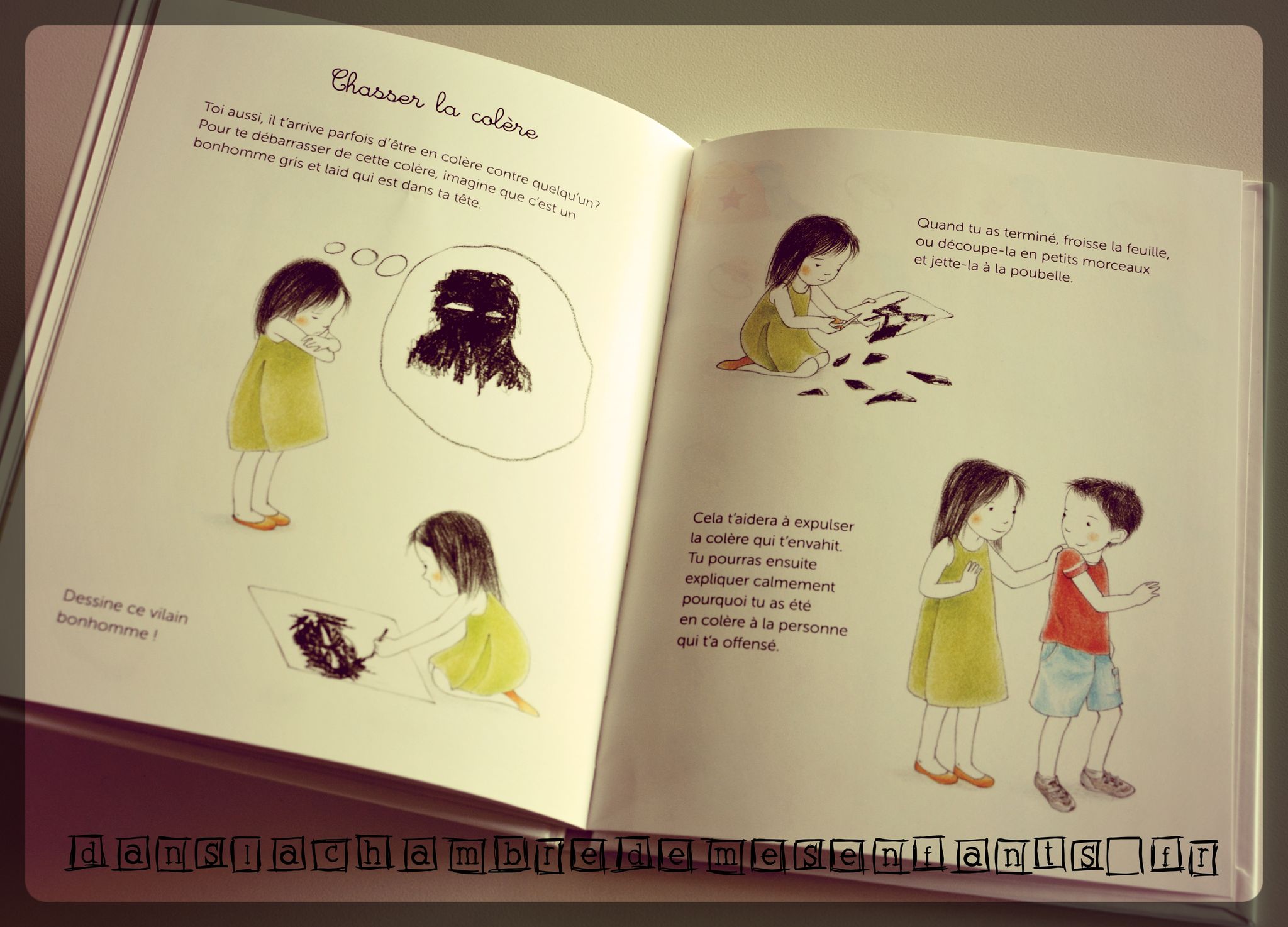 Comme dans l’ouvrage précédent de la même collection (voir en bas de page l’article sur « L’oiseau blessé ») l’histoire est écrite simplement avec de grandes et douces illustrations, et la lecture se poursuit par un peu de pédagogie. Il s’agit cette fois d’émotions, plus particulièrement de la colère qu’il faut chasser. J’ai beaucoup apprécié ce passage et le moyen mis à disposition aux enfants : dessiner un personnage sombre représentant cette colère qui est, ensuite, à abîmer et à jeter avant de prendre le temps d’expliquer calmement sa colère au premier intéressé. C’est exactement ce que j’ai déjà proposé à mon fils et je trouve que cela aide vraiment l’enfant à s’exprimer et non pas à lui donner une leçon de morale (difficile à digérer et à appliquer). Il est question d’accompagner l’enfant et, avec ses propres compétences, il prend un rôle actif qui l’aide aussi à comprendre l’épreuve.