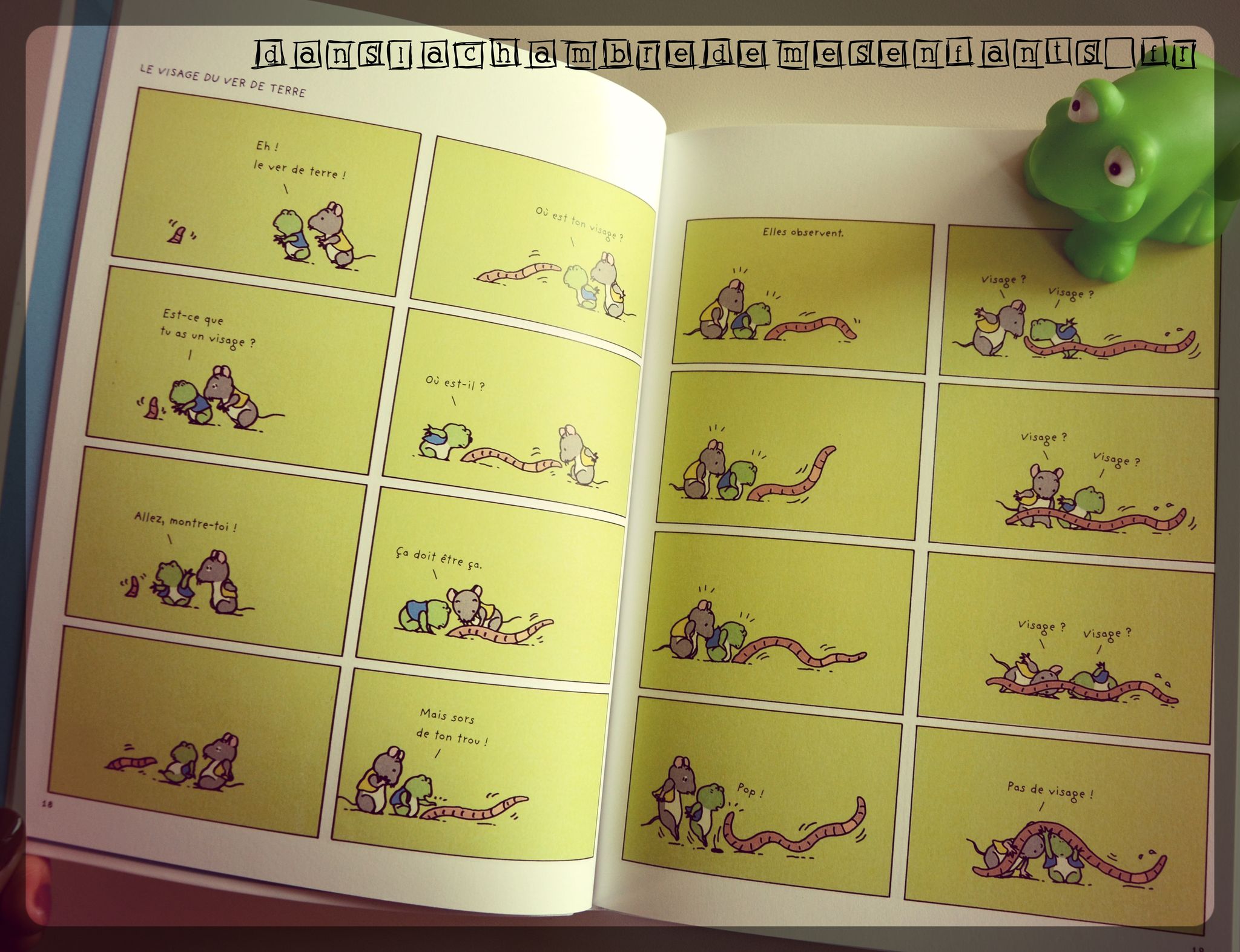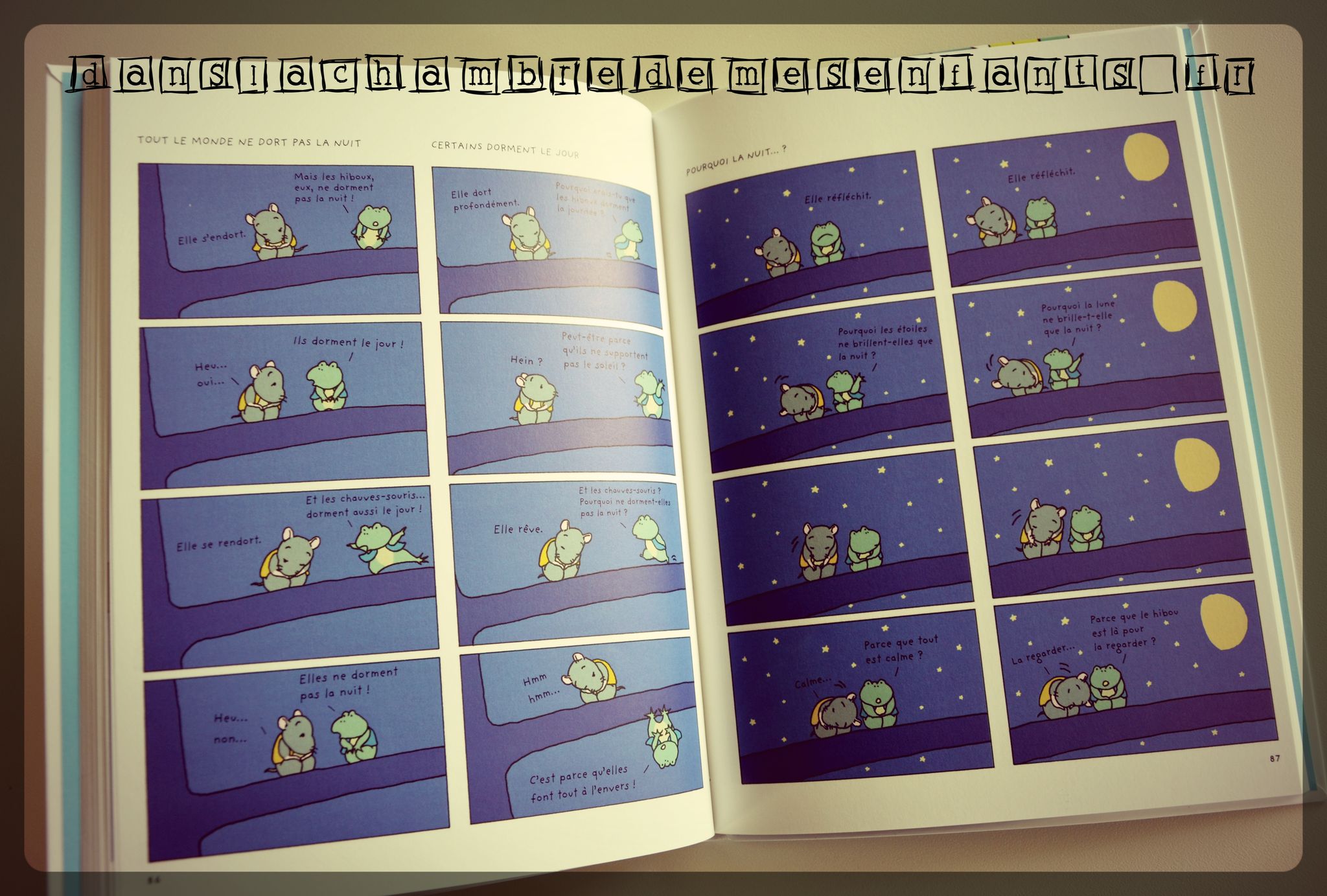 L’avis des enfants : Après avoir expliqué, le sens de lecture, Alex n’a pas été étonné car les enfants sont moins figés que nous sur des modèles. Il a suivi la lecture, qu’il a aussi entrepris lui-même, se prêtant au jeu de réflexion de la grenouille. Des réflexions douces que mon fils a par moment et qu’il a aimé retrouver dans cet ouvrage, parfois en rigolant. Prenons le temps, c’est ici une belle invitation en compagnie de nos enfants.