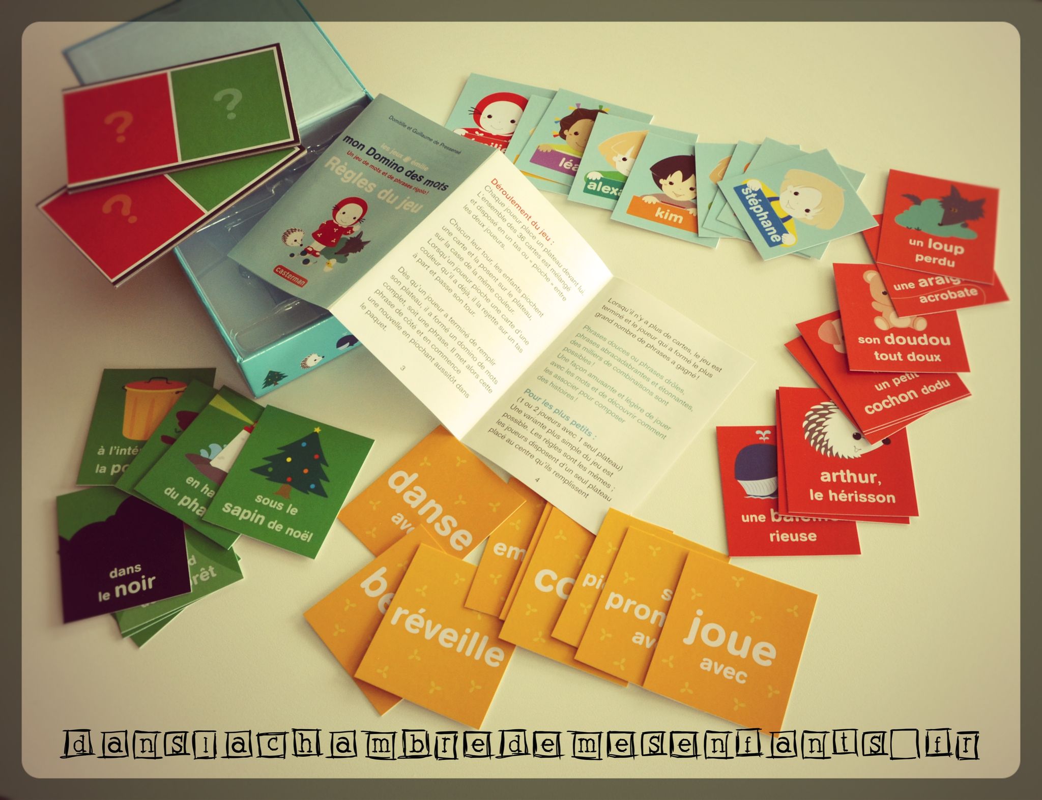 - les cartes vertes, illustrées, précisent un lieu (« sous le sapin de Noël » » dans son lit douillet »…).