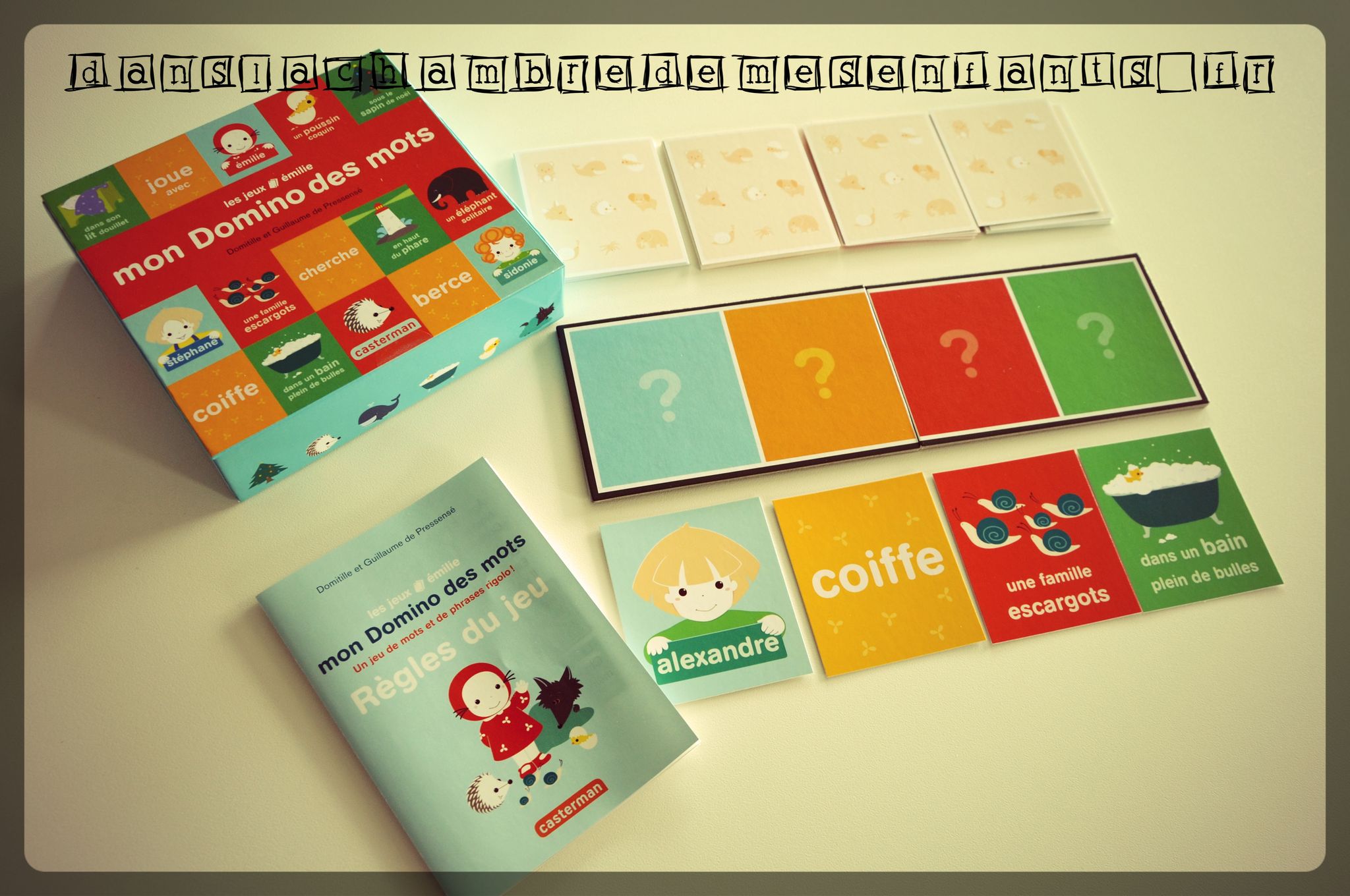 L’avis des enfants : C’est un principe qu’Alex a déjà connu à travers des livres dans lesquels les parties de phrases pouvaient être choisies pour composer une version originale d’un passage d’histoire. Cela lui avait déjà beaucoup plu. Il a maintenant 5,5 ans et il a joué une partie en toute autonomie puisqu’il a exercé ses premières notions de lecture (pas sans une certaine fierté). Il en rigole toujours autant surtout lorsqu’Emi, 16 mois, m’aide à poser les cartes de couleurs aux bons endroits. C’est pourquoi mon fils a voulu recommencer une nouvelle partie mais, cette fois, avec l’aide de sa sœur pour les couleurs, histoire de s’amuser à la voir participer. Elle a, d’ailleurs, été sensible au personnage emblématique (dont ma mère me parlait déjà lorsque j’étais toute petite 🙂 ).
