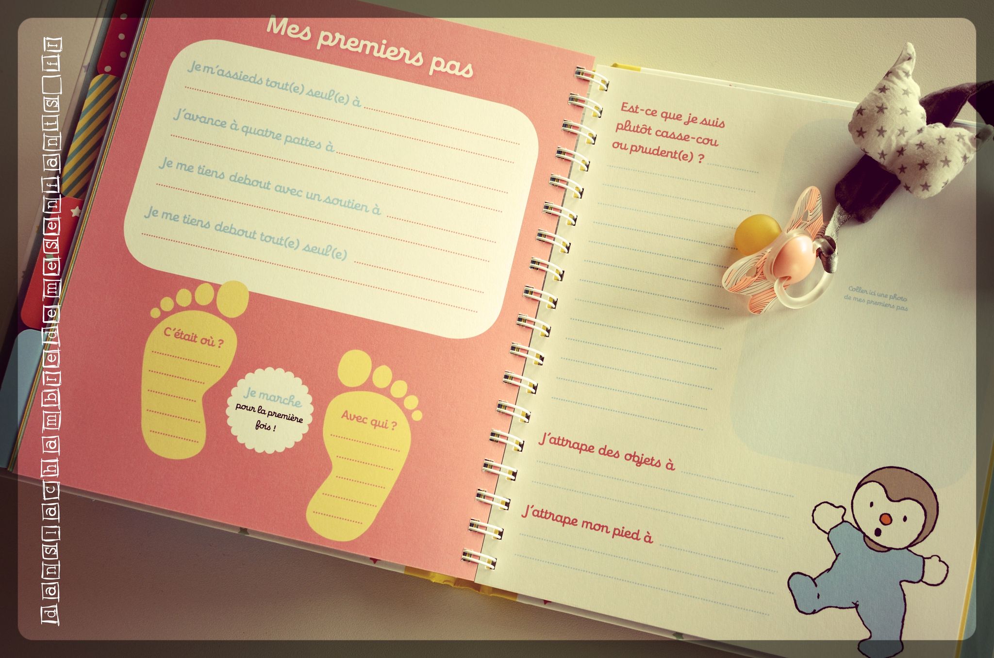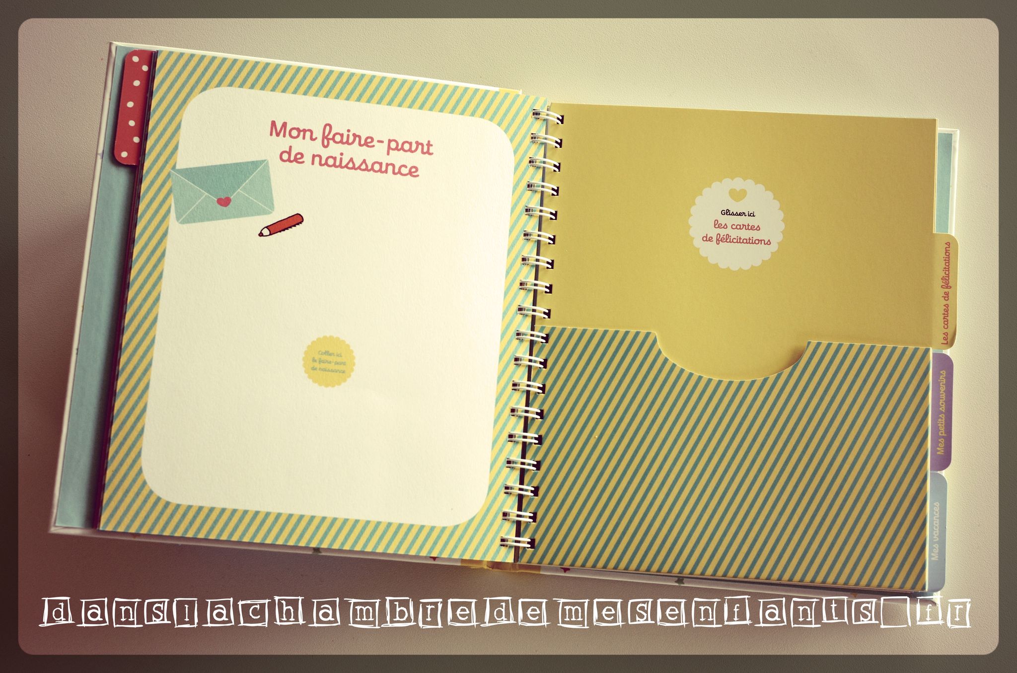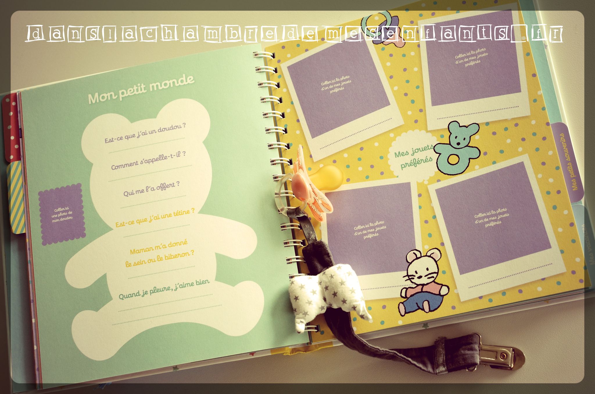 Côté format, il s’agit d’un album à spirales, avec une jolie couverture (douce ! c’est étonnant !) en relief et munie d’un élastique. Il est organisé en 4 grandes parties sous intercalaires (à onglets et avec soufflé) : « Les échographies » « Les cartes de félicitations » « Mes petits souvenirs » et « Mes vacances ». On peut y inscrire des souvenirs tels que l’alimentation de la future maman, les évènements de l’actualité le jour de la naissance, les premiers cadeaux, l’arbre généalogique, des détails sur les premiers bains, ce qui fait rire bébé, les vêtements, les empreintes… ainsi que de nombreux espaces pour y coller des photos, notamment un premier album photos à constituer en fin d’ouvrage. Il n’est pas question de composer un livre sur plusieurs années mais surtout de préciser davantage la première année. Les enfants sont friands de détails et les jeunes parents sont alertes aux moindres évolutions de leur enfant, de quoi remplir les nombreuses pages qui suggèrent et inspirent.