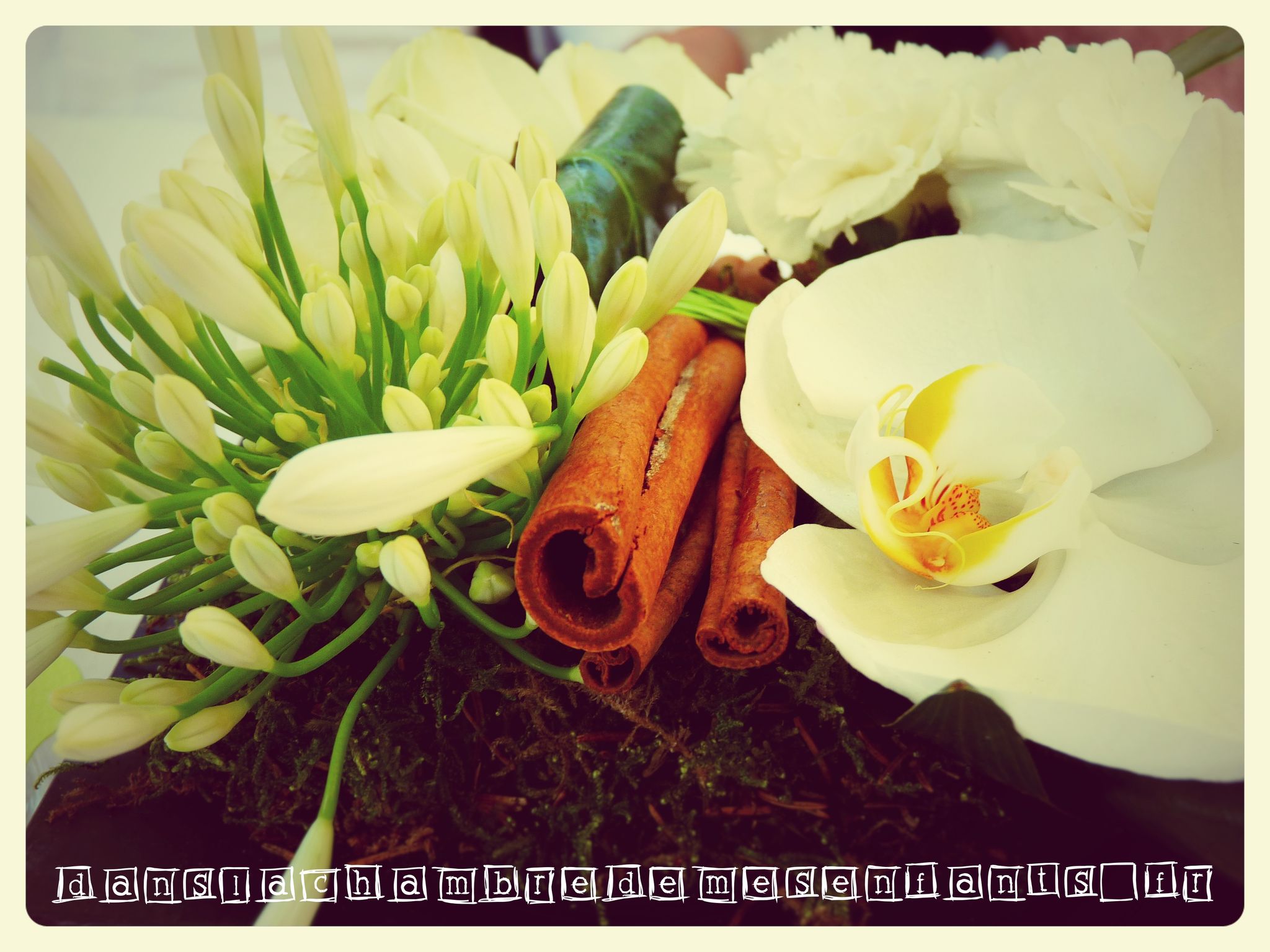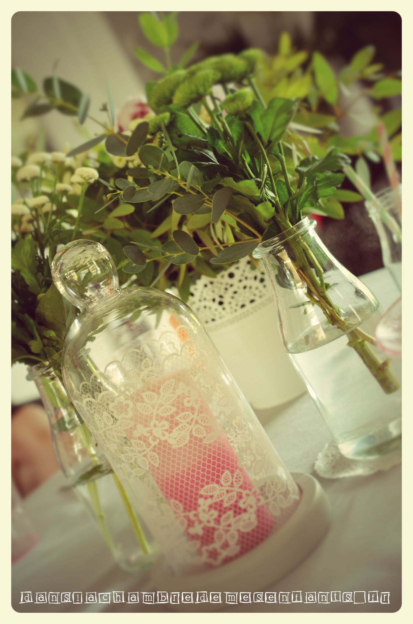 - avec un bouquet de fleurs et quelques petits branchages : le tout dispersé dans un gros vase ainsi que dans des petites bouteilles de verre décorées par des rubans de dentelle