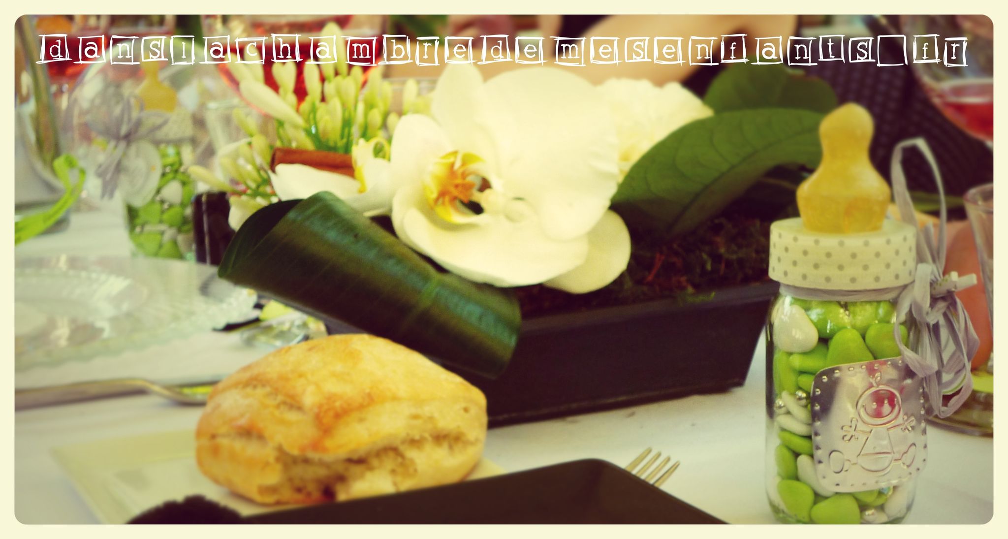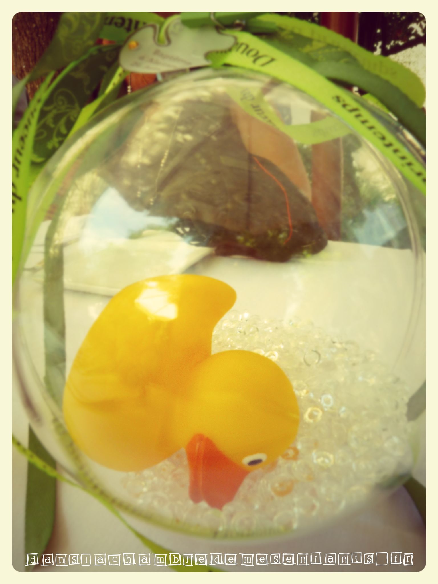 A l’époque, je ne faisais pas encore de décoration de fête et nous étions moins nombreux. Son baptême avait donc eu lieu au restaurant mais j’avais quand même travaillé un peu 😉 Sa couleur était le vert anis et, le jouet qui marquait pour moi l’enfance, le canard de bain. C’était parfait pour son baptême.