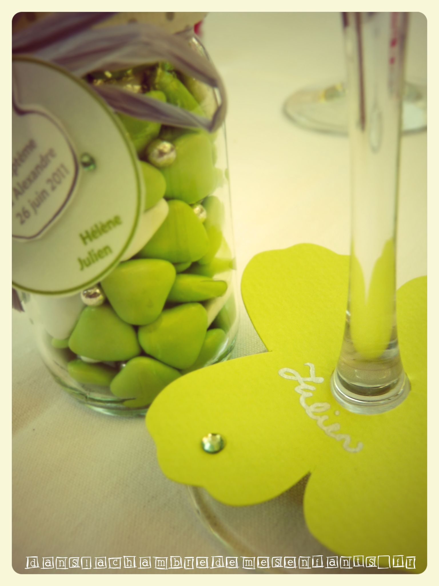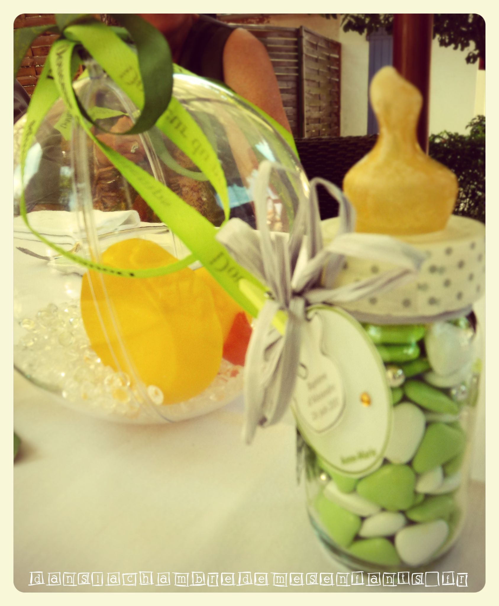 La décoration de table était un centre fleuri choisi chez le fleuriste, en rappel aux emballages cadeaux des parrains. En effet, ils ont reçu un cadre photo original avec leur première photo avec leur filleul et j’ai voulu un emballage végétal (en feuillage fermé par une fleur blanche). J’avais ajouté une grande boule transparente avec des billes et un canard jaune que l’on retrouve sur le contenant des dragées. L’anneau de la sphère était décoré d’un double ruban en camaïeu de vert. Les marques places étaient des papillons verts choisis pour leur couleur et le côté pratique car ils pouvaient être placés autour du pied d’un verre, sur lesquels j’ai ajouté un petit strass autocollant.