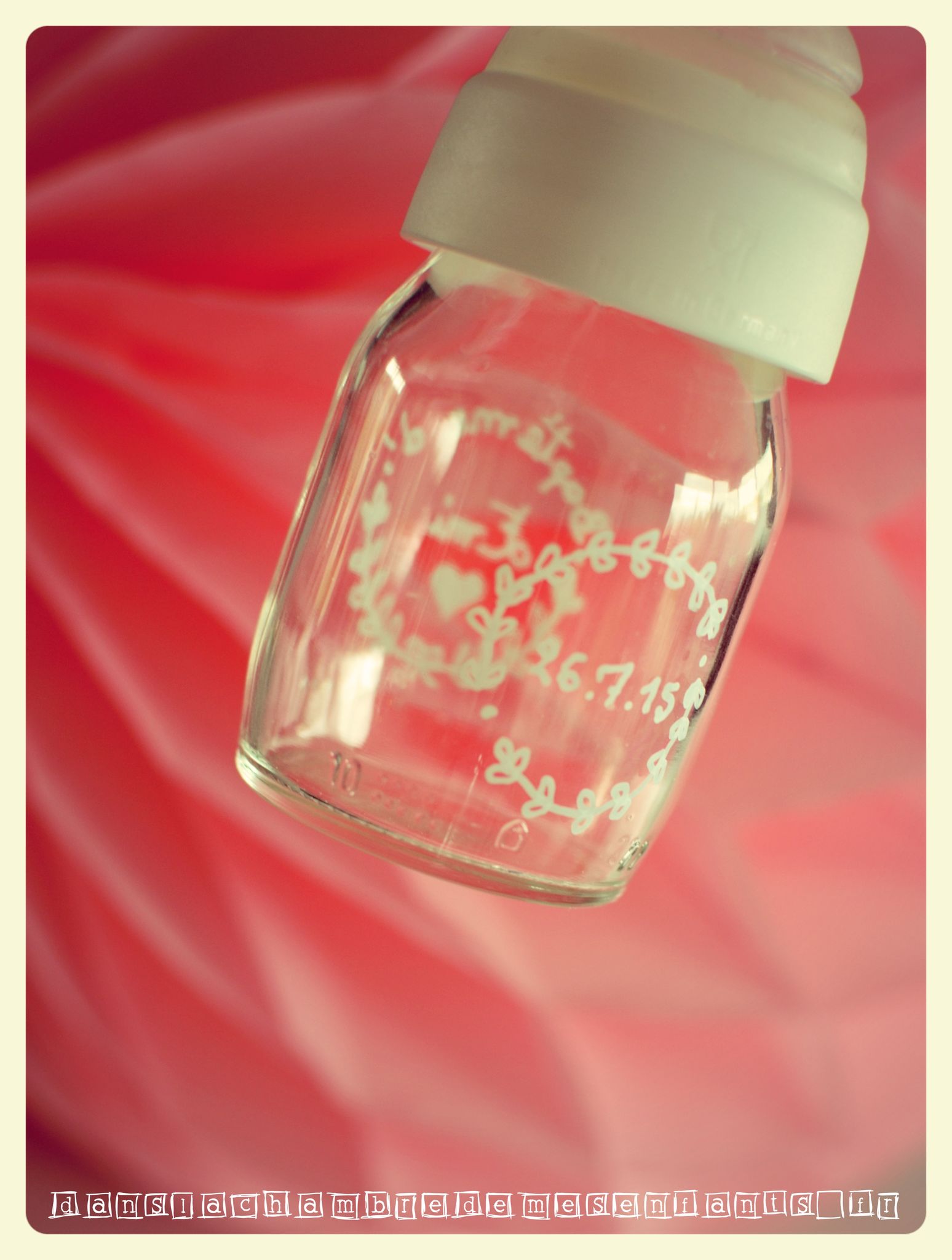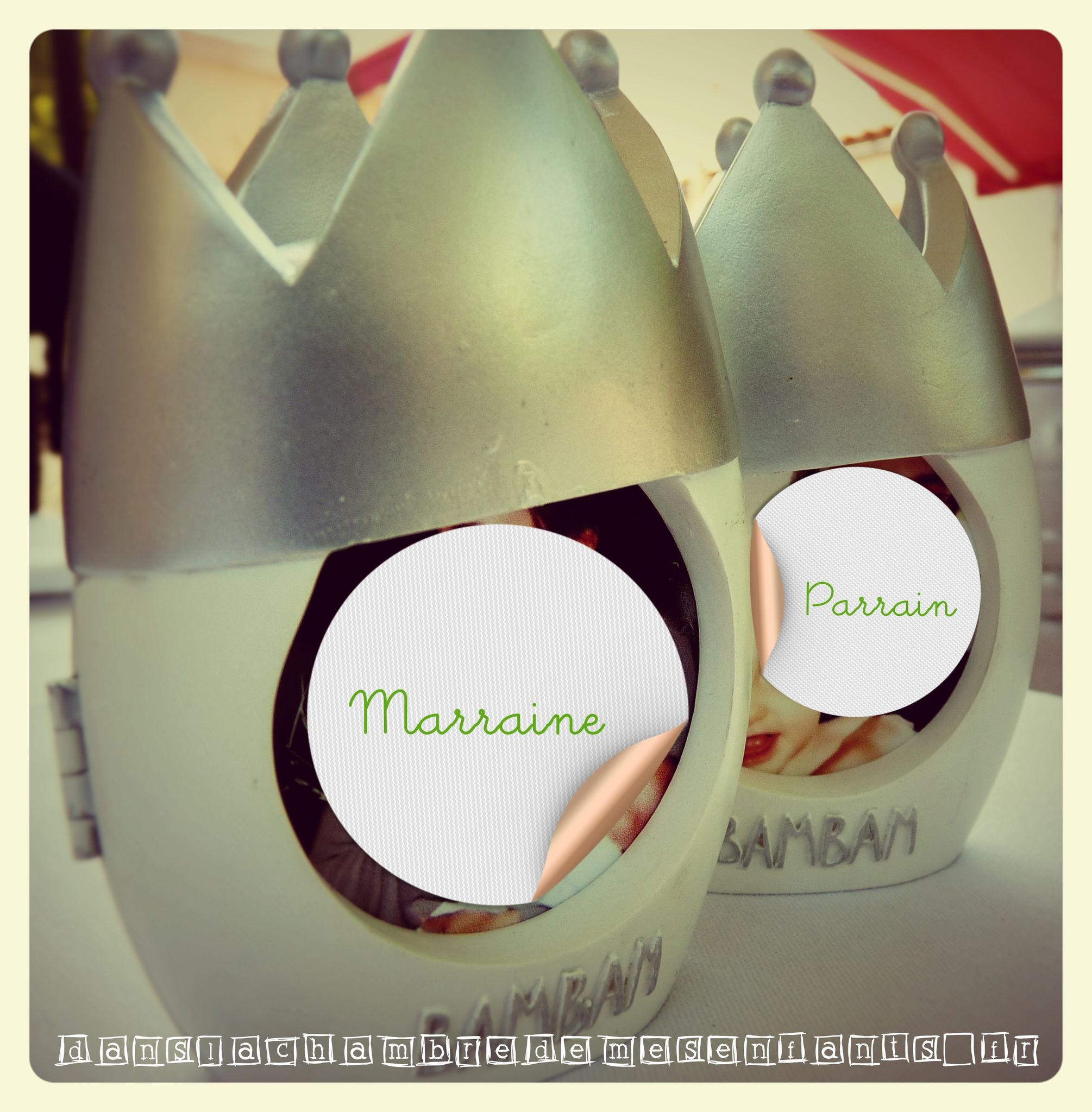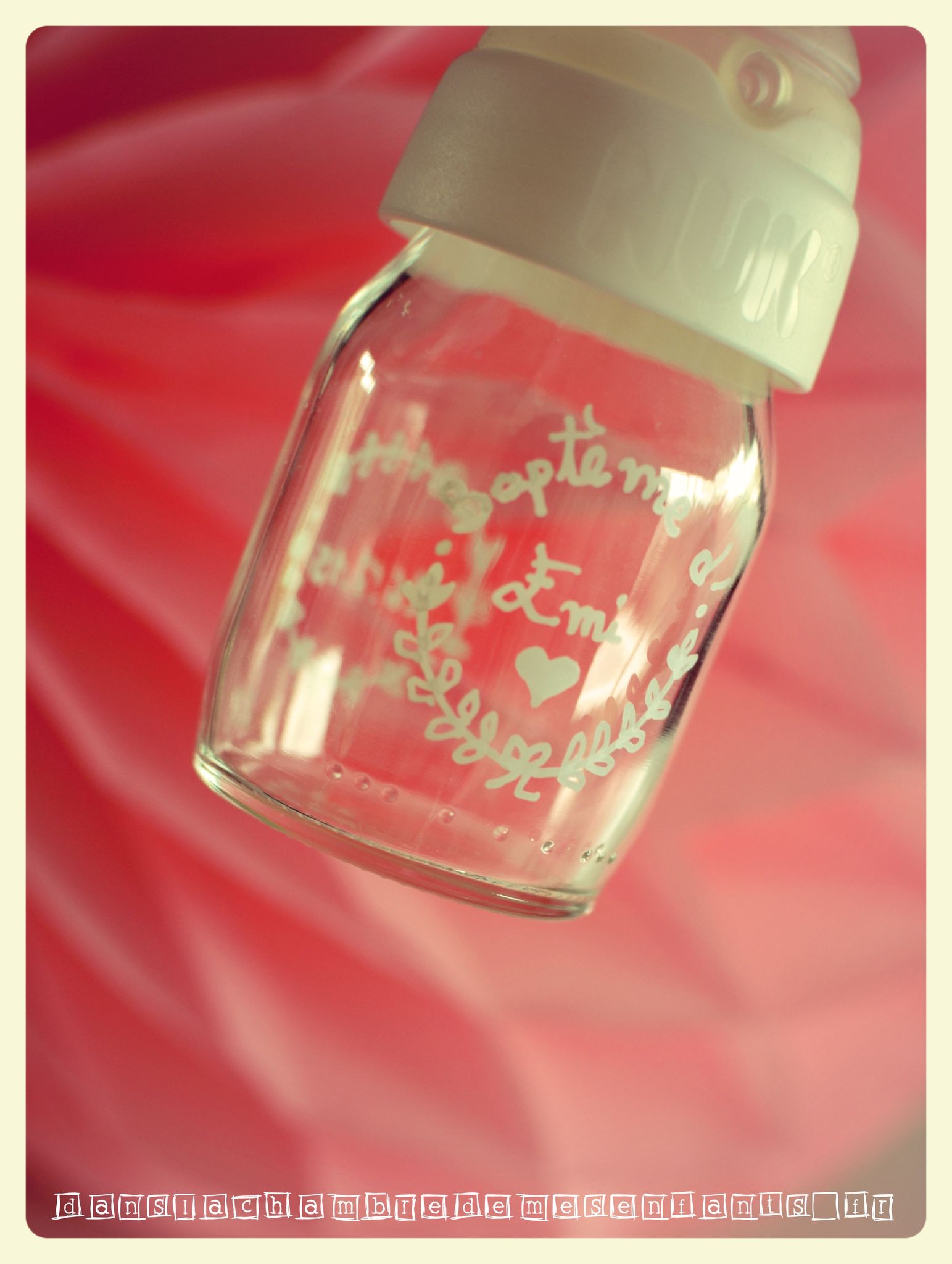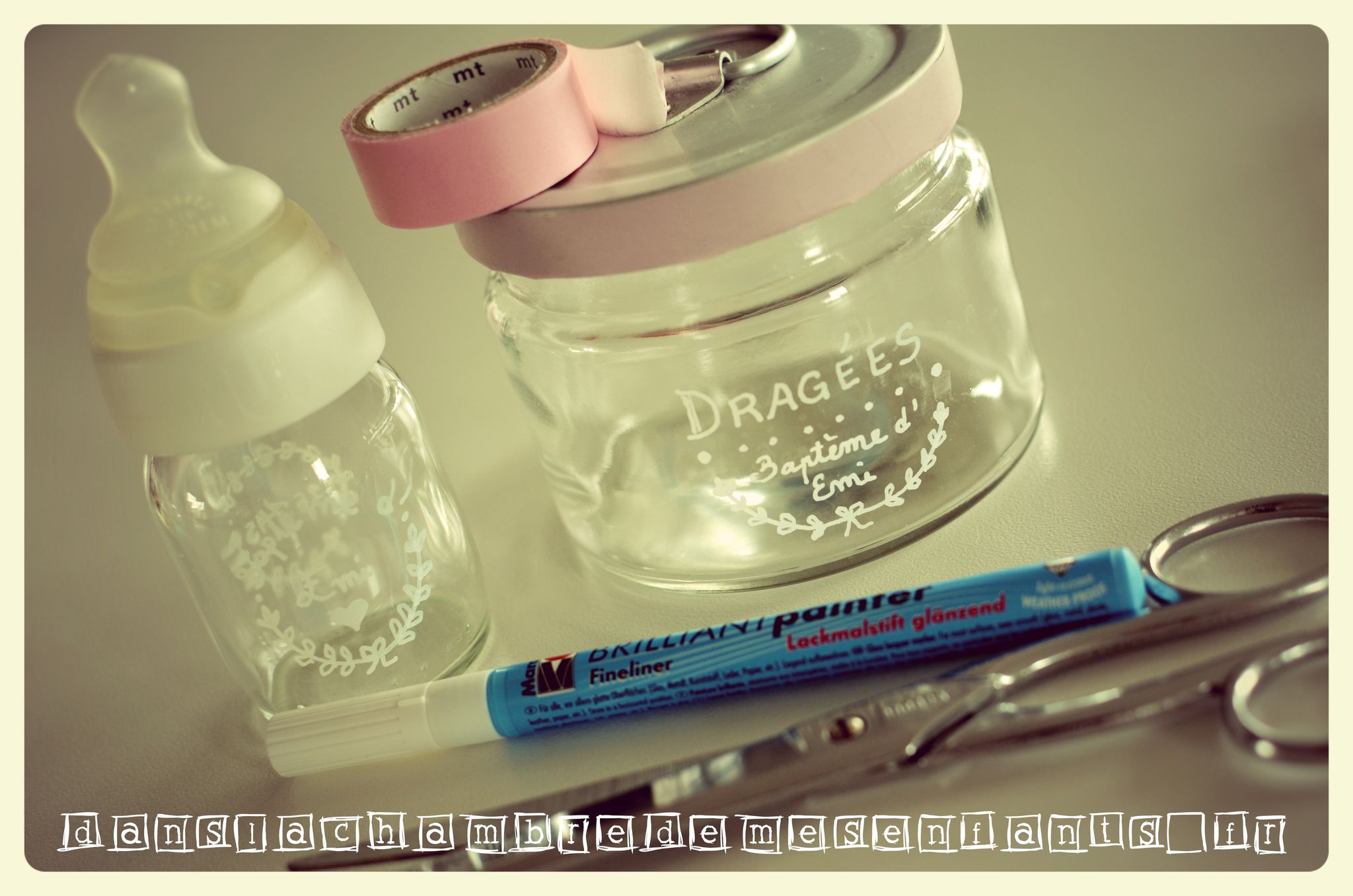 Enfin, le contenant des dragées était un biberon qu’il avait à sa naissance : la bague était décorée d’un masking tape à pois gris souris (pile la taille… encore !) ceinturée de raphia gris. Sur son lacet était accrochée une mini épingle (décorée avec des motifs discrets verts) tenant ainsi deux médaillons que j’avais créés sous fichier Word, de forme ronde (l’un portant le nom du destinataire, l’autre la silhouette d’un canard de bain que j’avais dessinée portant la date et l’évènement) imprimés sur papier calque, décorés par un tout petit strass vert. Le verre du biberon était décoré par une plaque métallique portant l’empreinte d’un dessin de bébé (rayon arts plastiques) autocollant.