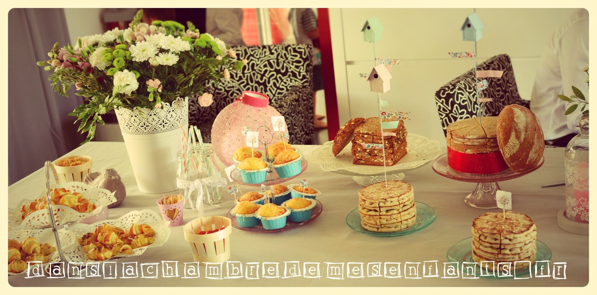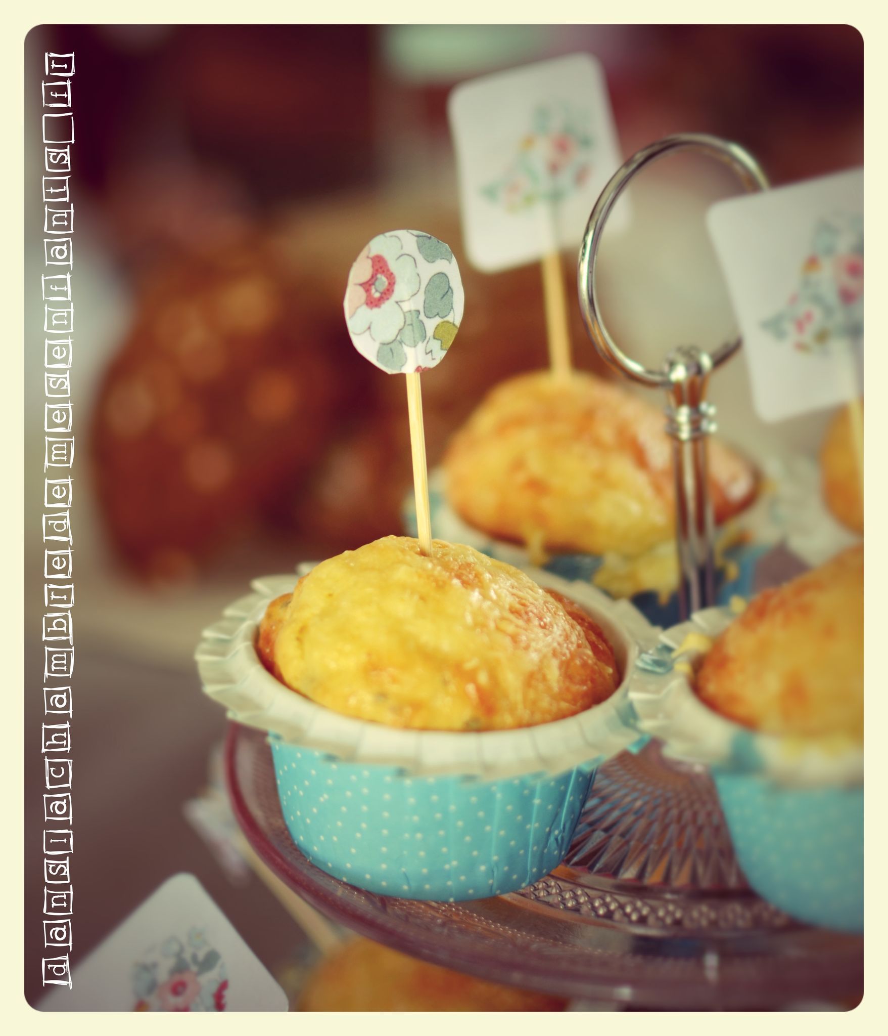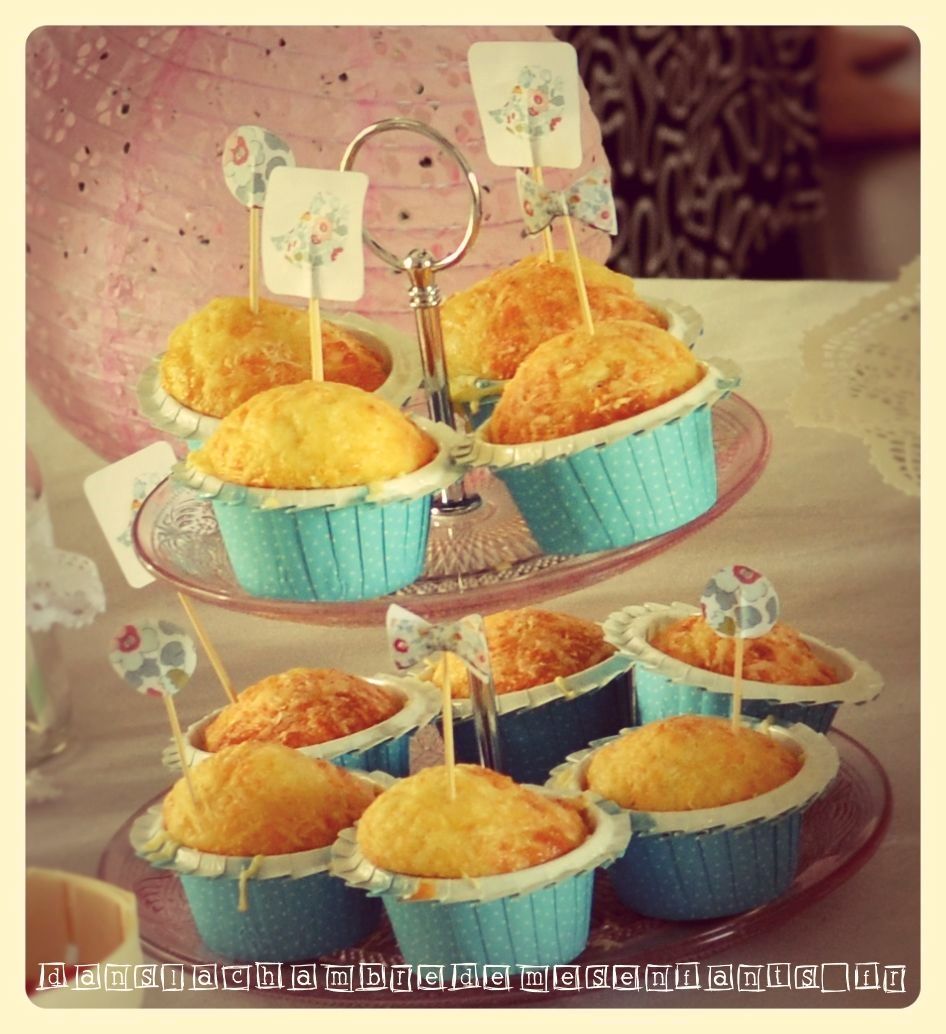 - les petits éléments comme les muffins salés dans un plat en verre à étages (normalement pour les pâtisseries) et j’ai réalisé des petites décorations sur cure-dents au motif Liberty