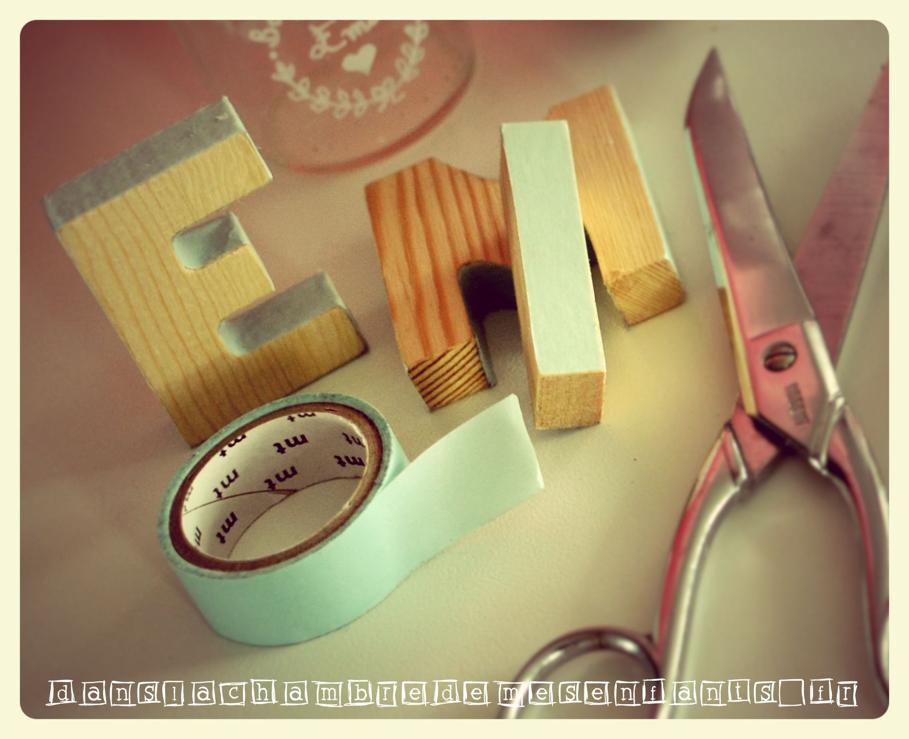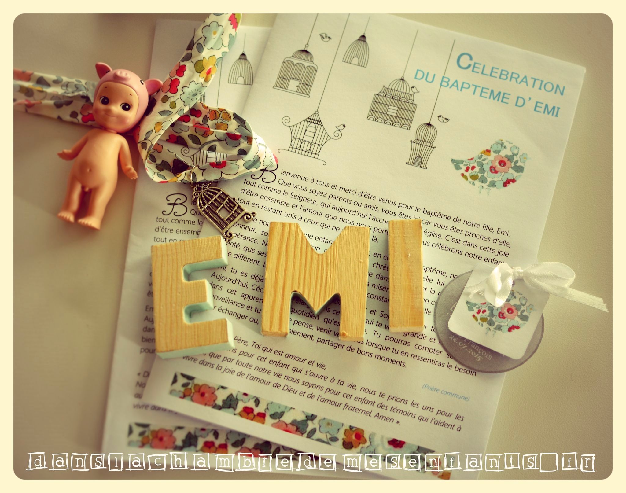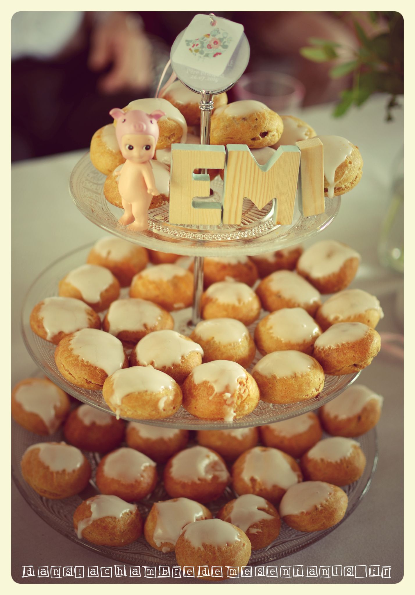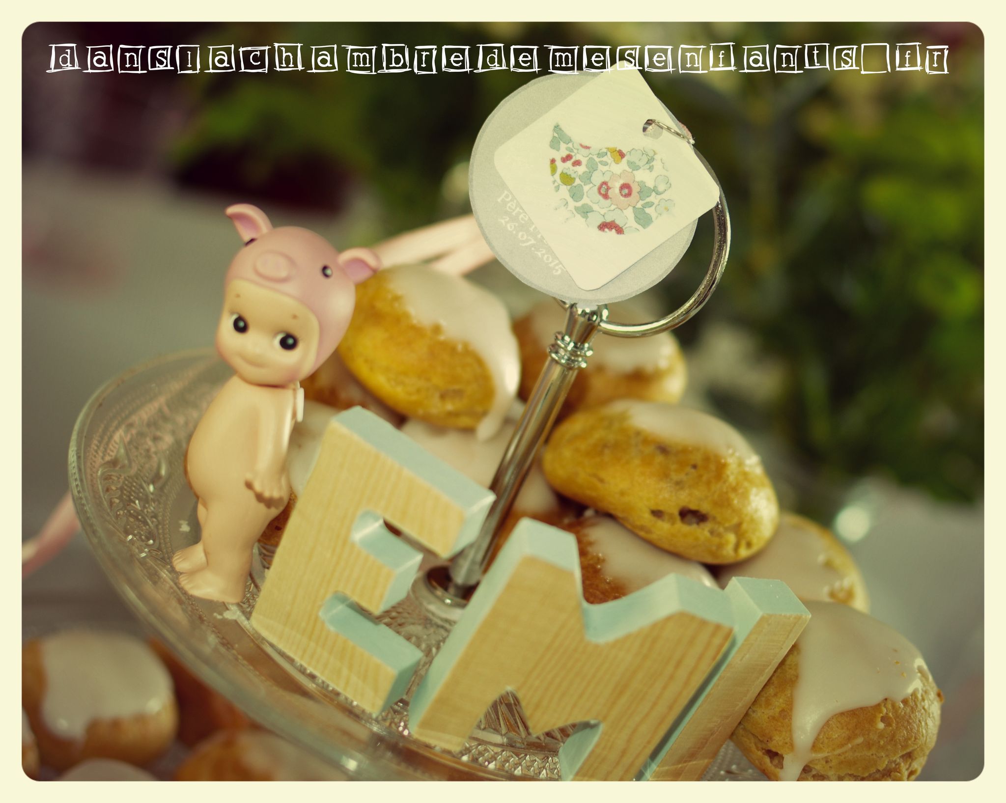 Pour la pièce montée, je ne voulais pas de nougatine alors j’ai recherché une astuce tout en l’intégrant dans la déco : j’ai disposé les choux à la crème dans un plat en verre à étages, j’ai noué la chute de ruban Liberty au sommet (+ deux étiquettes également sur le faire-part, voir plus bas) et j’ai recherché un sujet… Je souhaitais que ce soit moderne et que ça marque son temps : j’ai choisi des Sonny angels qui sont des petits anges que vous achetez à l’unité, selon une série, mais que vous ne pouvez pas choisir (la surprise à l’ouverture !). J’ai voulu le lapin ou la petite biche mais ce sont les plus rares ! J’ai tout de même tenté et j’en ai acheté deux (pour l’assurance d’avoir un de secours si le premier n’est pas terrible) et j’ai eu un lion et un cochon. J’ai beaucoup hésité à mettre le cochon (et même pensé à lui faire une couronne de fleurs pour cacher ses petites oreilles) et puis je me suis dit que je devais jouer le jeu, marquant une pointe d’humour à sa pièce montée (j’assume). J’ai ajouté des petites lettres en bois (vendues à l’unité au rayon arts plastiques) que j’ai décorées uniquement sur la tranche en collant du masking tape (pile la bonne largeur !).