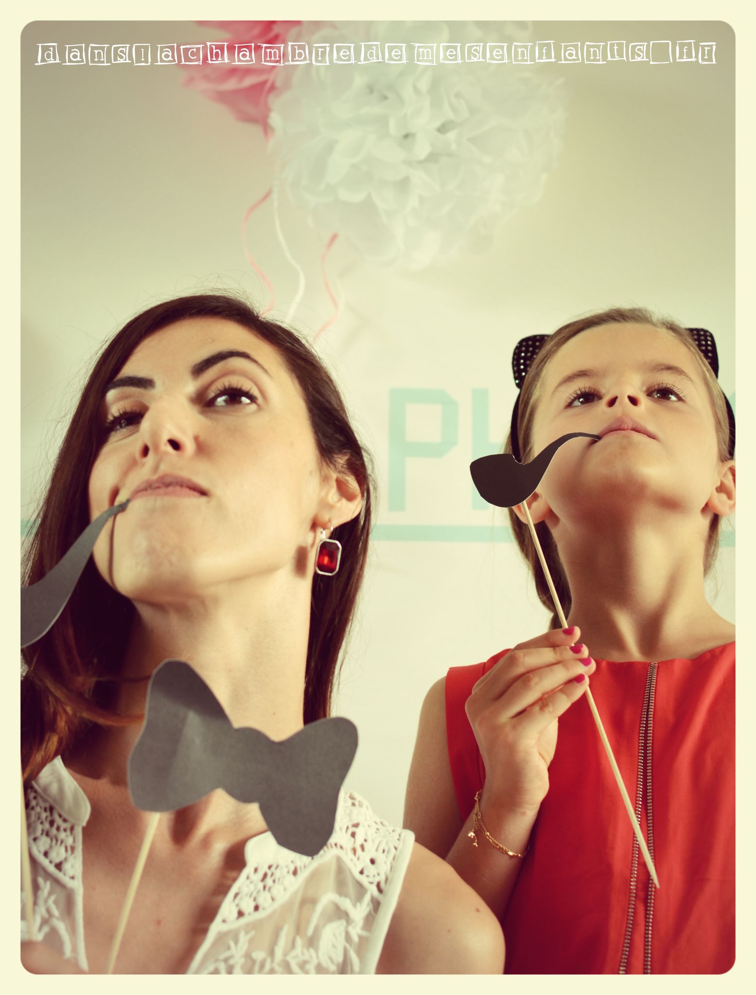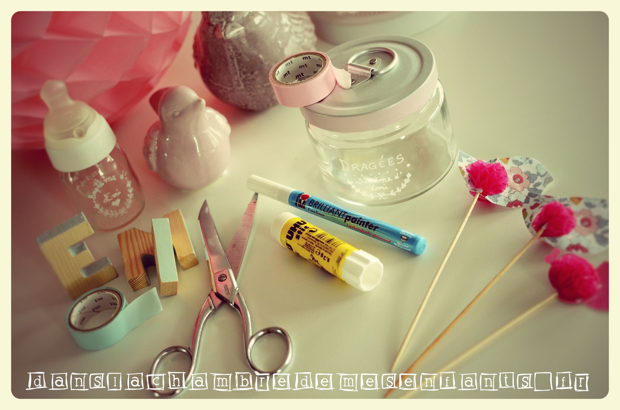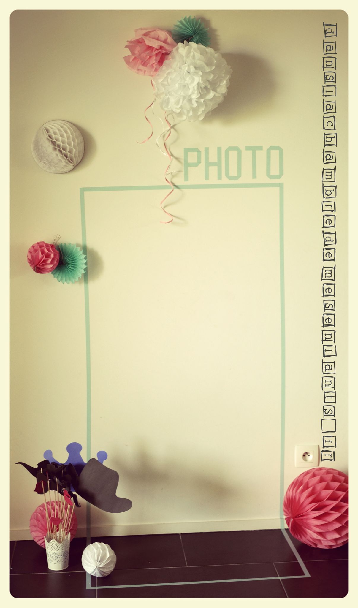 Pour amuser les invités, j’ai fait un coin photo booth (= coin photo avec des accessoires) à partir d’une image que j’ai vu sur le web (je ne retrouve plus l’adresse). J’y ai ajouté mes pompons et d’autres éléments de déco. Pour le tracé du mot « photo » et le cadre qui déborde sur le sol, il s’agit simplement de masking tape. Je l’ai tracé à l’œil en contrôlant régulièrement avec un mètre (c’est très simple). Pour les accessoires, il s’agit de formes que j’ai dessinées et découpées sur des feuilles cartonnées, puis scotchées sur des pics à barbecue (!) limés au préalable.