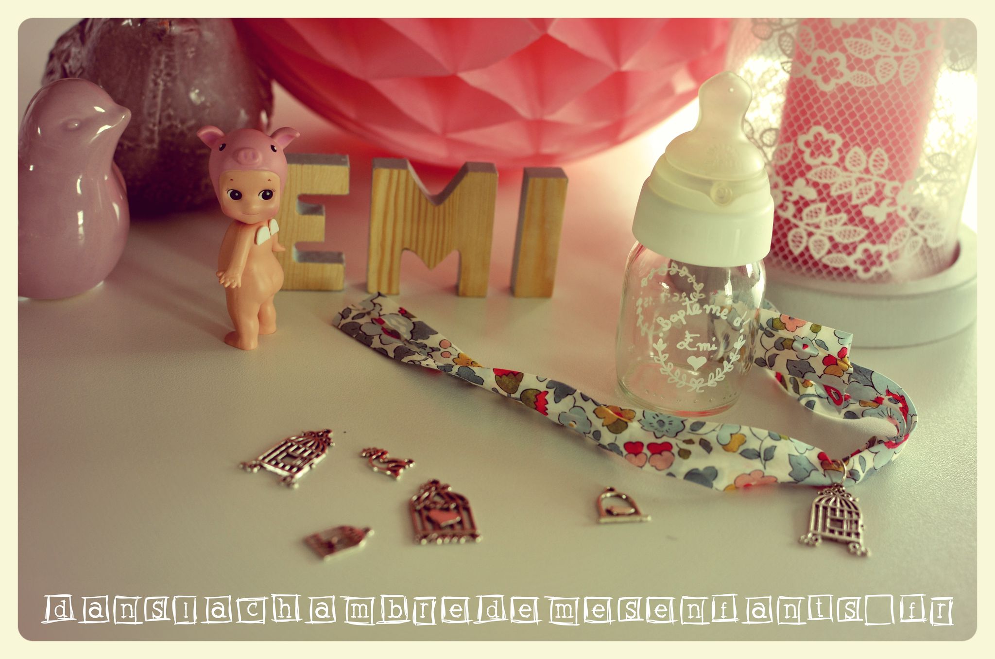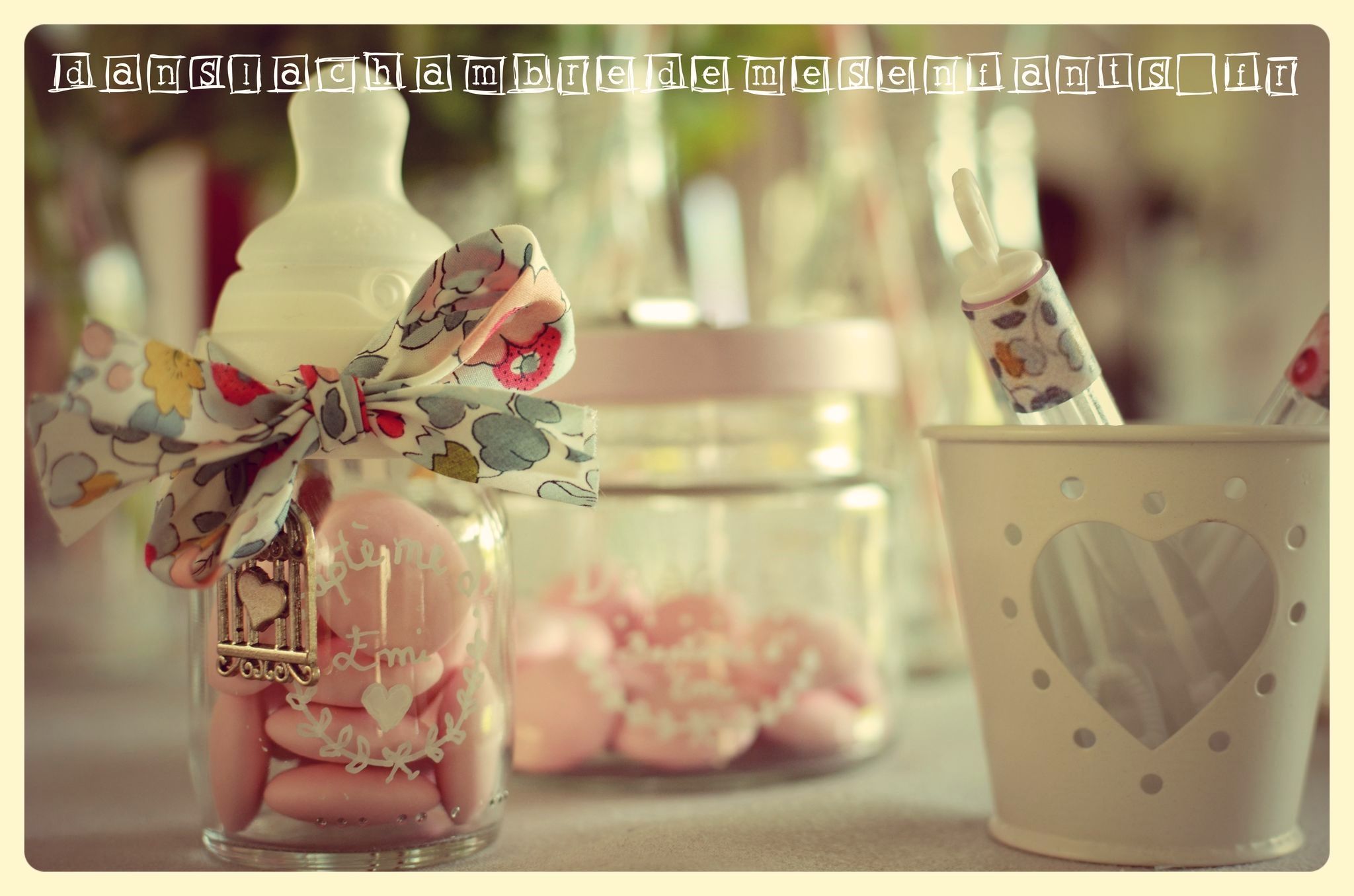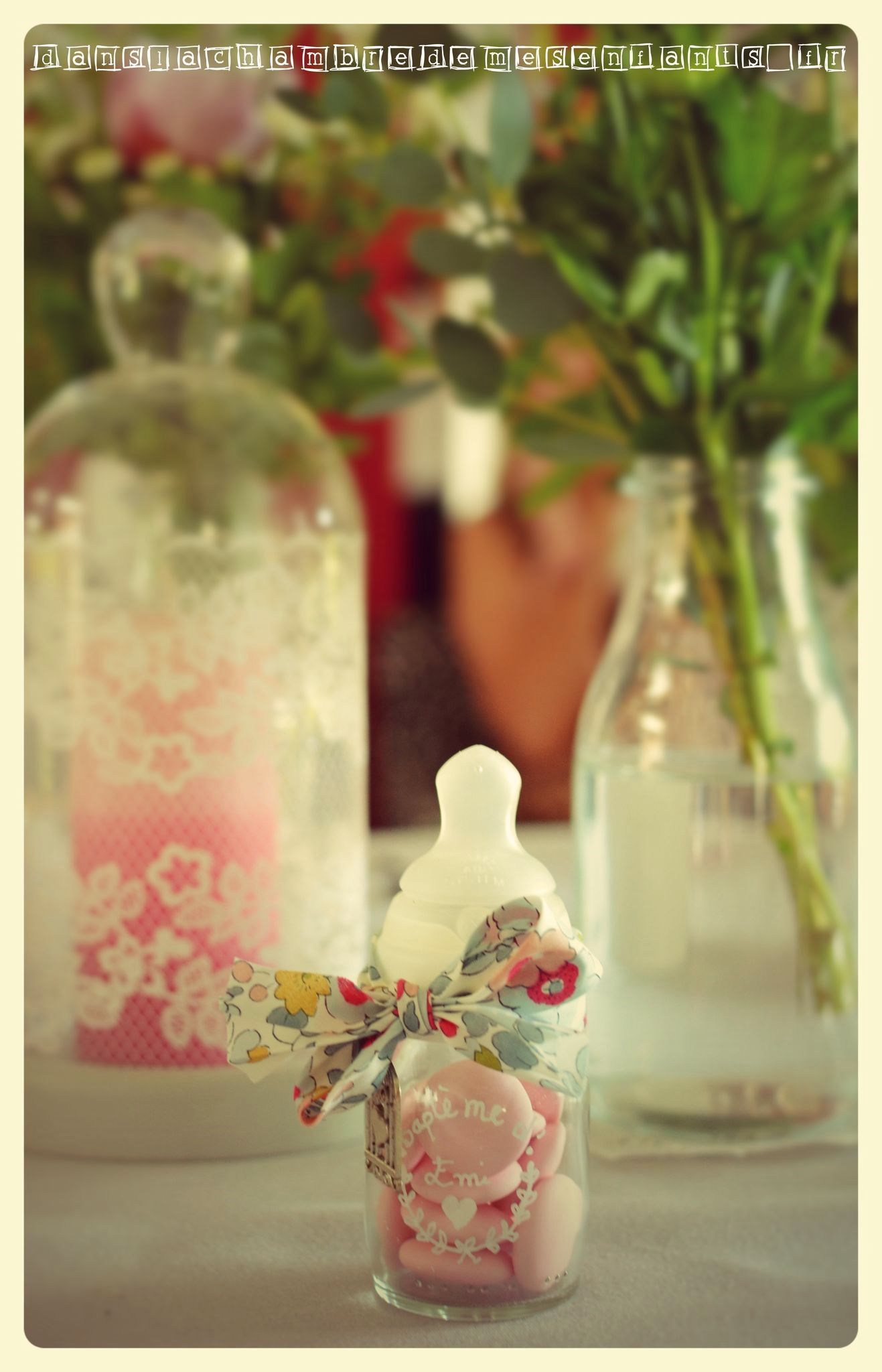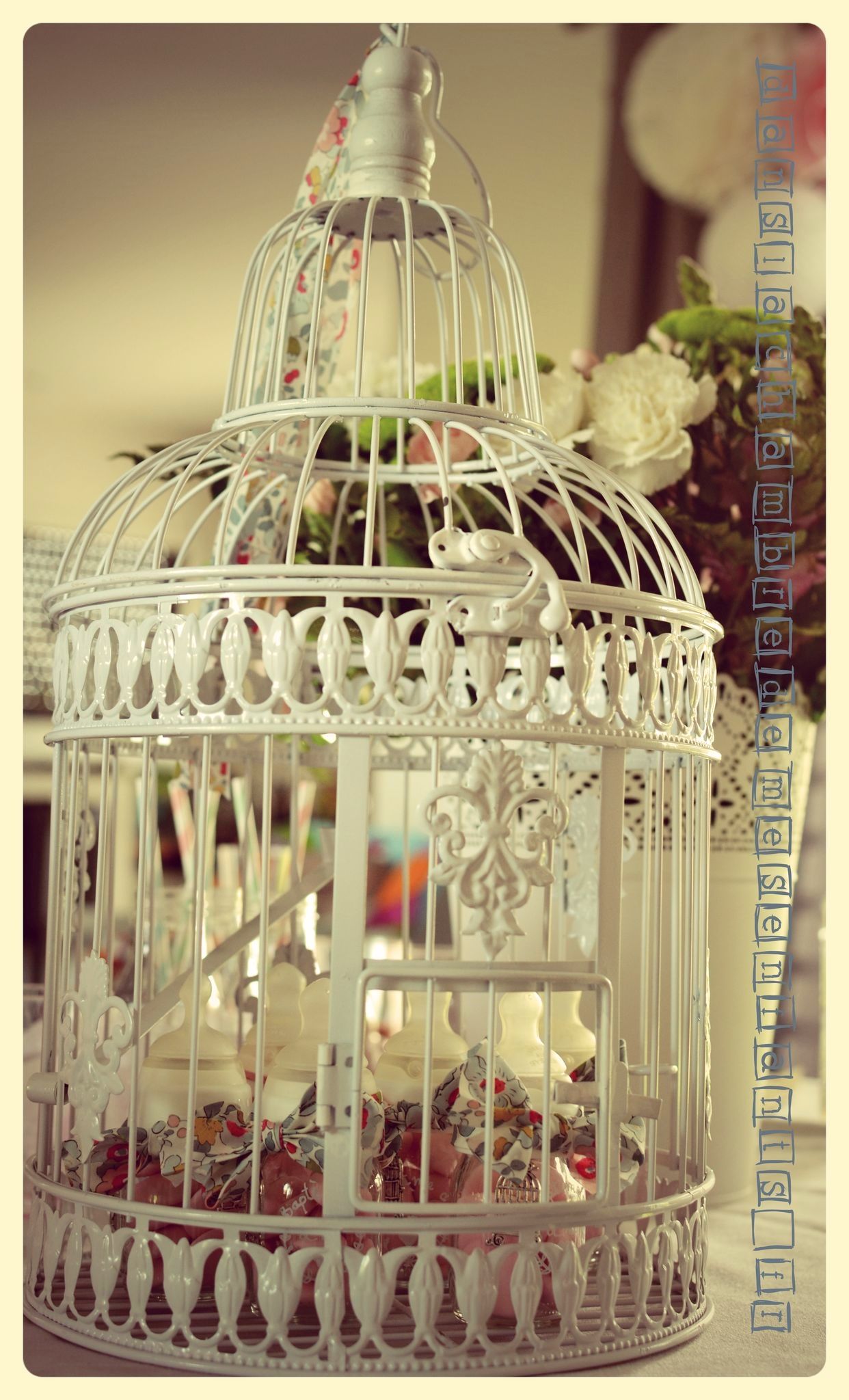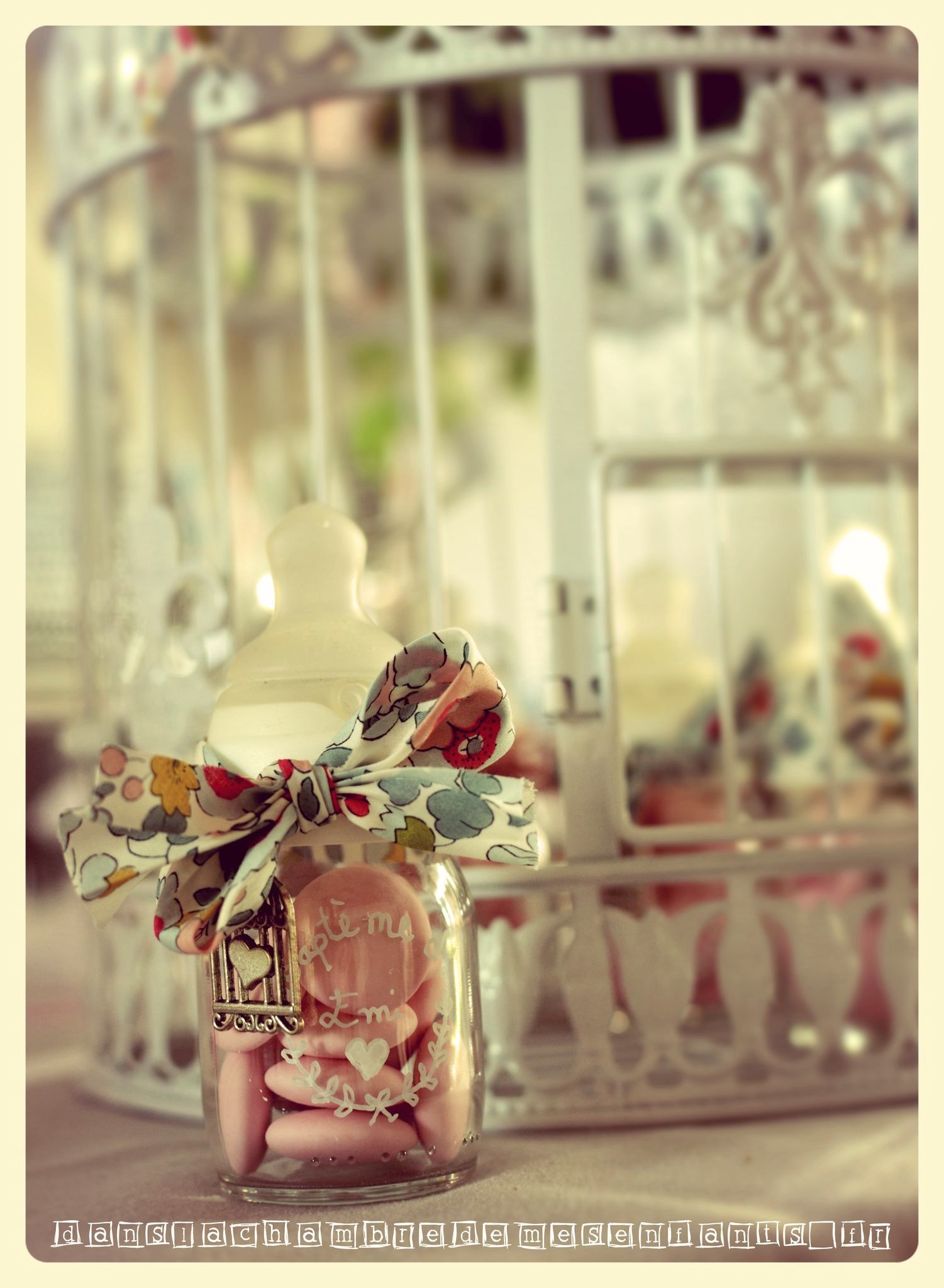 Au moment du dessert, j’ai disposé sur la table une grande cage métallique (rayon jardin) renfermant les petits contenants à dragées. Ces derniers étaient disposés dans les petits biberons qu’ Emi avaient ses premiers jours (en clinique). J’ai acheté un ruban Liberty (vendu au mètre, moins cher, sur alittlemercerie.com) pour le nouer autour de chaque bague de biberon ainsi qu’au sommet de la cage. Après avoir nettoyé de tout point de colle les biberons (grâce à du vinaigre blanc), j’ai écrit dessus au stylo blanc (spécial verre) dans un style un peu vintage. Pour que le ruban puisse être le cadeau invité en se transformant en bracelet (et bien sûr décorer un peu plus le biberon) j’ai acheté un lot de pendentif sur le thème « oiseau » (toujours sur alittlemercerie.com) et des anneaux argentés pour les suspendre sous le lacet.