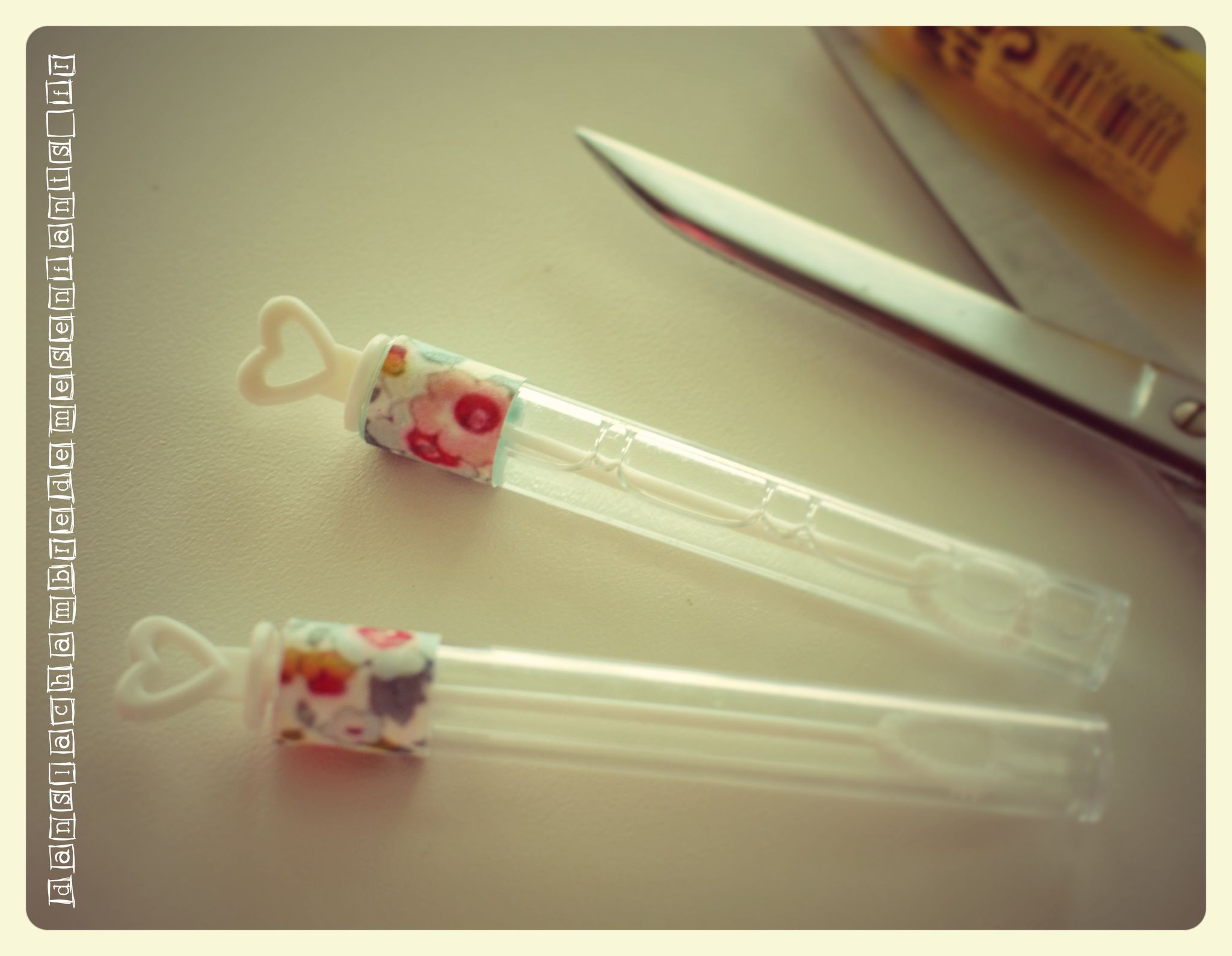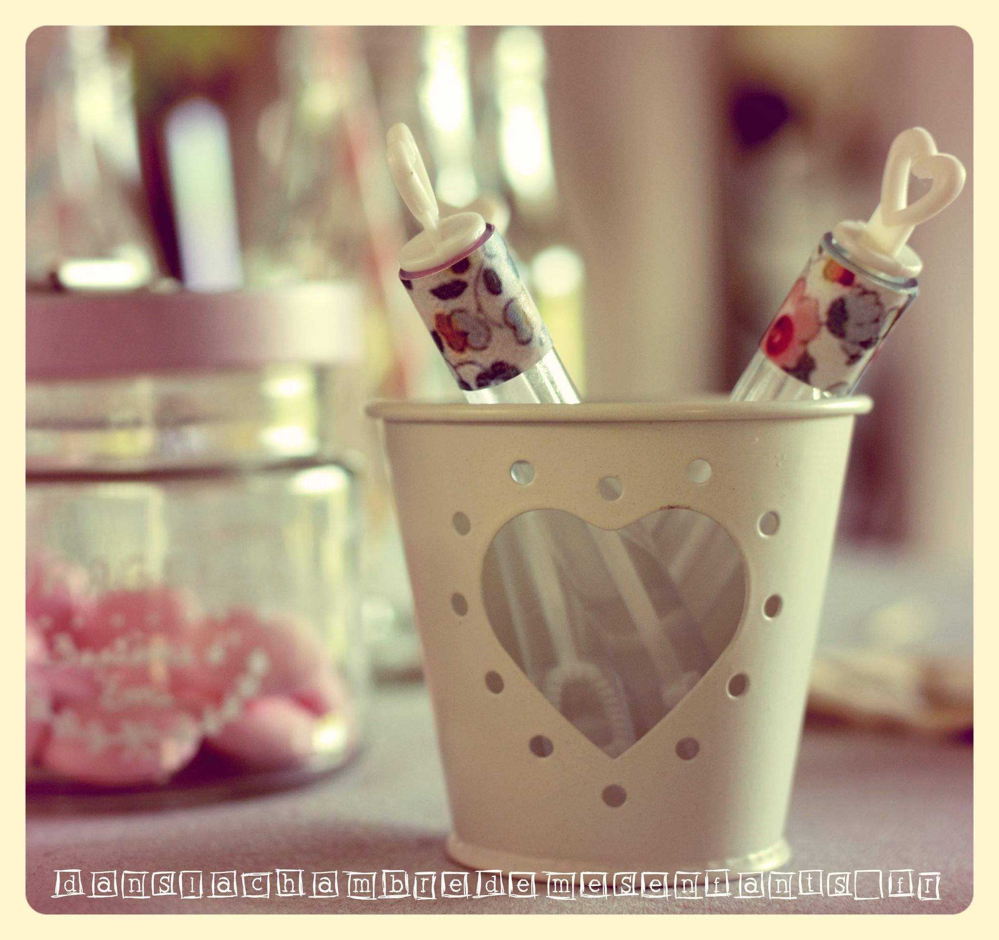- des petits pots en métal (rayon jardin) pour présenter les cure-dents ainsi que des tubes à bulle (rayon mariage) pour les enfants, décorés au motif Liberty (voir plus bas)