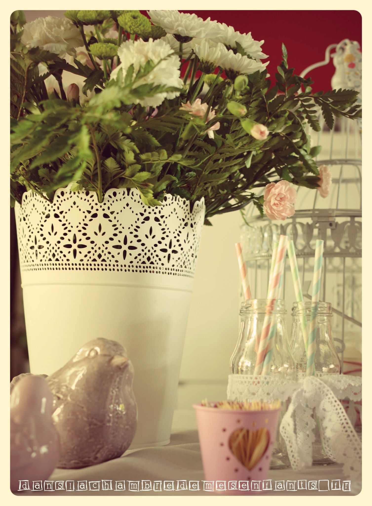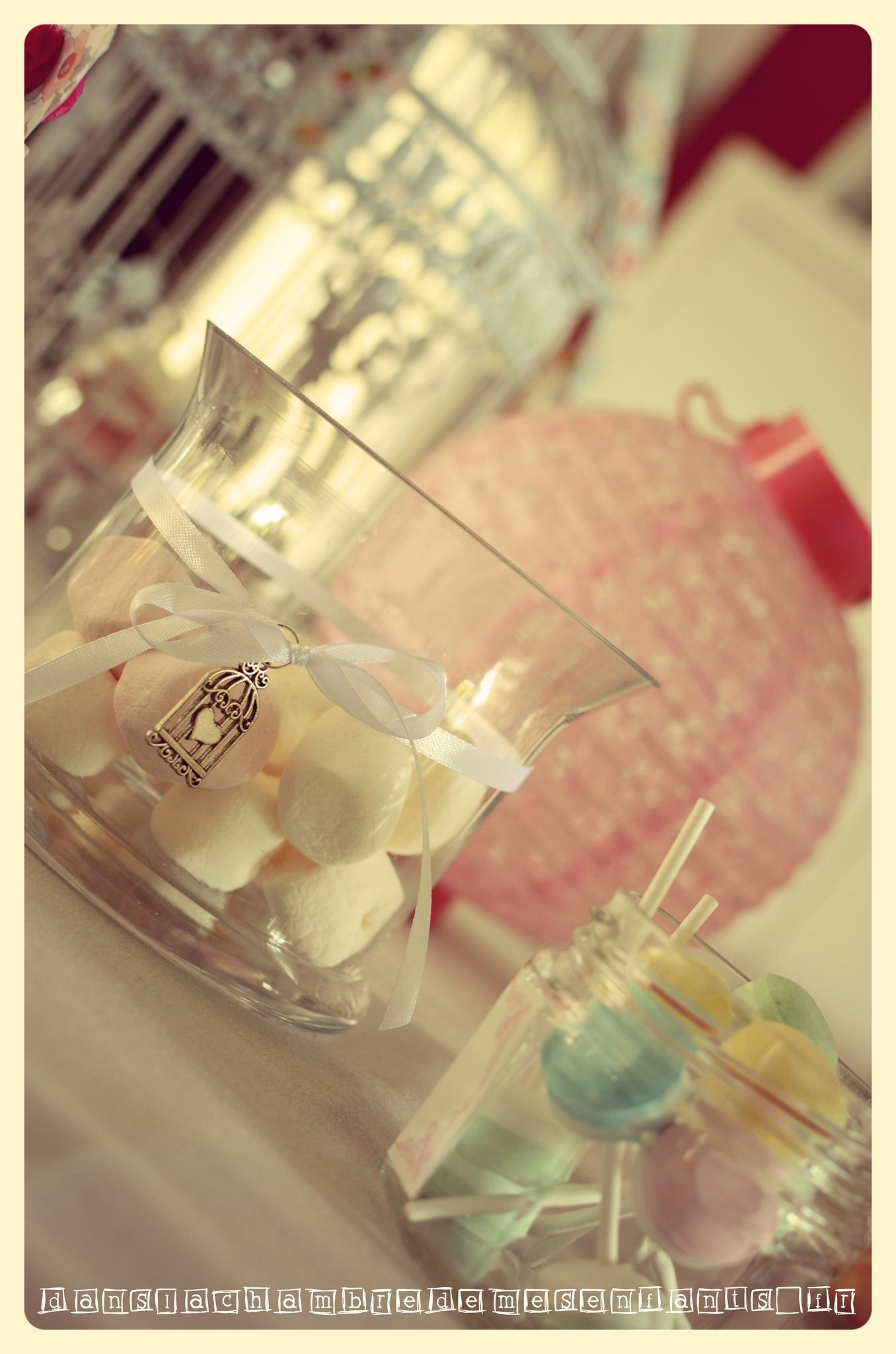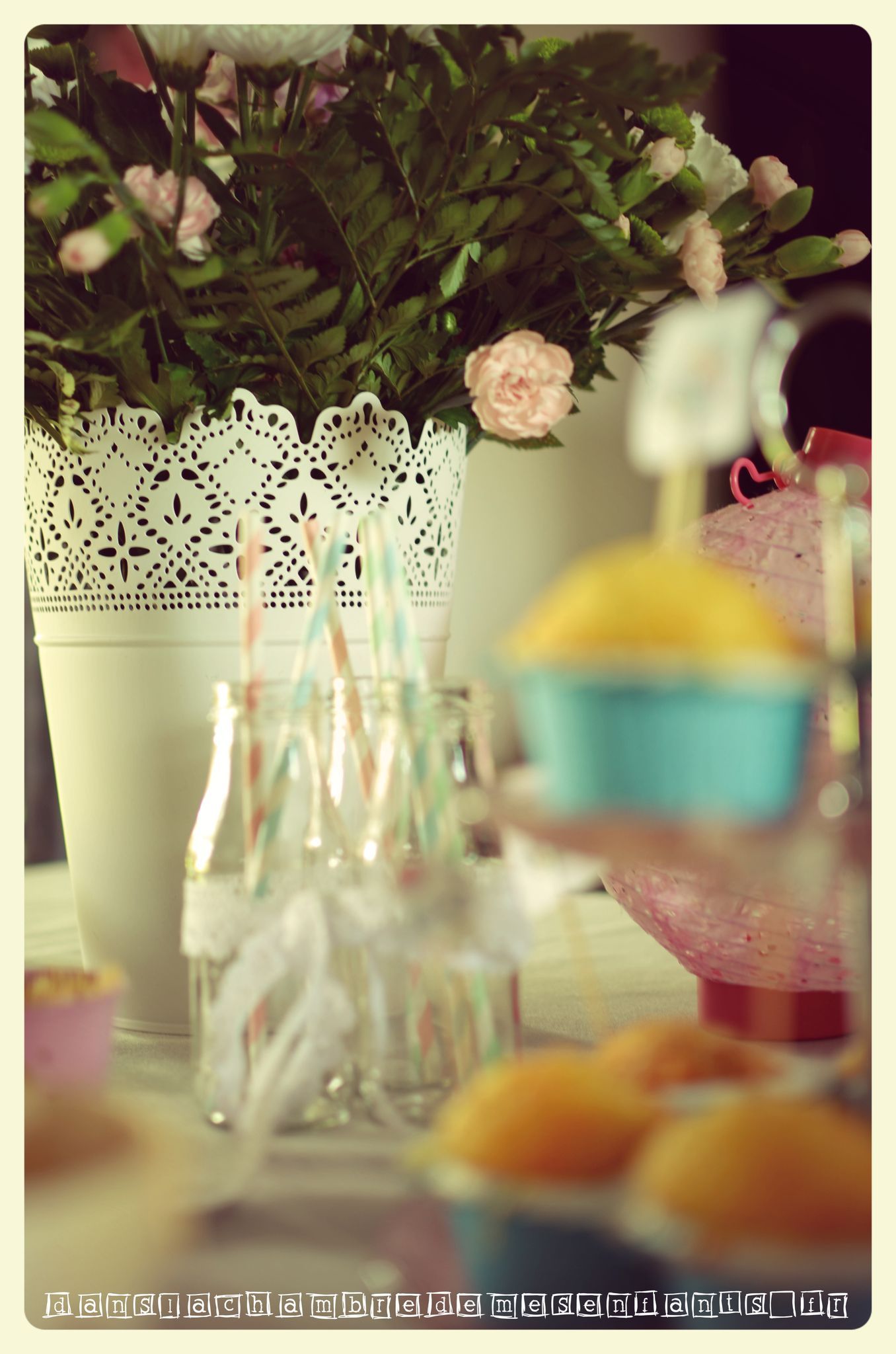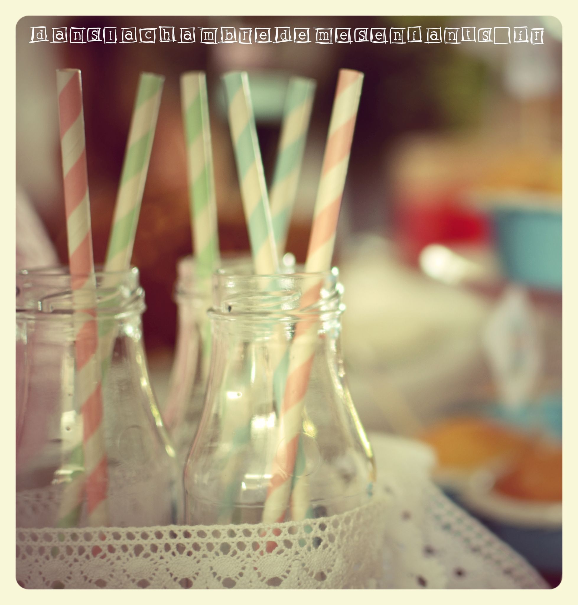 - des bouteilles en verre, plus petites, rassemblées par un ruban de dentelle et avec des pailles en papier aux couleurs pastel