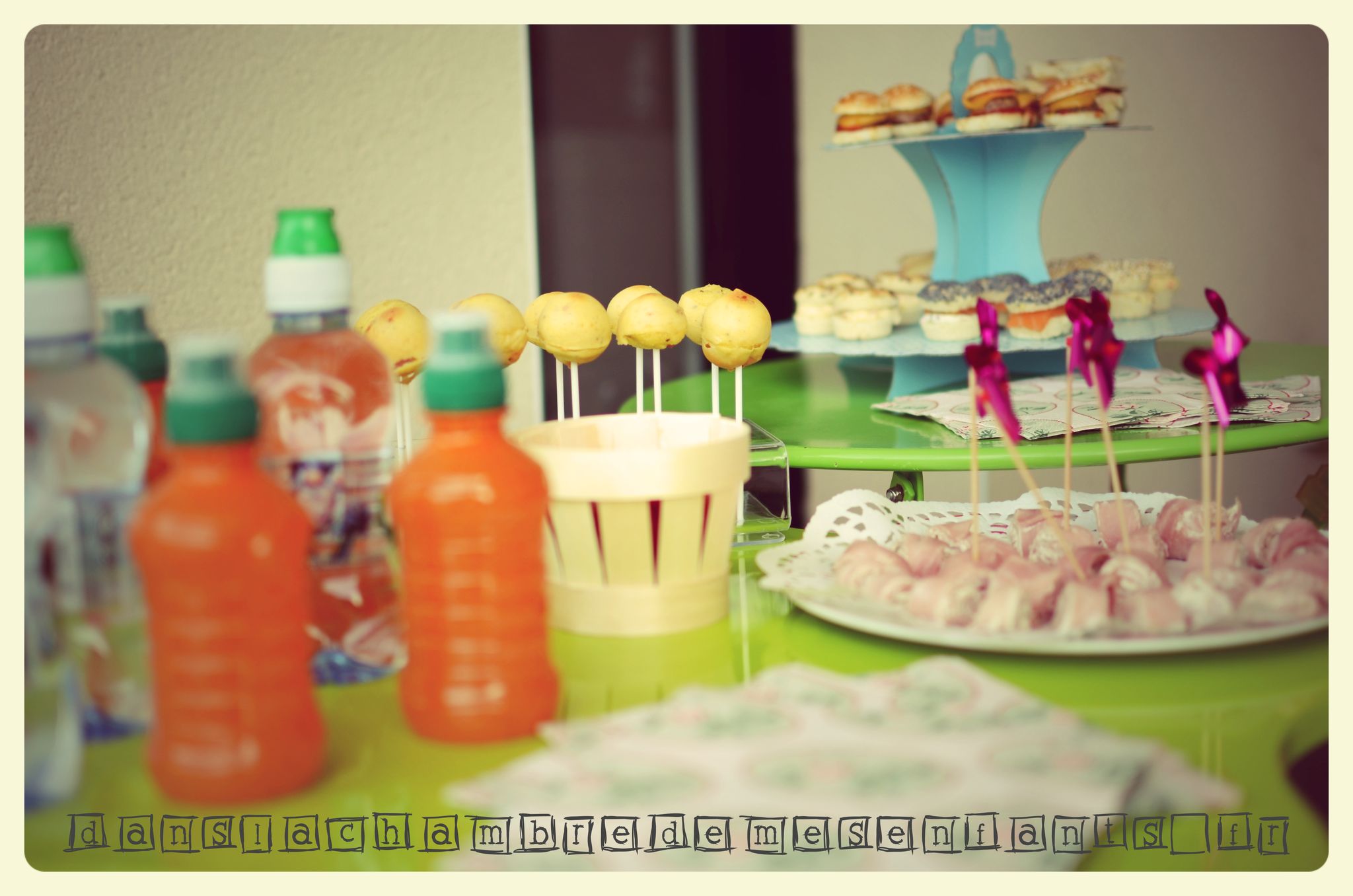 - la table des enfants en extérieur avec des petits fours amusants (comme les mini hamburgers ou un cake transformés en pop-cakes) décorés par des moulins à vent (rayon apéritif)