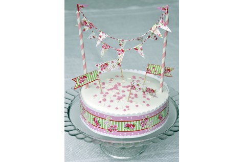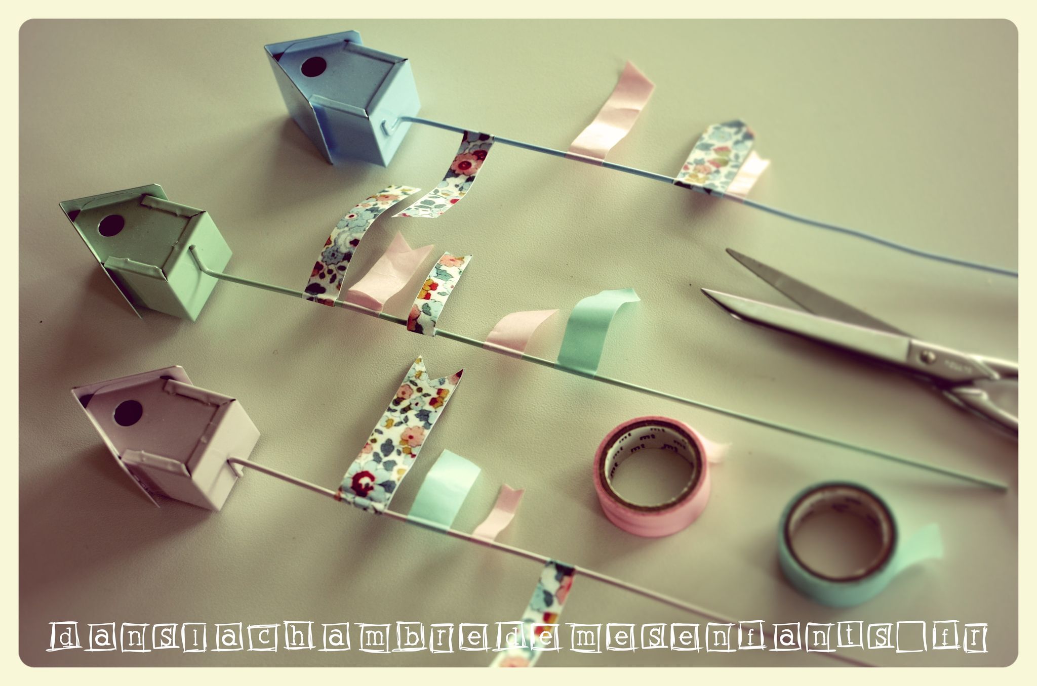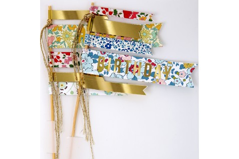 Pour personnaliser facilement, j’ai imprimer des larges zones Liberty (à partir des images des merceries en ligne) et j’ai découpé des formes : en forme d’oiseau (que j’ai dessiné) pour transformer les pics flamants roses, pour faire des drapeaux Liberty aux tuteurs, aux pics des petits fours (ex : coller deux disques l’un à l’autre avec un cure-dent entre) et pour faire les bagues Liberty aux tubes à bulles. J’ai aussi pris du masking tape pastel (= ruban adhésif repositionnable) pour ajouter des drapeaux aux tuteurs.
