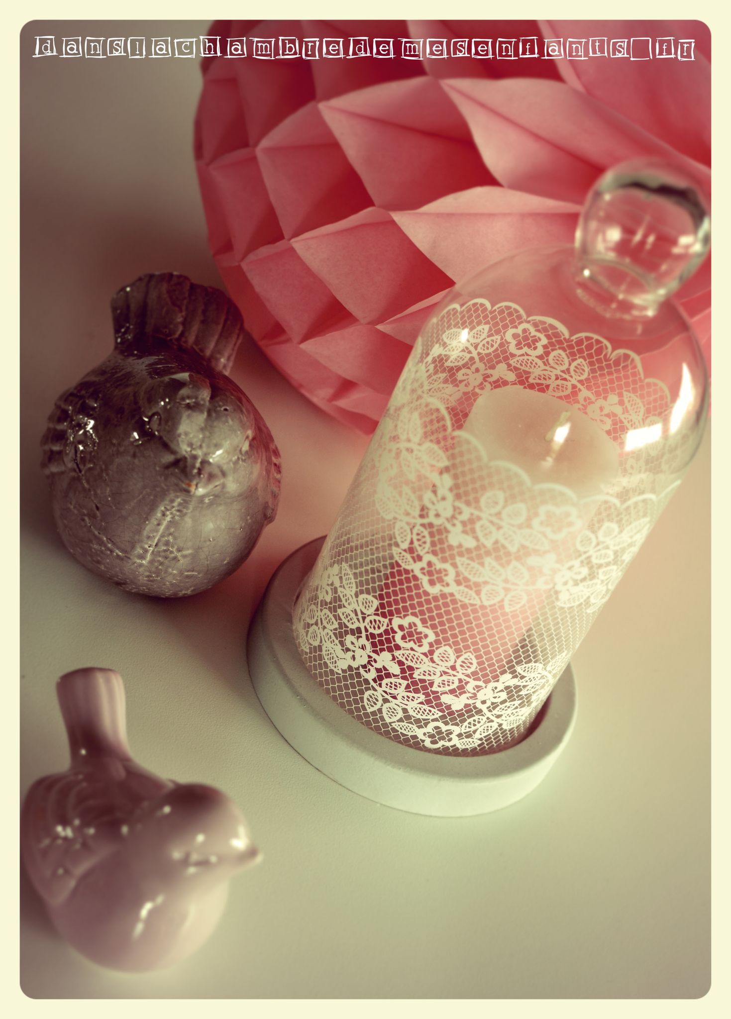 - une cloche en verre (ici avec un motif dentelle) renfermant une bougie rose (en dégradé)