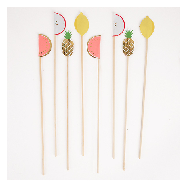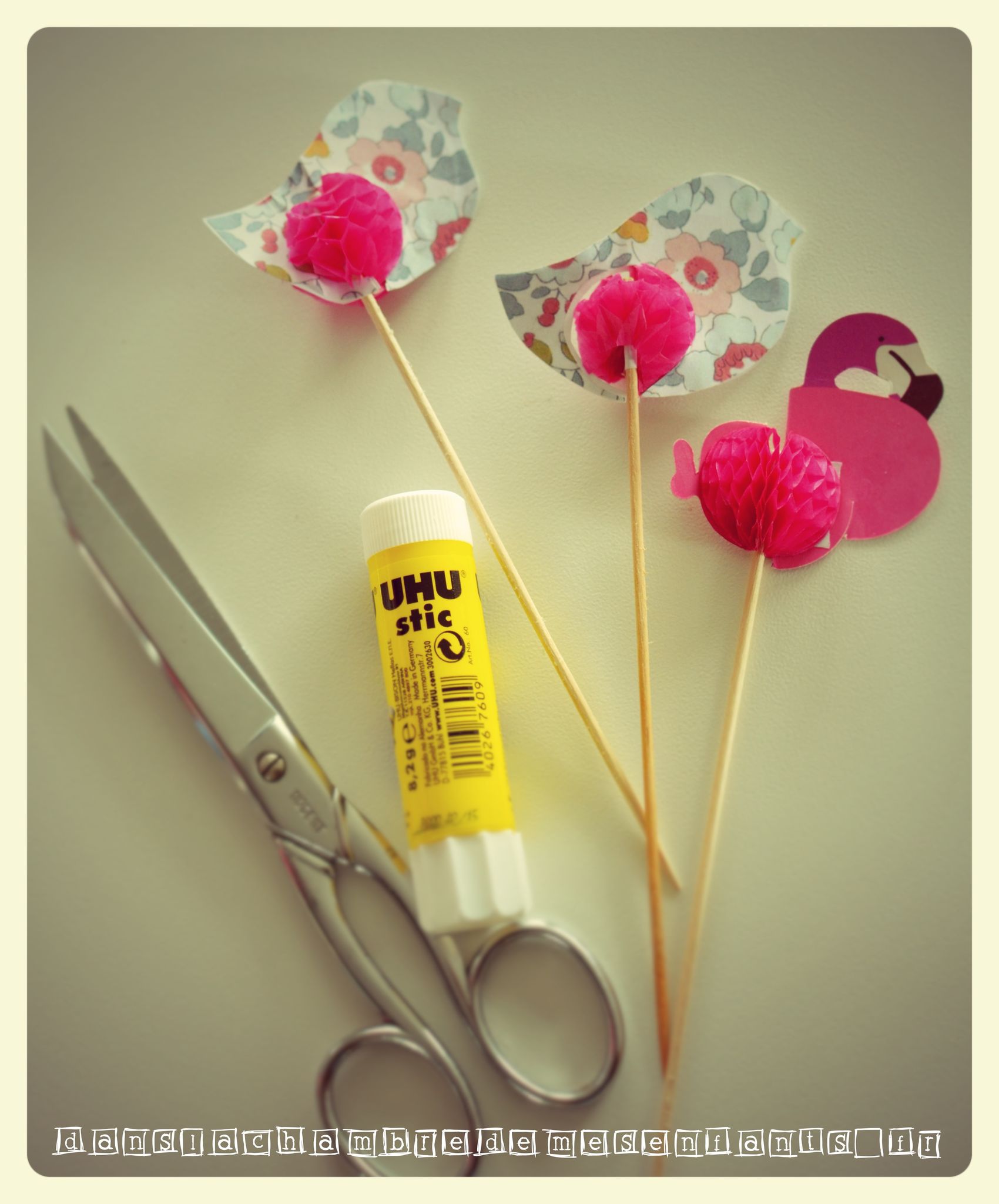 - des pics apéritifs à soufflets (normalement des flamants roses) ont été transformés en oiseaux, conservant le dépliant sphérique rose