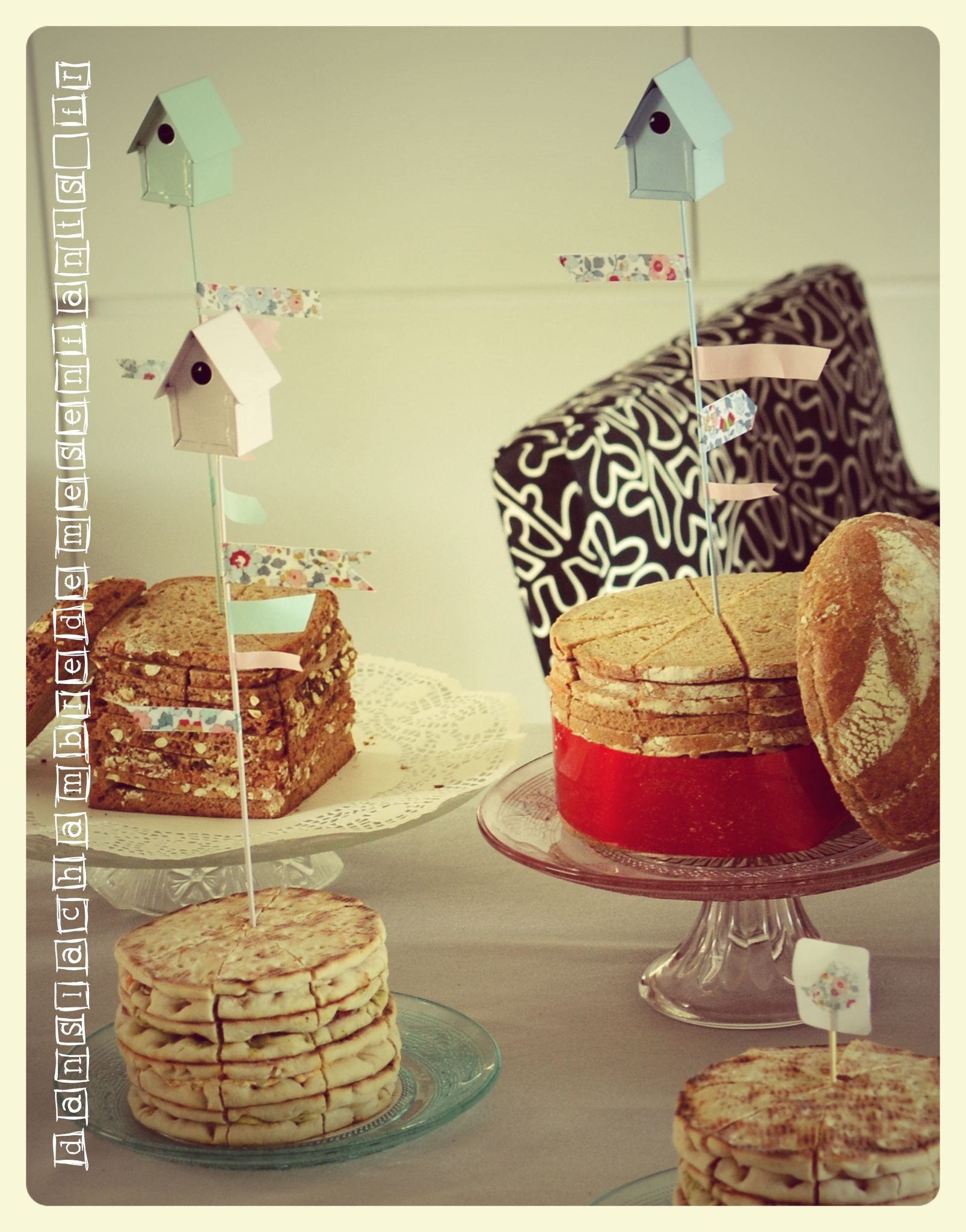 - des tuteurs métalliques avec maisonnettes (rayon jardin) ont servi de décoration aux pains surprises (agrémentés d’étiquettes Liberty)