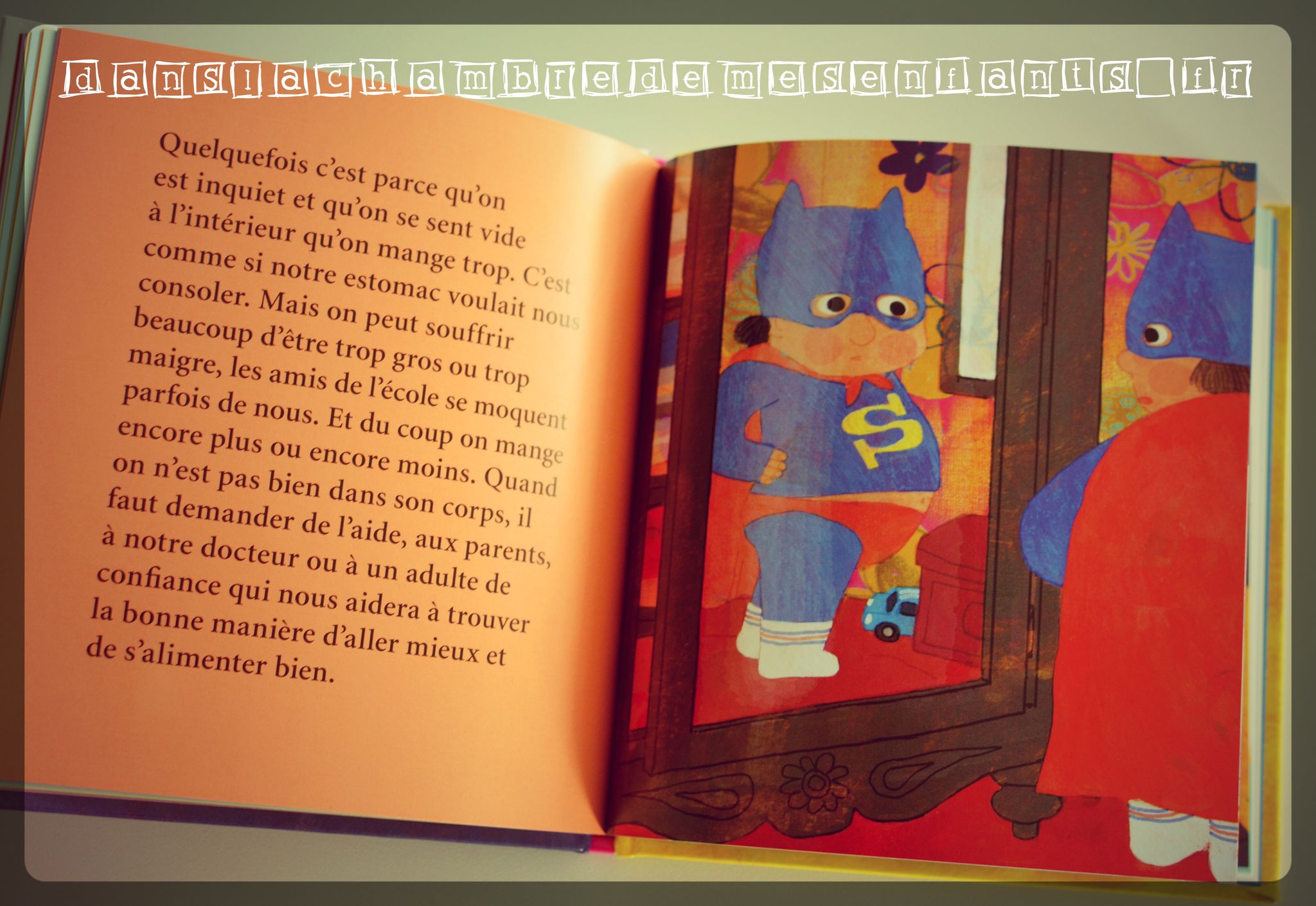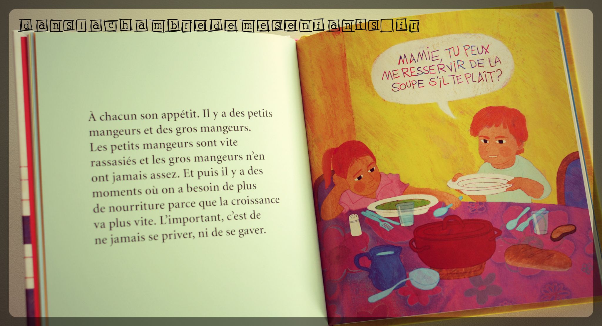 Les textes s’adressent tant aux adultes qu’aux enfants en fait et c’est donc une lecture commune qui rassemble autour d’un sujet. Je trouve, cependant, qu’elle est difficile d’accès à un enfant de façon autonome puisque certains mots ou notions ne sont pas si simples : aucun lexique n’y figure mais il s’agit surtout d’explications qui donnent la possibilité d’échanger donc, personnellement, j’imagine difficilement que cela puisse se faire sans accompagnement (ce qui facilite la communication). Les textes sont parfois longs car il n’est pas question de suivre une histoire mais d’aborder des sujets du quotidien. Avec nos enfants, à partir de 3 ans, nous nous identifions facilement et l’attention est ainsi vite captée.