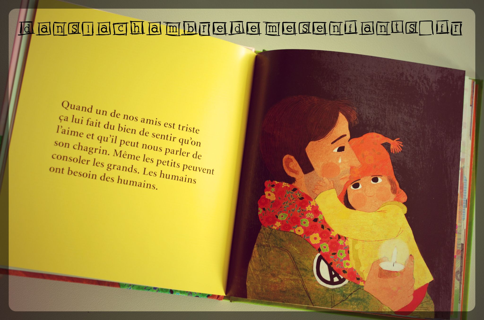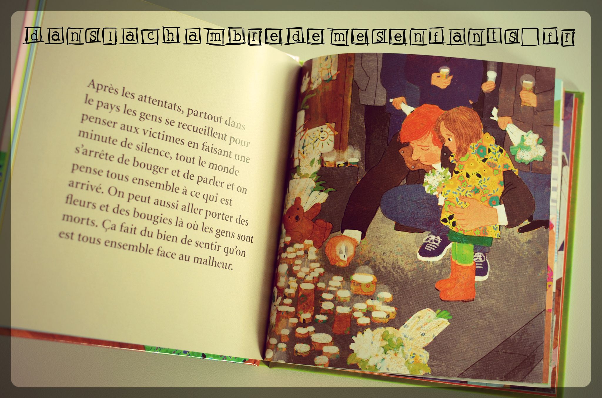 Ce livre traite d’un sujet assez vaste mais il n’oublie pas des points orientés par l’actualité avec notamment des passages sur les attentats : « Les terroristes ne supportent pas qu’on ne partage pas leurs idées. C’est pourquoi ils font des actions violentes comme les attentats. Ils veulent terroriser tout le monde. C’est très triste d’apprendre que des gens peuvent être tués comme ça et c’est très injuste ». Cela rappelle que les adultes comme les enfants peuvent avoir peur et de la peine. Pour se consoler, « Les humains ont besoin des humains ». L’individu fait partie d’un groupe et il est considéré dans le commentaire en expliquant la devise de la France : « Liberté, Egalité, Fraternité » à laquelle il y est ajouté qu’être sensible à la « beauté » (la musique, la fête…) rend meilleur.