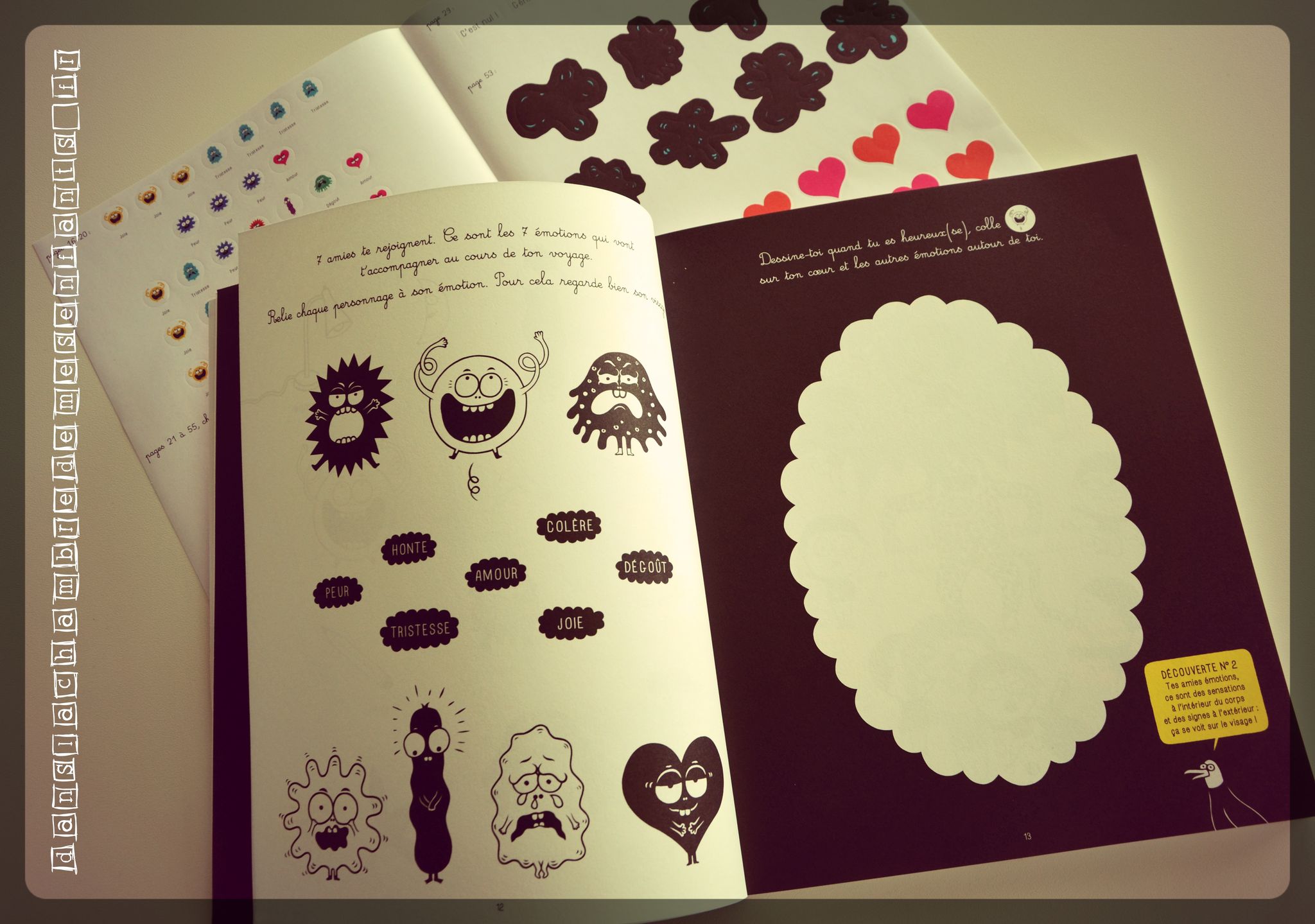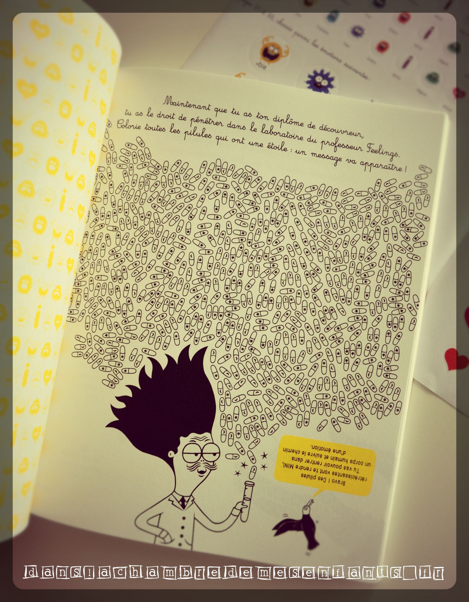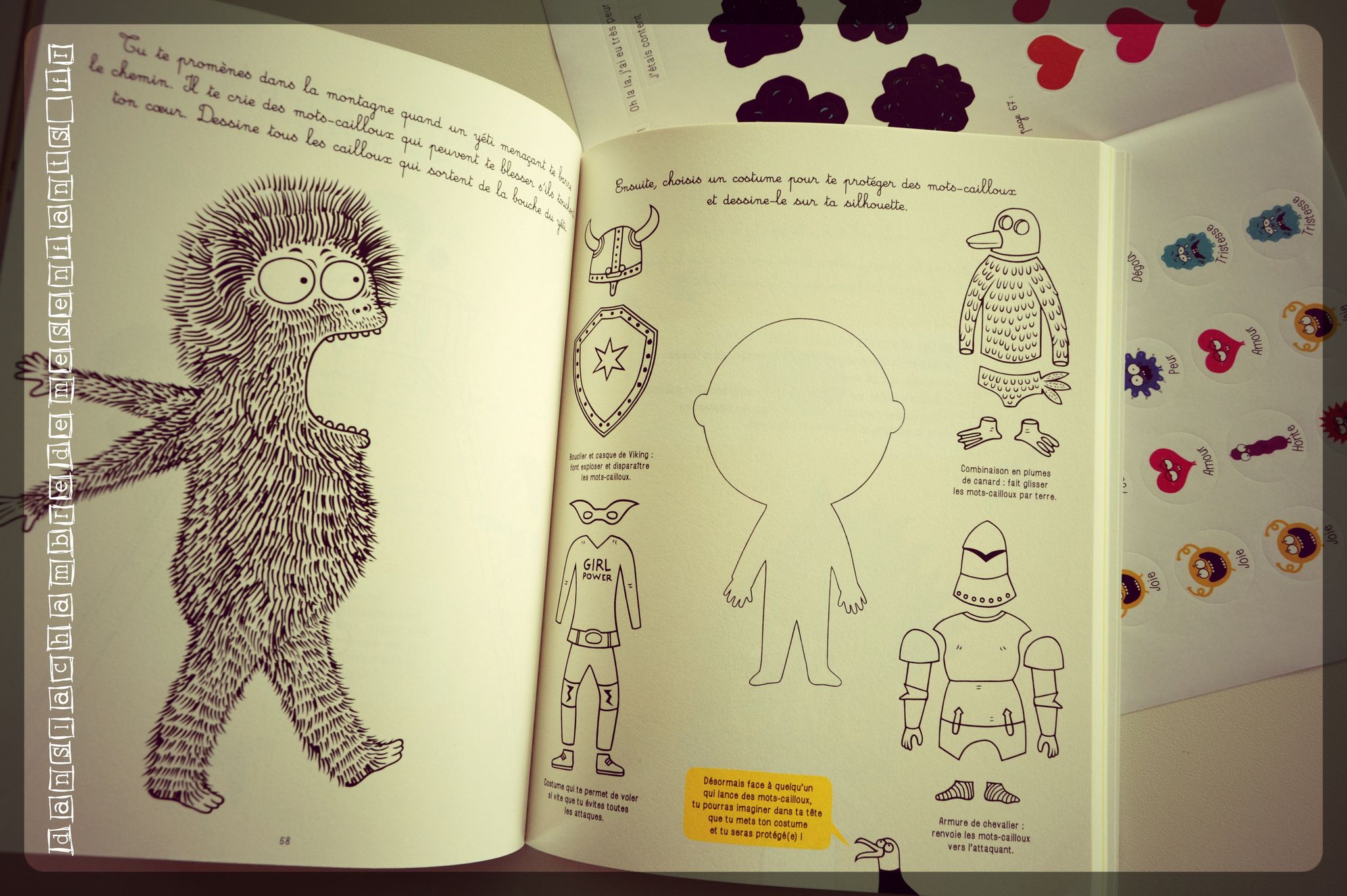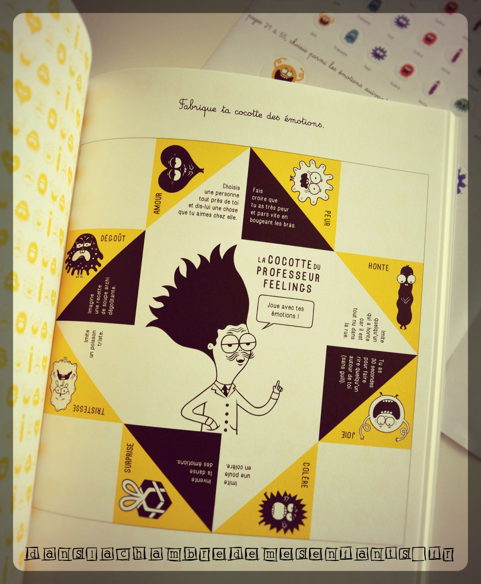 Côté format, il est grand, à reliure brochée, aux pages épaisses qui se détachent facilement, des illustrations modernes uniquement colorées par des touches de jaune (ménageons la sensibilité). Plus de couleurs seront apportées par le lecteur (alors acteur) à l’aide des stickers (émotions, cœurs…). Les activités sont courtes et simples, avec un texte s’adressant directement à l’enfant (ex : « Dessine-toi joyeux(se), triste ou en colère… et découpe ton portrait si tu veux » « Au cours de ton voyage, tu tombes nez à nez avec une panthère affamée. Tu décides de : 1/ lui sourire et lui offrir un chewing-gum 2/ T’enfuir en courant le plus vite possible […] Tu as choisi la réponse 1, 3, 7 ou 8 ? Dommage, la panthère vient de te manger ! […] »). Non, ce n’est pas conventionnel (comme nous en fait) et plein d’humour. Vous y trouverez aussi des petits ateliers comme les cartes à découper et à mettre dans les enveloppes (à découper) pour donner des petits mots doux à ceux que l’on aime, une roue, un loto et une cocotte des émotions… chacun trouvera l’outil qui lui parle le mieux.