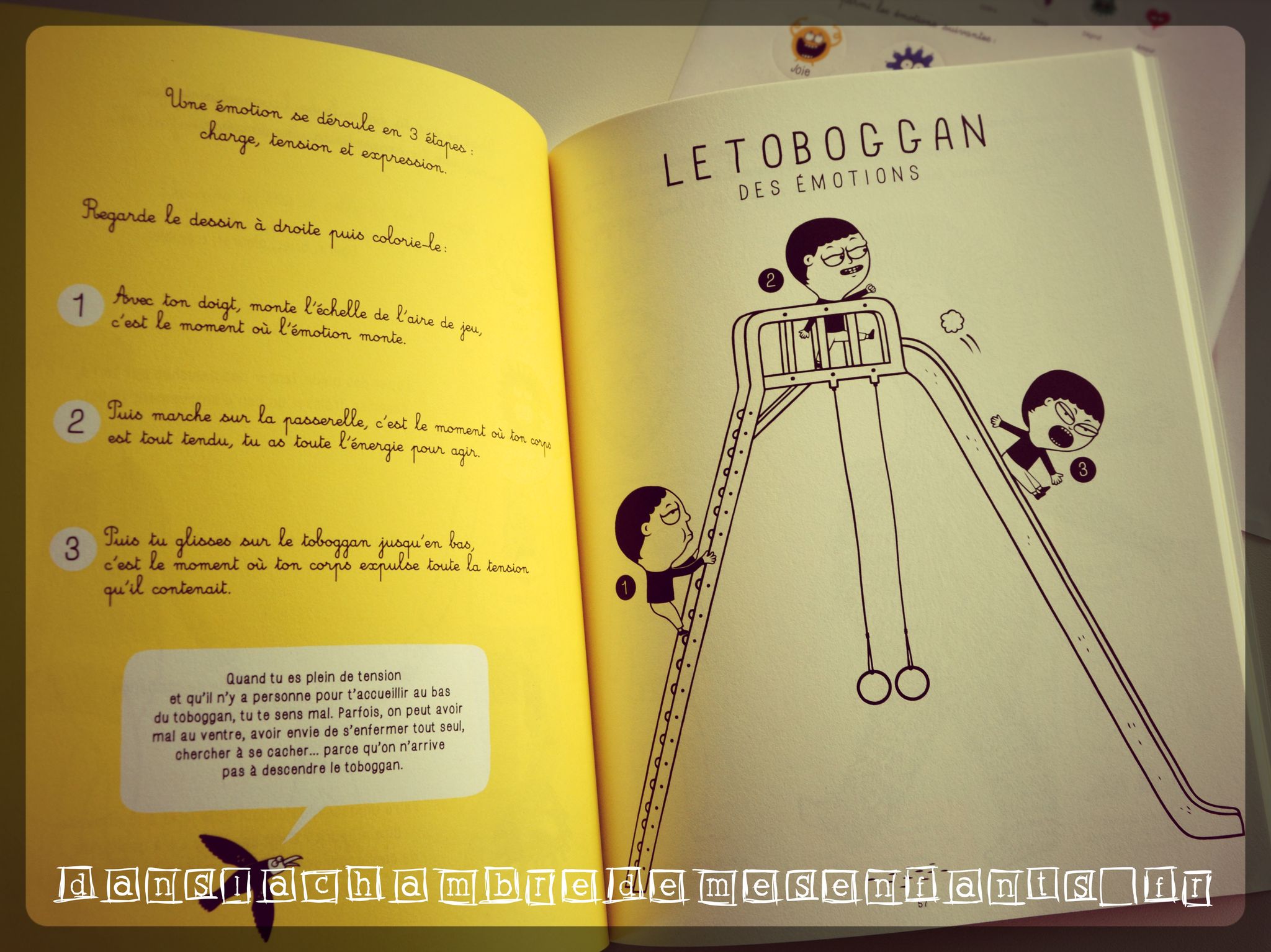 A la fin, figure un livret à détacher intitulé « Accompagner les émotions de votre enfant » qui se résume bien par la première phrase d’introduction « Les enfants ont une vie émotionnelle riche et souvent débordante de par leur cerveau en construction ». On y découvre notamment une petite présentation des ateliers de l’ouvrage, afin de comprendre la démarche des jeux comme la roue des émotions.