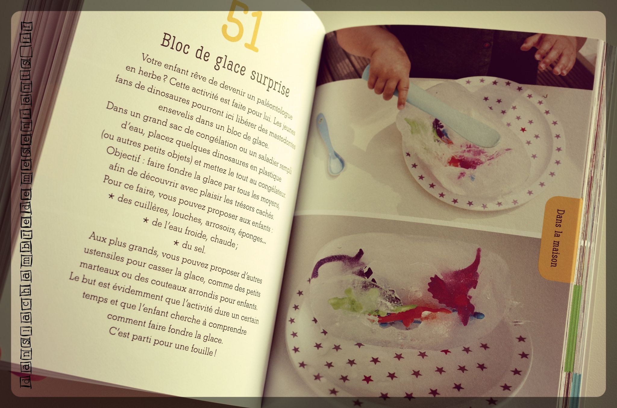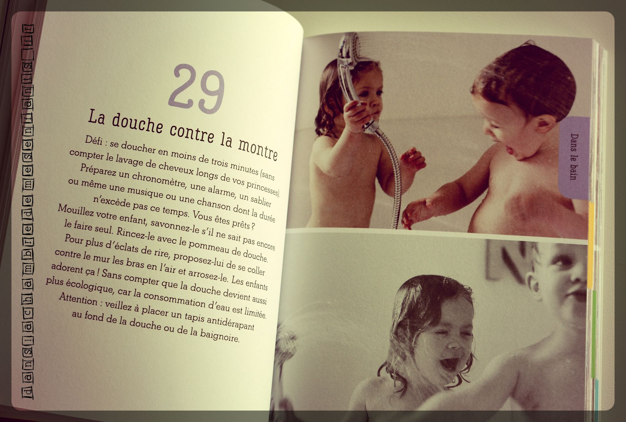 Il ne faut pas le voir comme un planning d’activités auquel on ne pourra se tenir, restant frustré de ne pas avoir réalisé les expériences, mais plutôt d’un livre de suggestions, réalisables à plusieurs âges, auxquelles on peut répondre lorsque l’on se sent tenté. Bien sûr, je vous conseille de ne pas le ranger dans la bibliothèque (entre le roman étudié au collège et dont on n’a pas osé se séparer et le livre de cuisine jamais utilisé) mais de le garder à porter de main car il est plus diversifié que vous pouvez l’imaginer. Quelque soit la météo ou le nombre de personnes à occuper, on y retrouve des activités sympas comme faire de la musique avec un remplissage différent de bouteilles ou, tout simplement, jouer à attraper l’eau dans le bain (avec un arrosoir pour la version plus écolo).