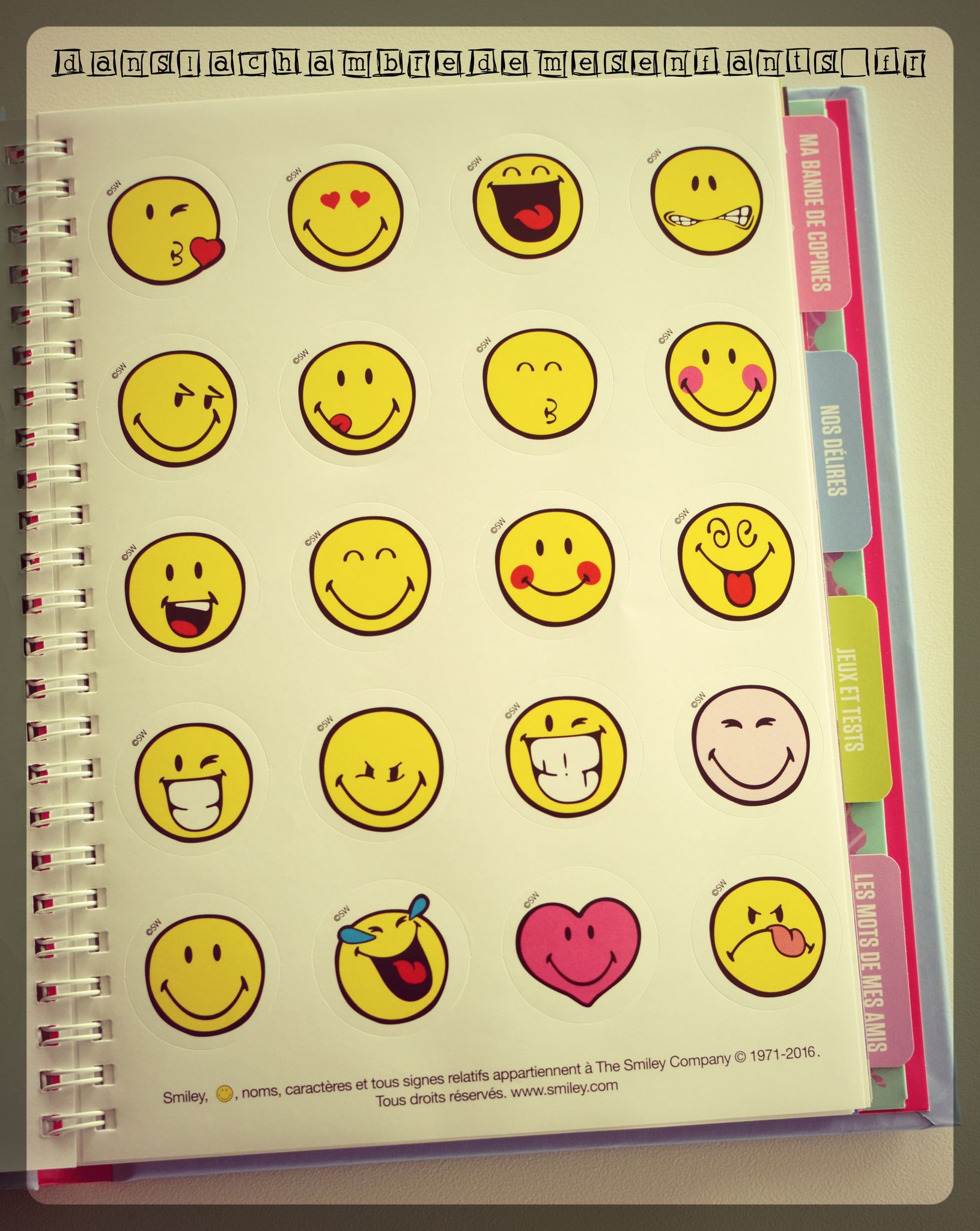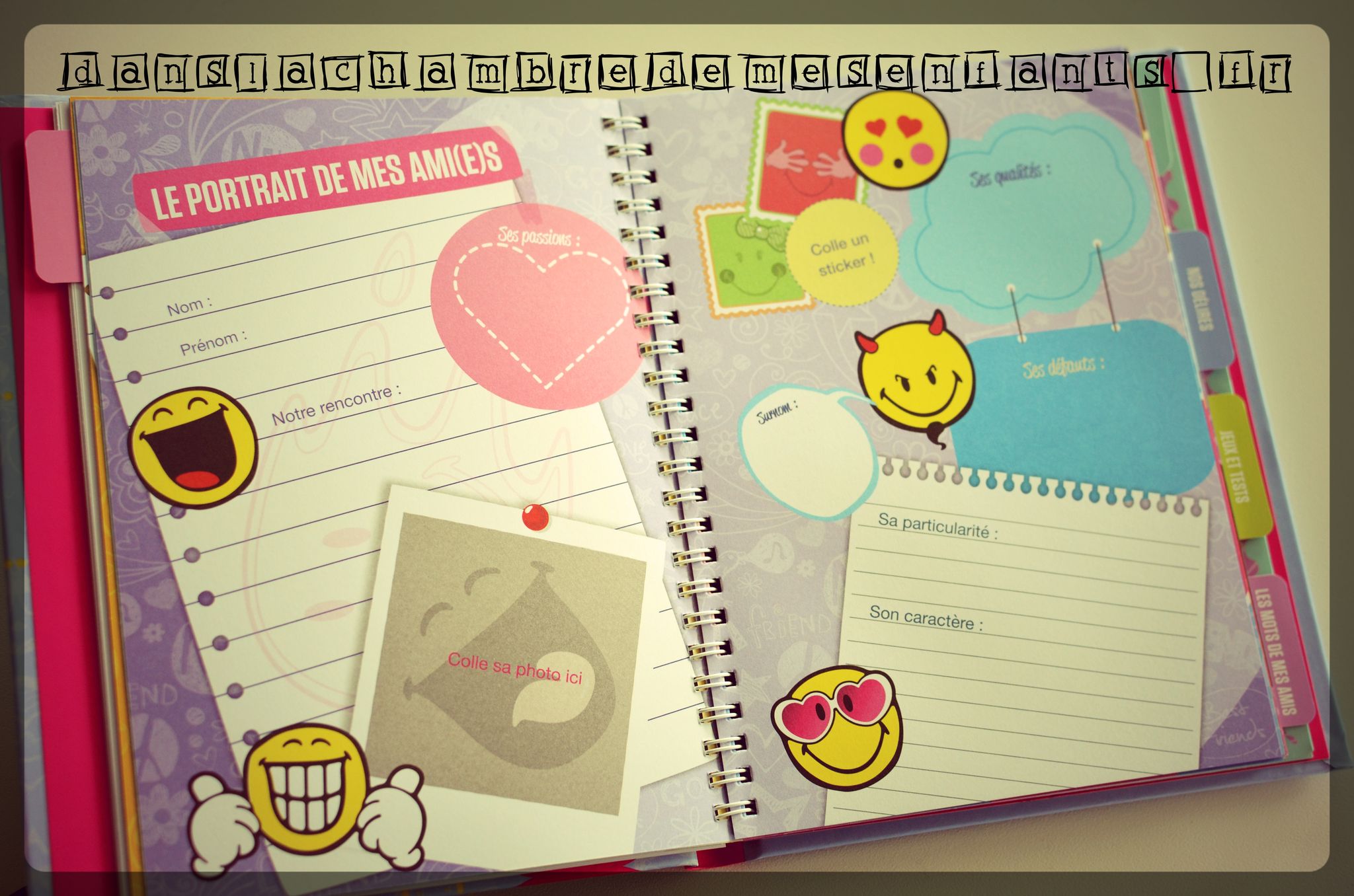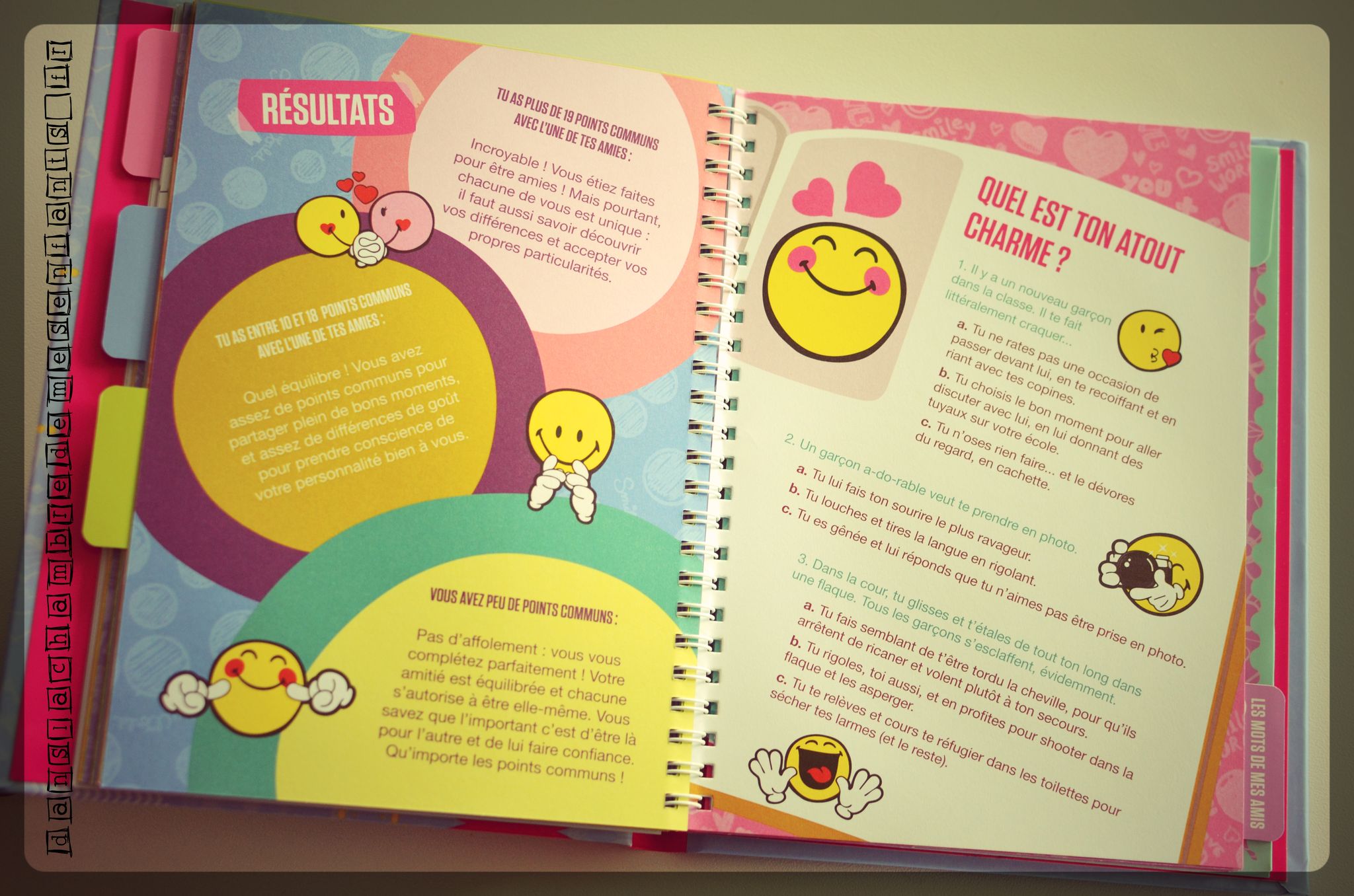 Il ressemble à un classeur avec sa jolie couverture décorée de smileys, munie d’un élastique, sa reliure à spirales et ses rubriques sous onglets (« Ma bande de copines », « Nos délires », « Jeux et tests », » Les mots de mes amis »). A la lecture de ces derniers, vous aurez compris qu’il ne s’agit pas d’un ouvrage inscrit au programme scolaire mais celui d’une fille de 8 ans, et plus, qui y parle de (et avec) ses cop’s ! Avec 6 pages de stickers (petits et grands smileys), elle peut illustrer les petits mots comme dans la rédaction d’un SMS.