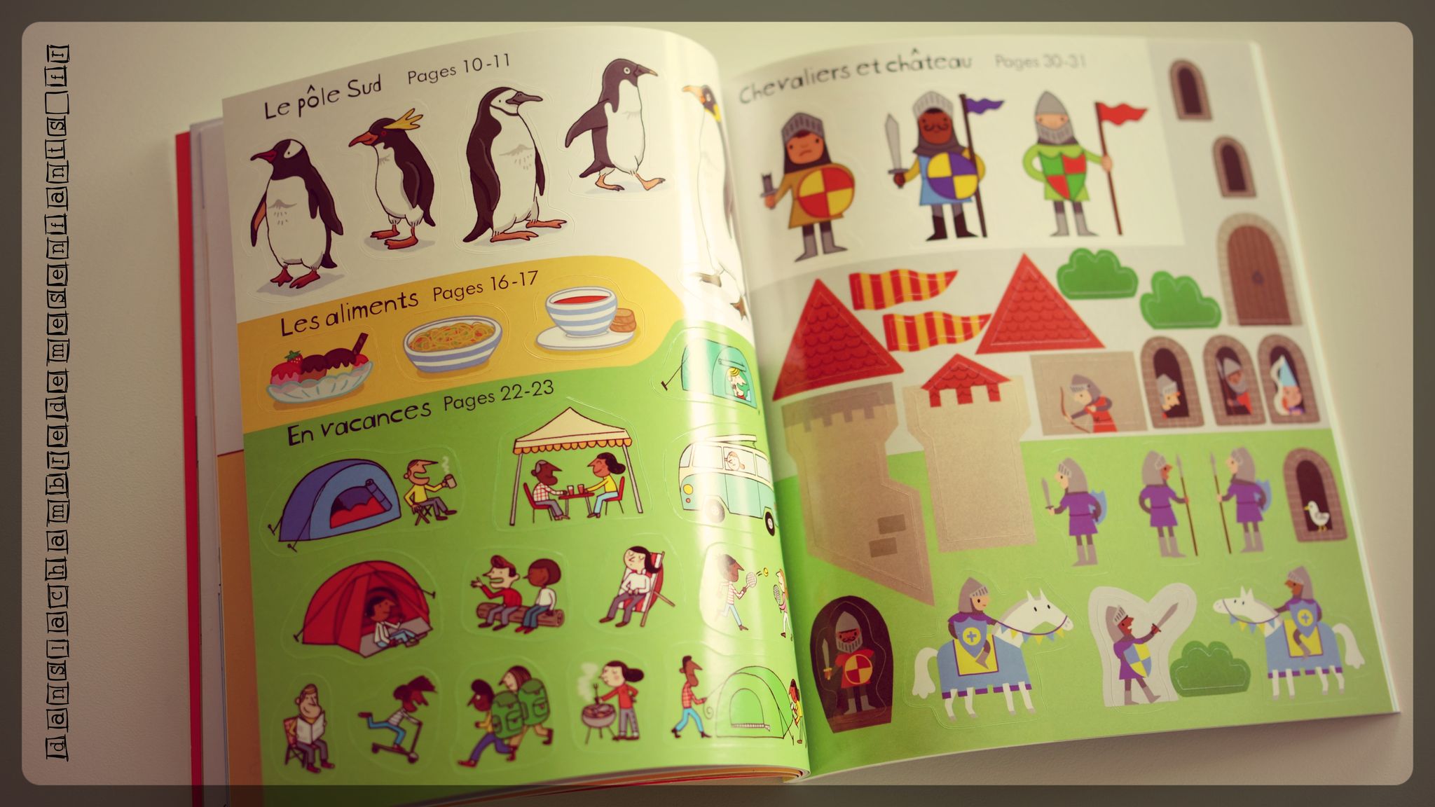 Ce cahier souple, de qualité, propose 8 pages de stickers à colorier comprenant des vêtements, accessoires et éléments de décoration des pages (ex : cœur, fleur…). Suit une double page pour expliquer simplement le mode d’emploi et un exemple de remplissage de chaque scène (en miniatures). Chaque scène (au nombre total de 21) occupe une page entière. Les stickers des scènes sont repérés sur les premières pages avec la pagination du décor : l’enfant les positionne et colorie l’ensemble, qui ne manque pas de détails (fleurs, monuments motifs, mouvements de tissus, cheveux…).