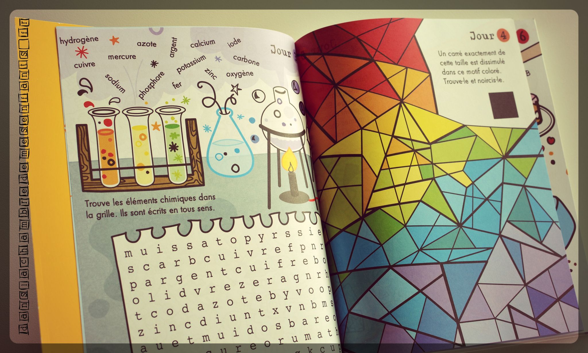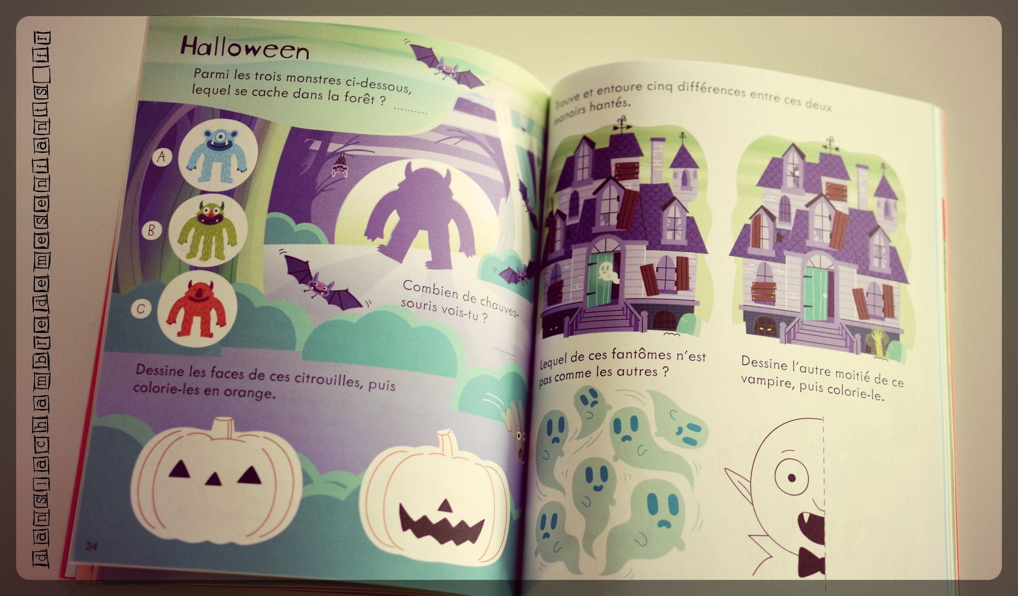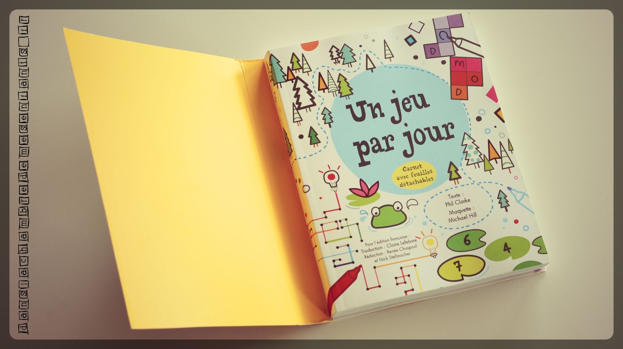Le format très pratique est identique et les illustrations dans le même style. Bien entendu, cette fois-ci, il est question d’un gros carnet de jeux pour les enfants, à partir de 7 ans. On y retrouve des jeux de labyrinthes, de logique, d’observation, d’écriture, de codification, de coloriage, de différences, de mots mêlés, croisés… Qu’il s’agisse de dessin, de chiffres ou de lettres, cet ouvrage déborde de jeux très variés mis en scène dans des univers différents (vacances, pâtisserie, décor marin, cahier d’école, paysage enneigé, espace, nature…).