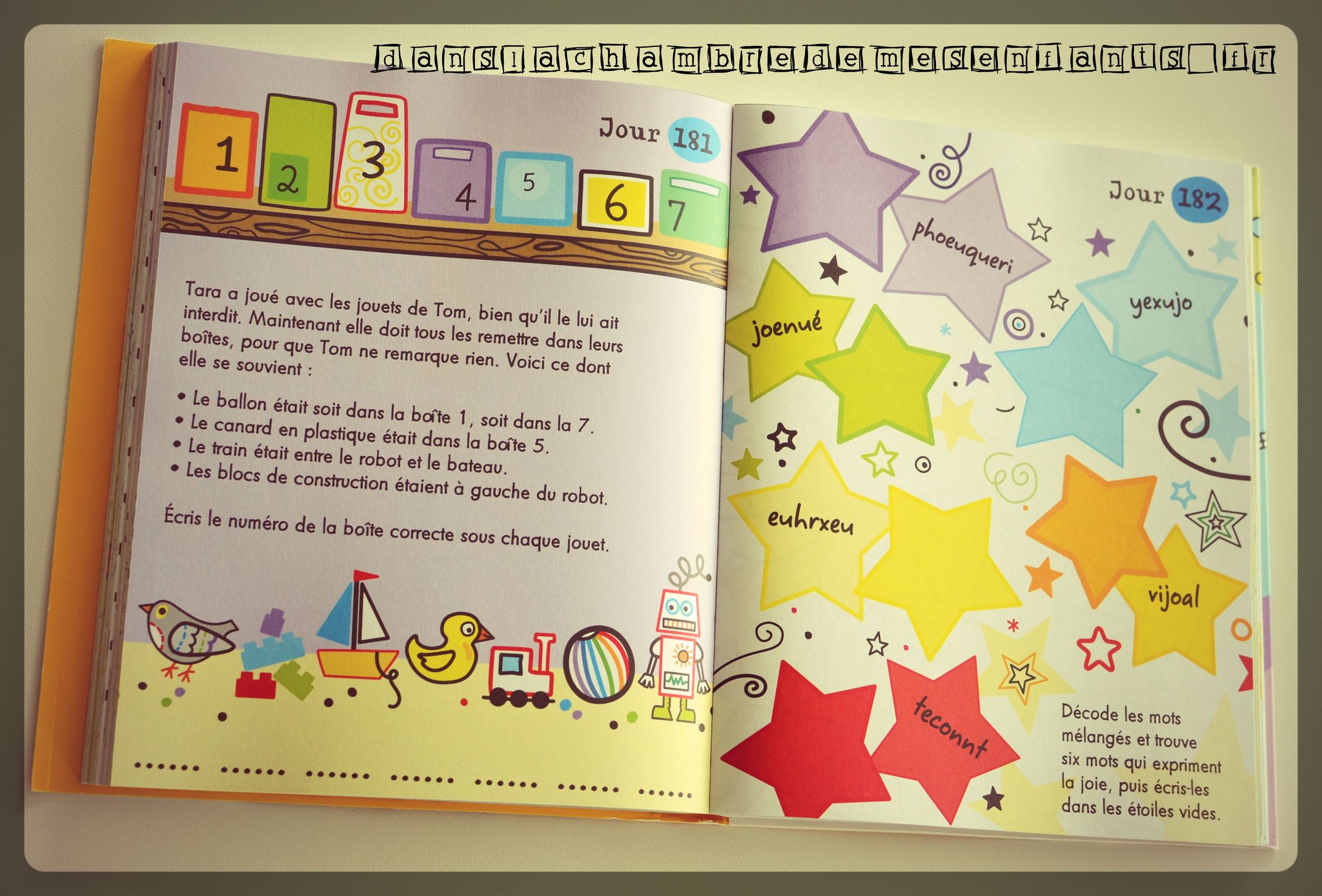 Un jeu par jour a été partagé entre Alex et Mélanie car ce livre ne dispose que d’un niveau. Grâce aux pages détachables, on a évité une dispute et ils se sont amusés, parfois réfléchis pendant quelques (longues) minutes pour trouver la solution ; ce qui plaît beaucoup à Mélanie. Elle n’a pas manqué d’aider son cousin qui n’a que 5,5 ans. C’est pour moi un indispensable qui suivra la famille un peu partout pendant les prochaines vacances car, avec 366 jeux, il en restera bien assez.