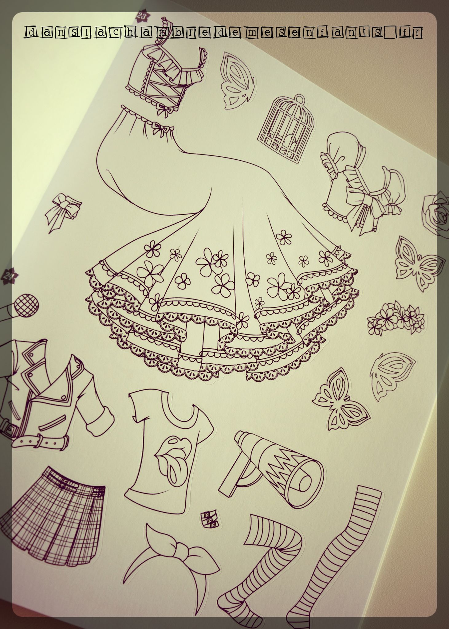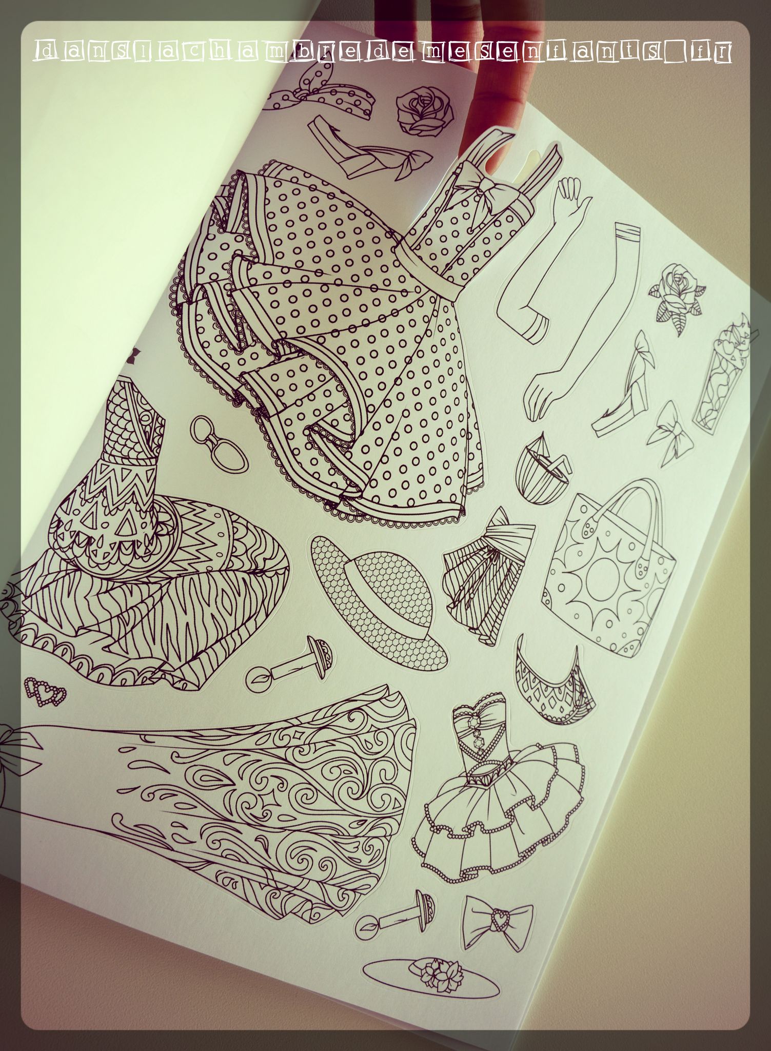 C’est une très belle réalisation qui rassemble un jeu de collage, du coloriage et l’univers de la mode. Il est attrayant et fait avec bon goût et détails intéressants. J’apprécie tout particulièrement le travail de l’illustratrice qui est excellent !
