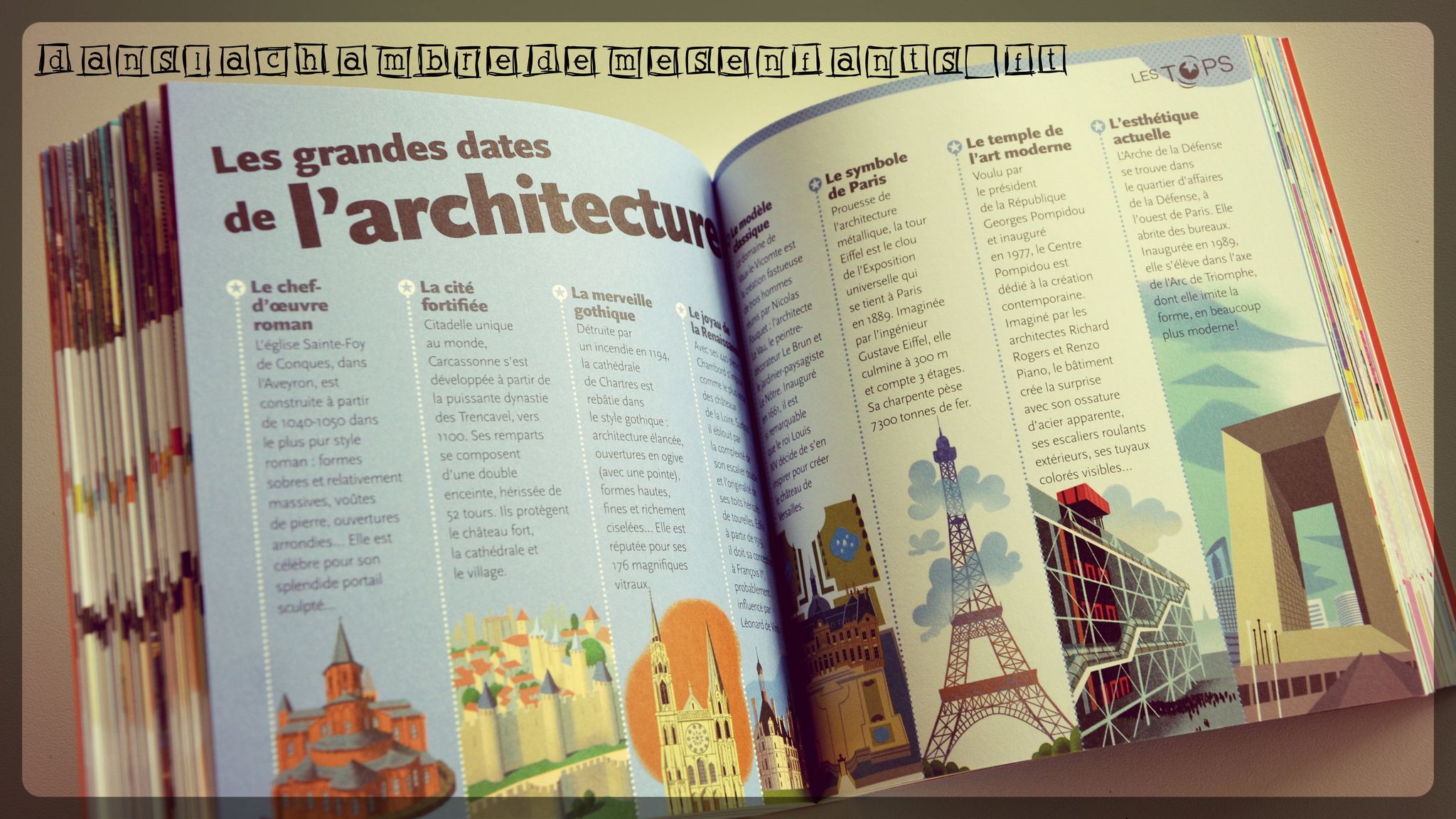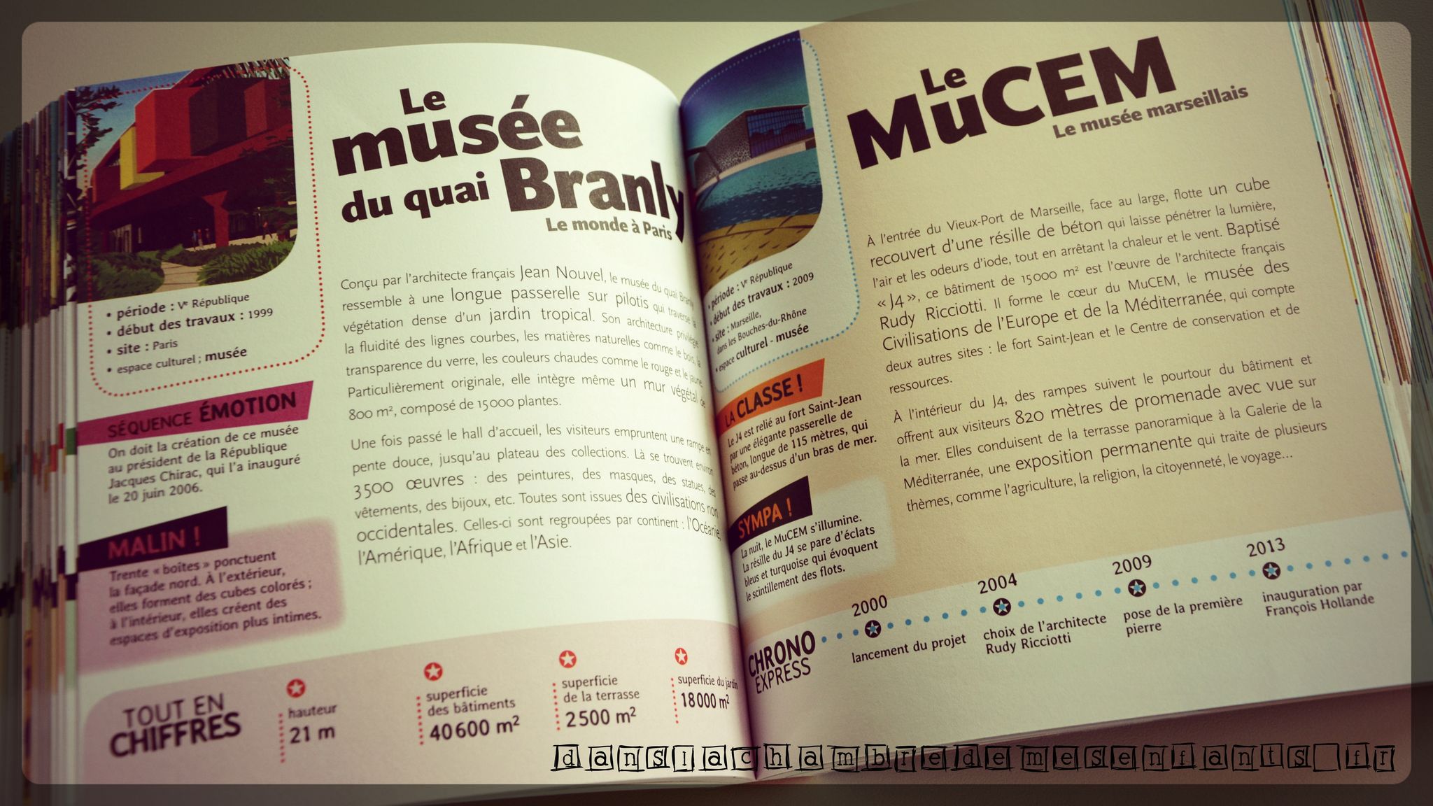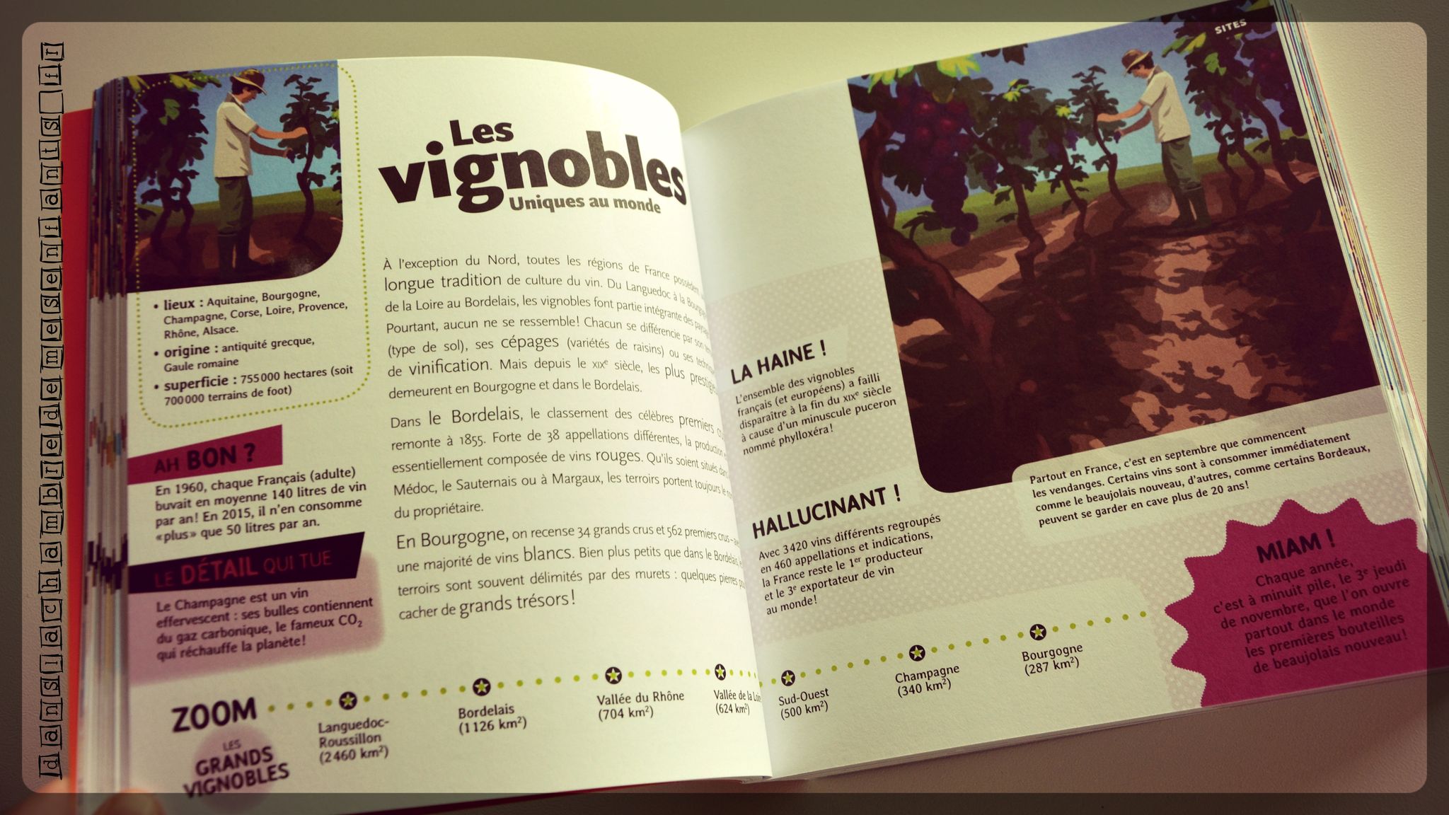Chaque présentation (régions, villes, monuments…) comprend des informations sommaires (situation, capitale, date d’édification, population…), un texte plus général, des informations étonnantes (ex : « Transporté par le vent, le sable de la dune du Pilat vient des Pyrénées… et du massif Central ! ») et une présentation brève en frise (ex : la région en 7 lieux, la chronologie des travaux d’édification ou d’un évènement…). Les textes sont succincts mais diversifiés et les illustrations restent très présentes. Ces dernières sont très figuratives et permettent de bien reconnaître les œuvres, les personnalités et les sites. Cette présentation allège réellement la lecture de l’ouvrage qui peut ainsi se feuilleter au gré des envies et, à tout le moins, se rendre plus abordable (à partir de 9 ans).