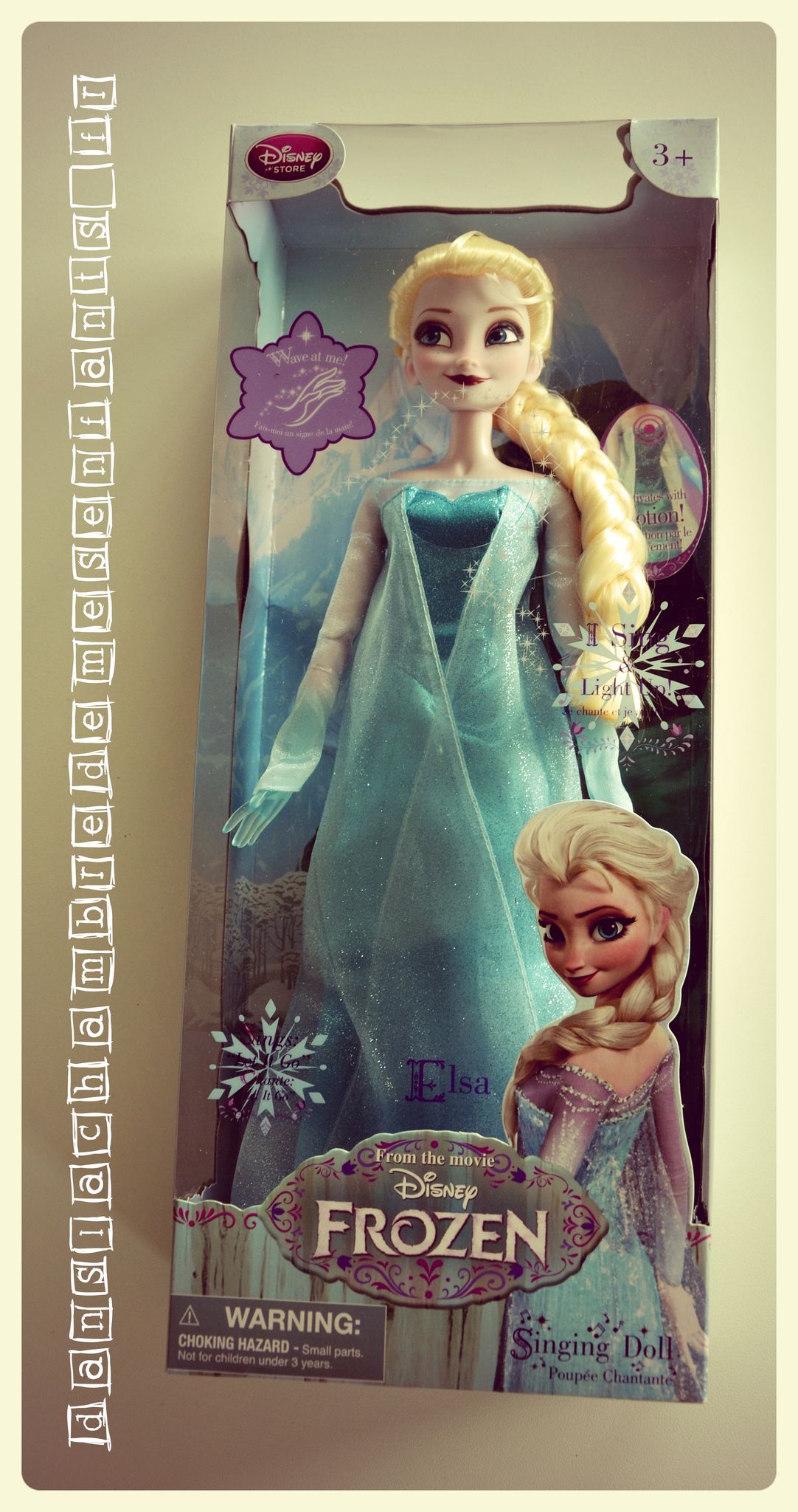 Pour la Reine des poupées, voici la figurine Elsa* à 12,00 € dont les mains s’éclairent lorsqu’elle est mise en mouvement et elle chante, avec un très bon son (sur la vidéo on l’entend bien alors qu’elle est dans son emballage), une partie de la chanson en anglais. Elle est grande et très fidèle à celle qu’admirent les petites filles. L’activation du son est assez sensible (vous n’avez pas fini de garder sa chanson en tête).